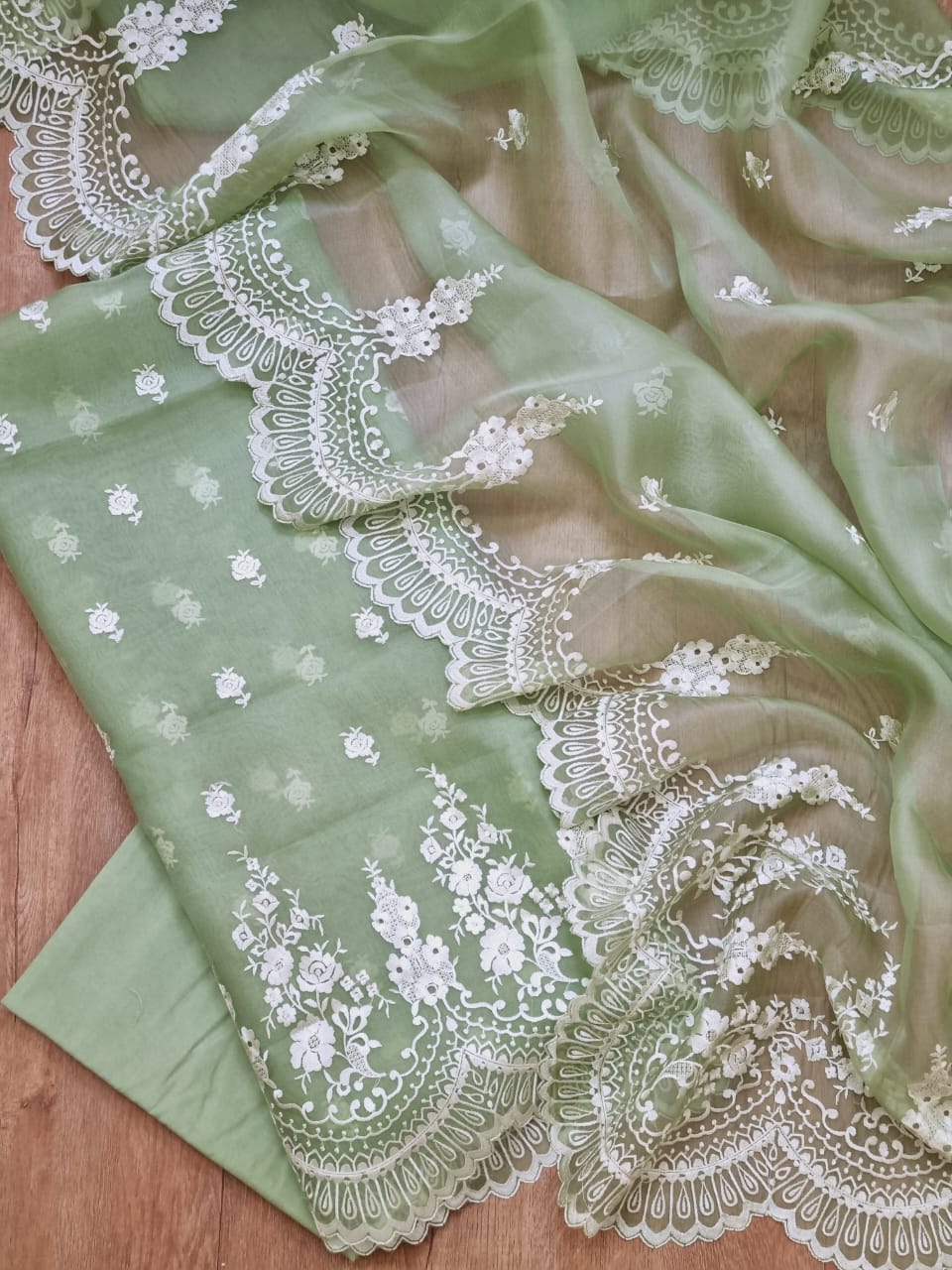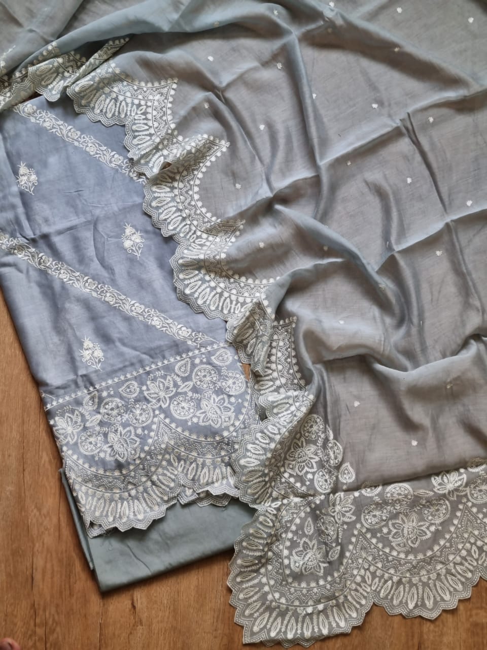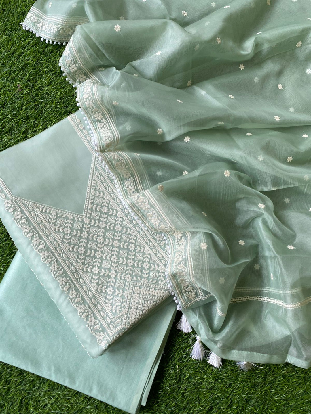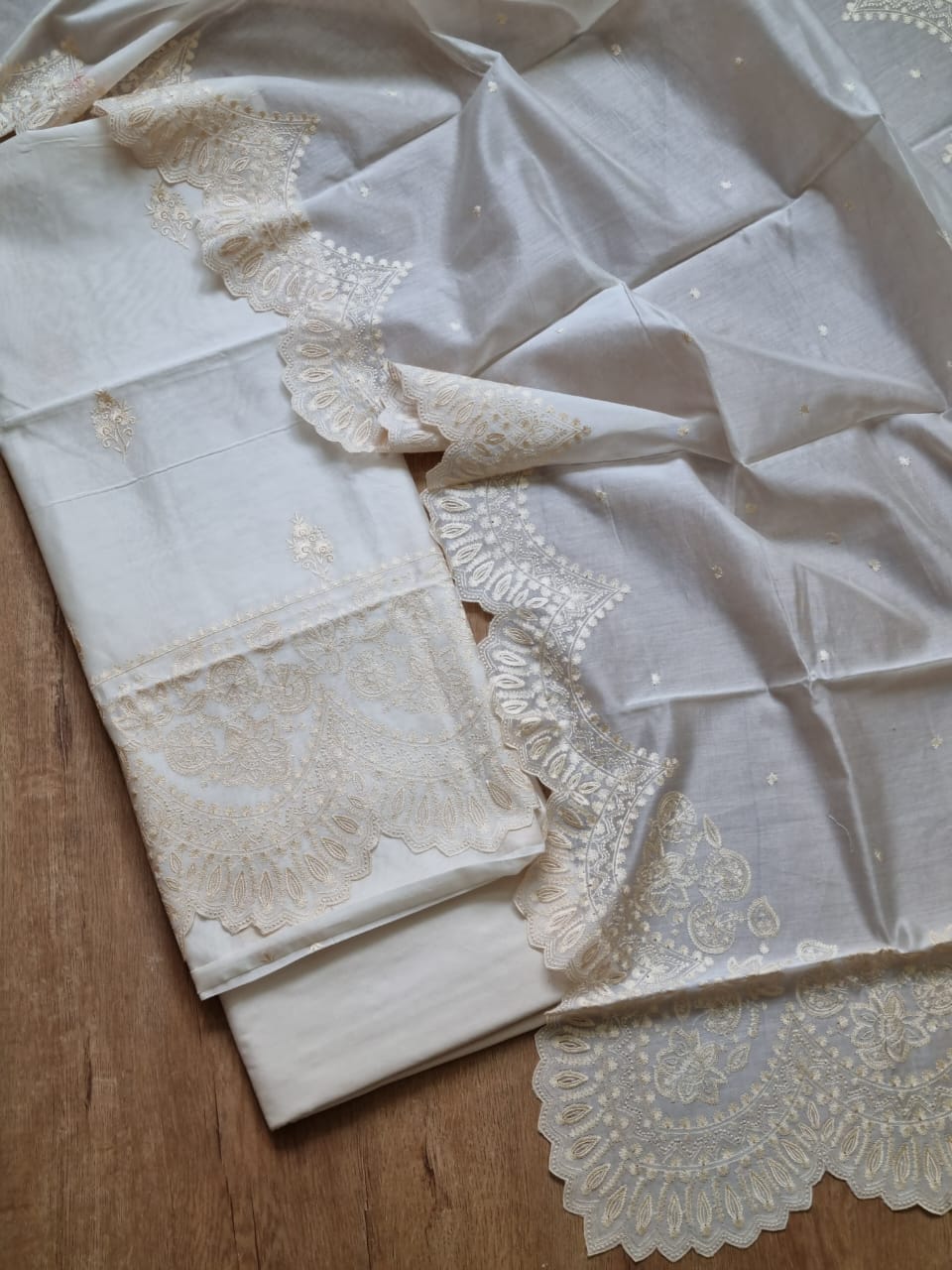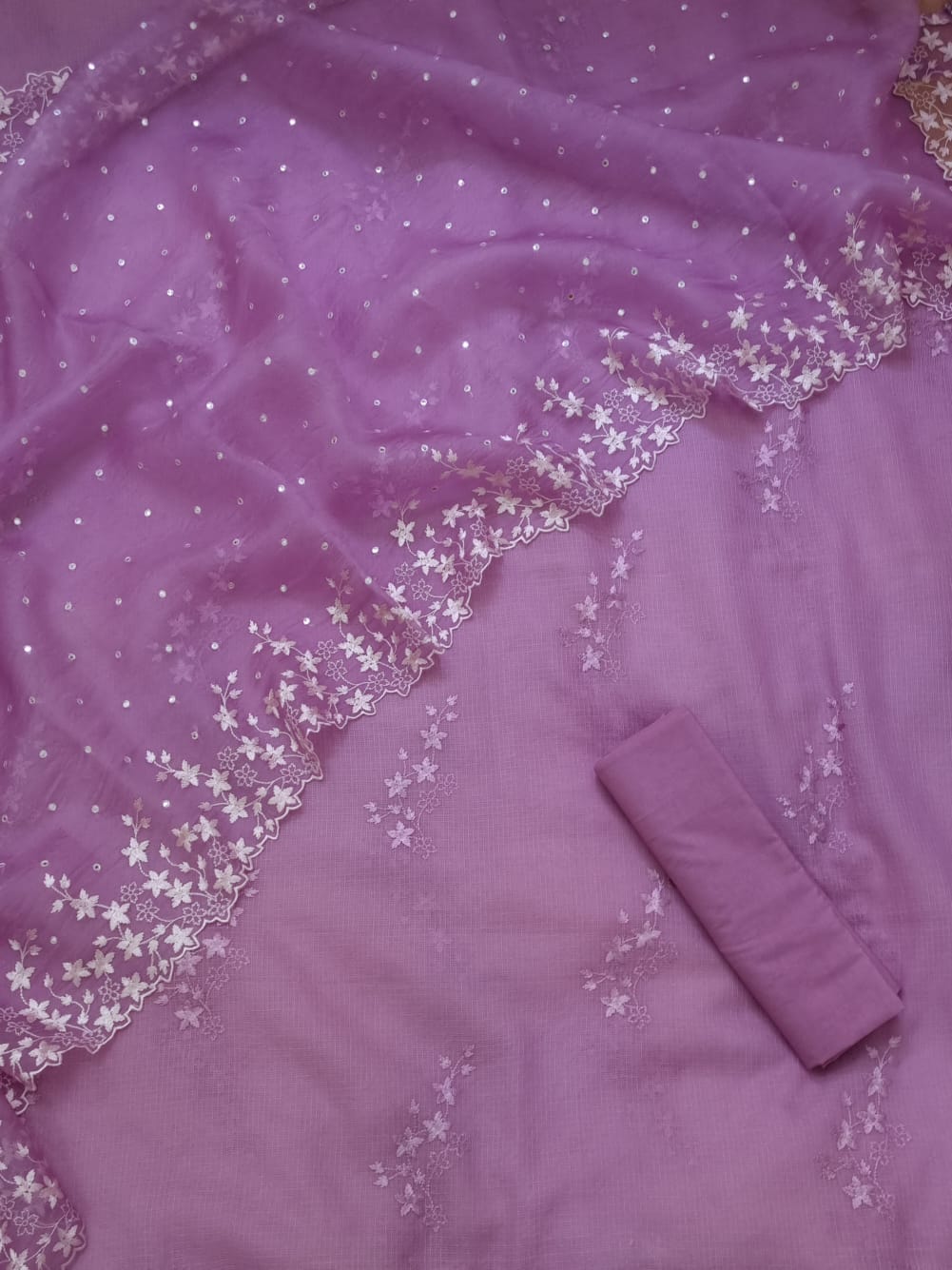 Each set comes with fabric for the kurta (top), bottom (salwar or pants), and dupatta.