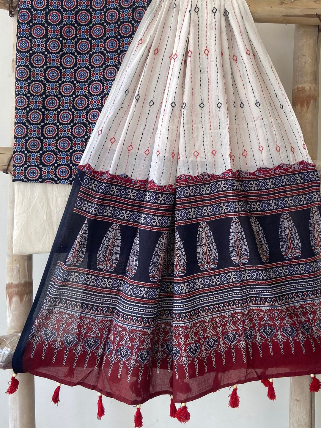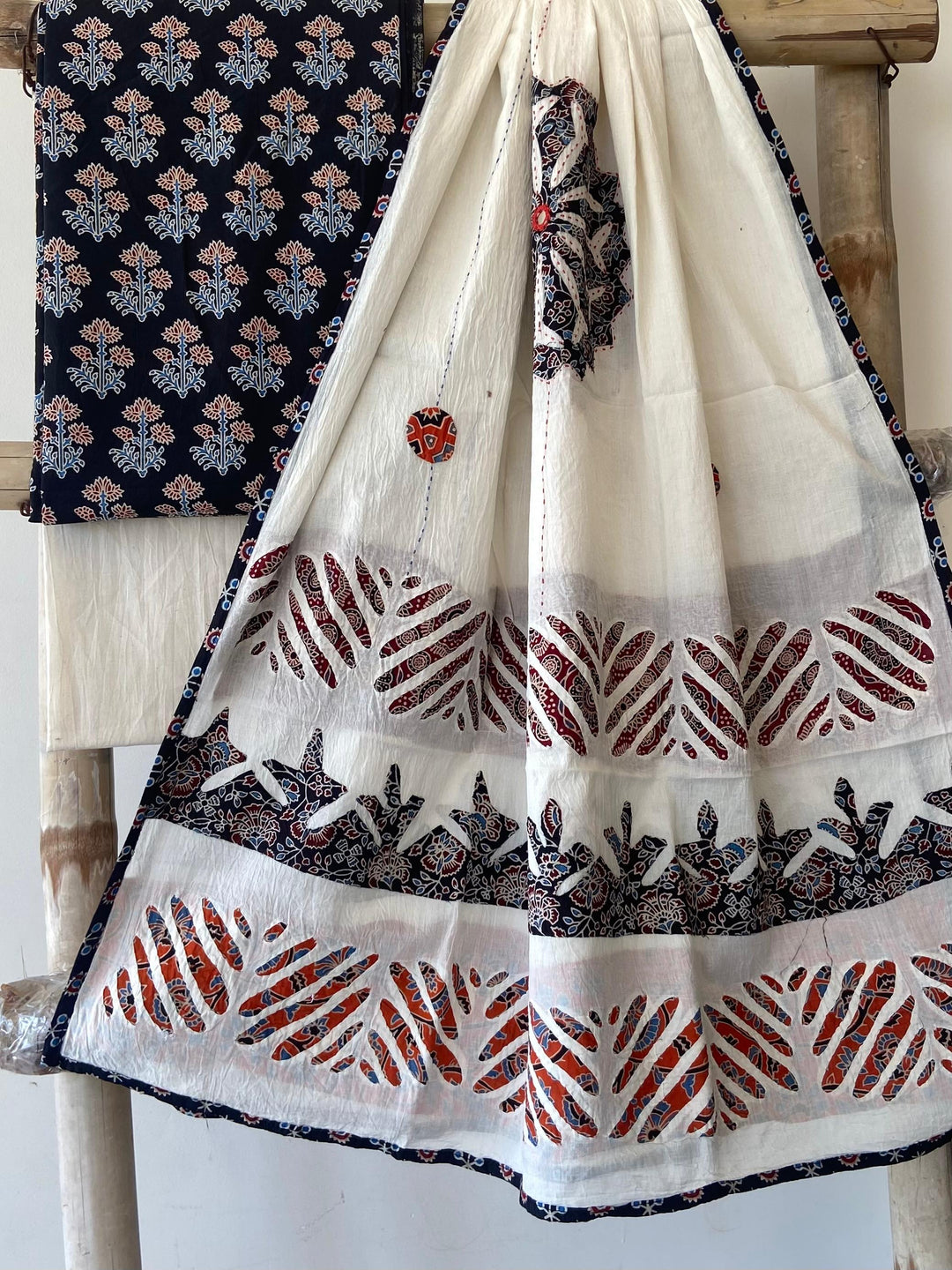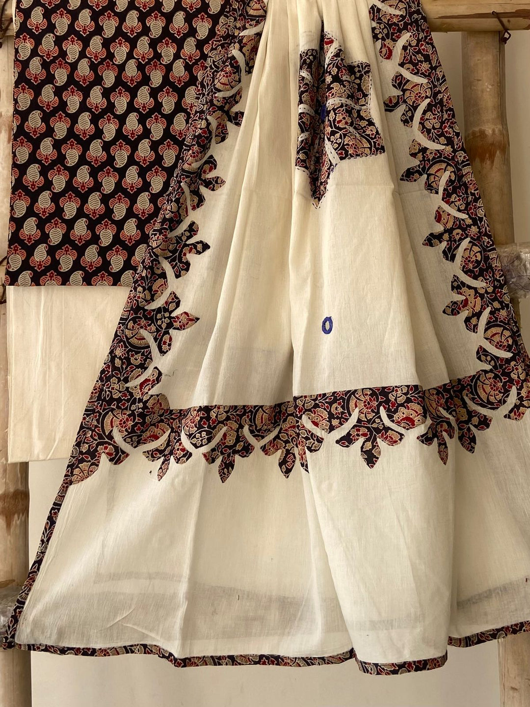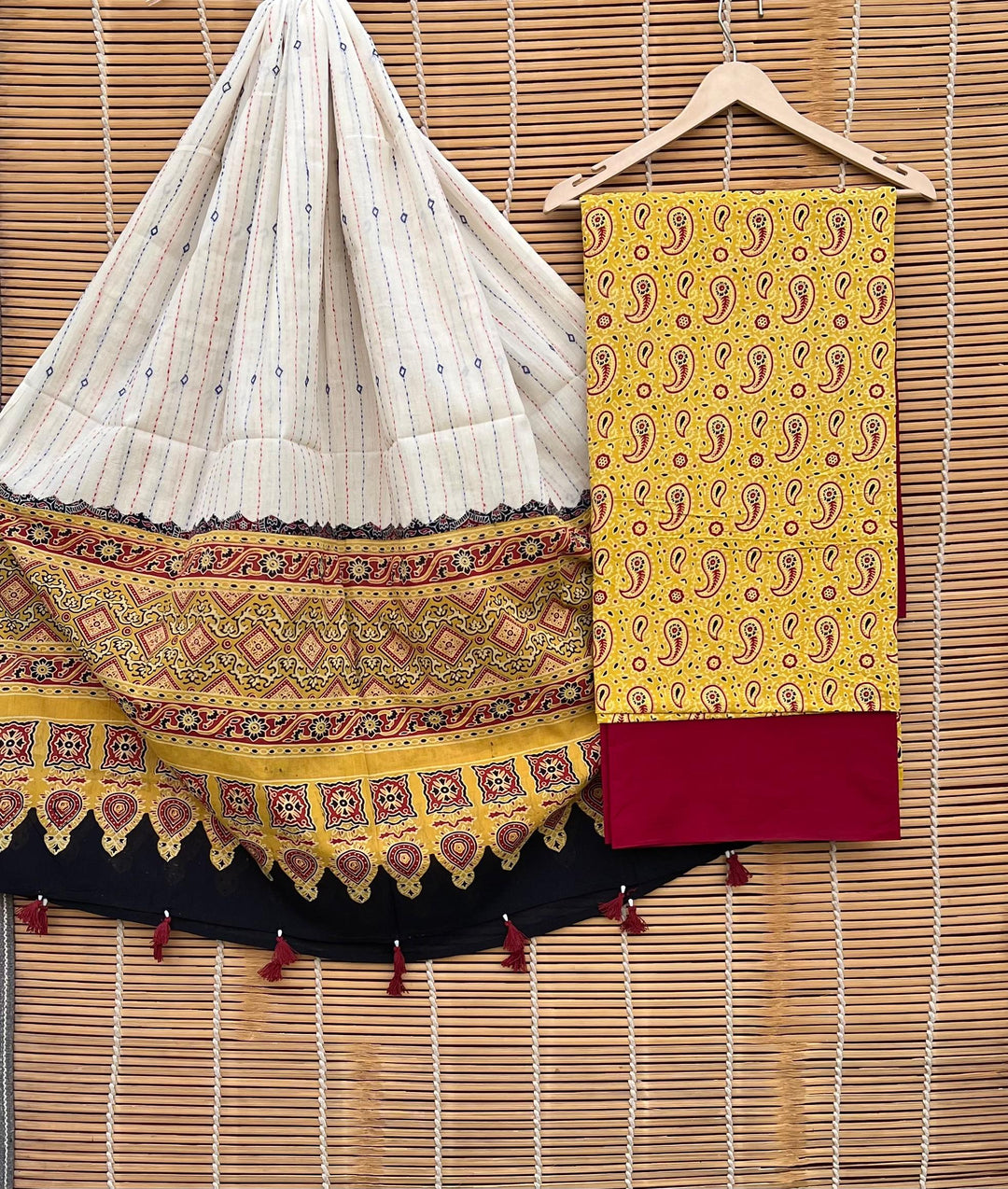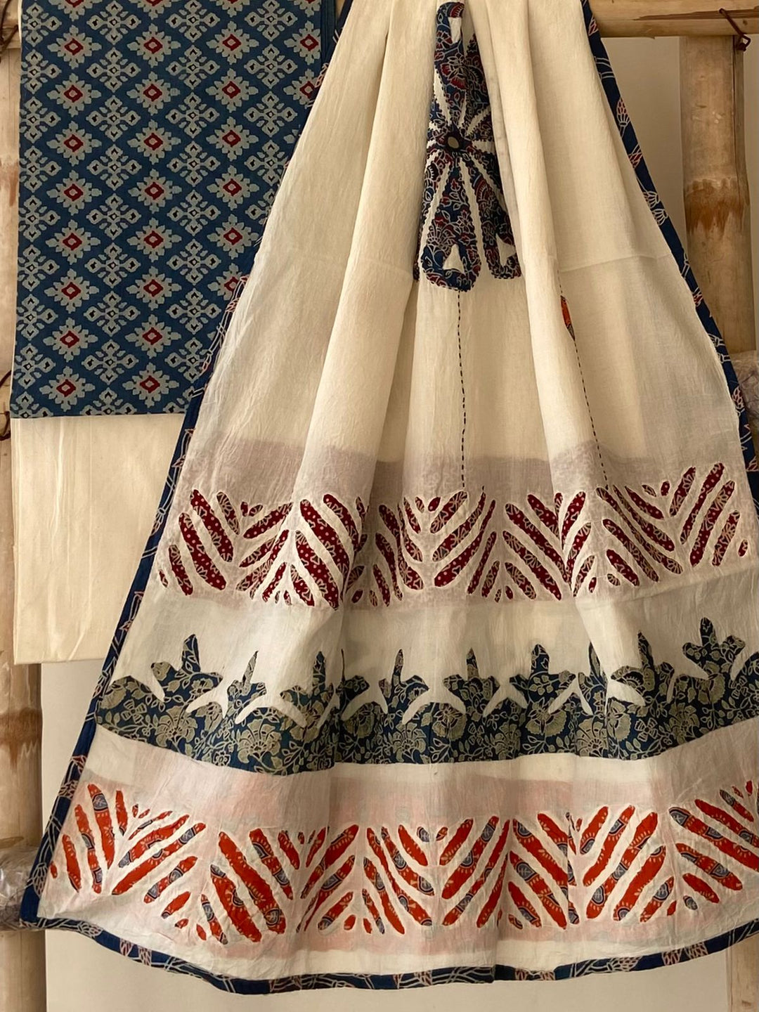 Fab-Persona prints Ajrakh on high-quality pure cotton and modal silk, as per tradition. Cotton Unstitched suits fabric, which is popular and best-selling, is chosen for its durability, softness, and breathability. It is also the best fabric for retaining the vibrancy of natural dyes and patterns.