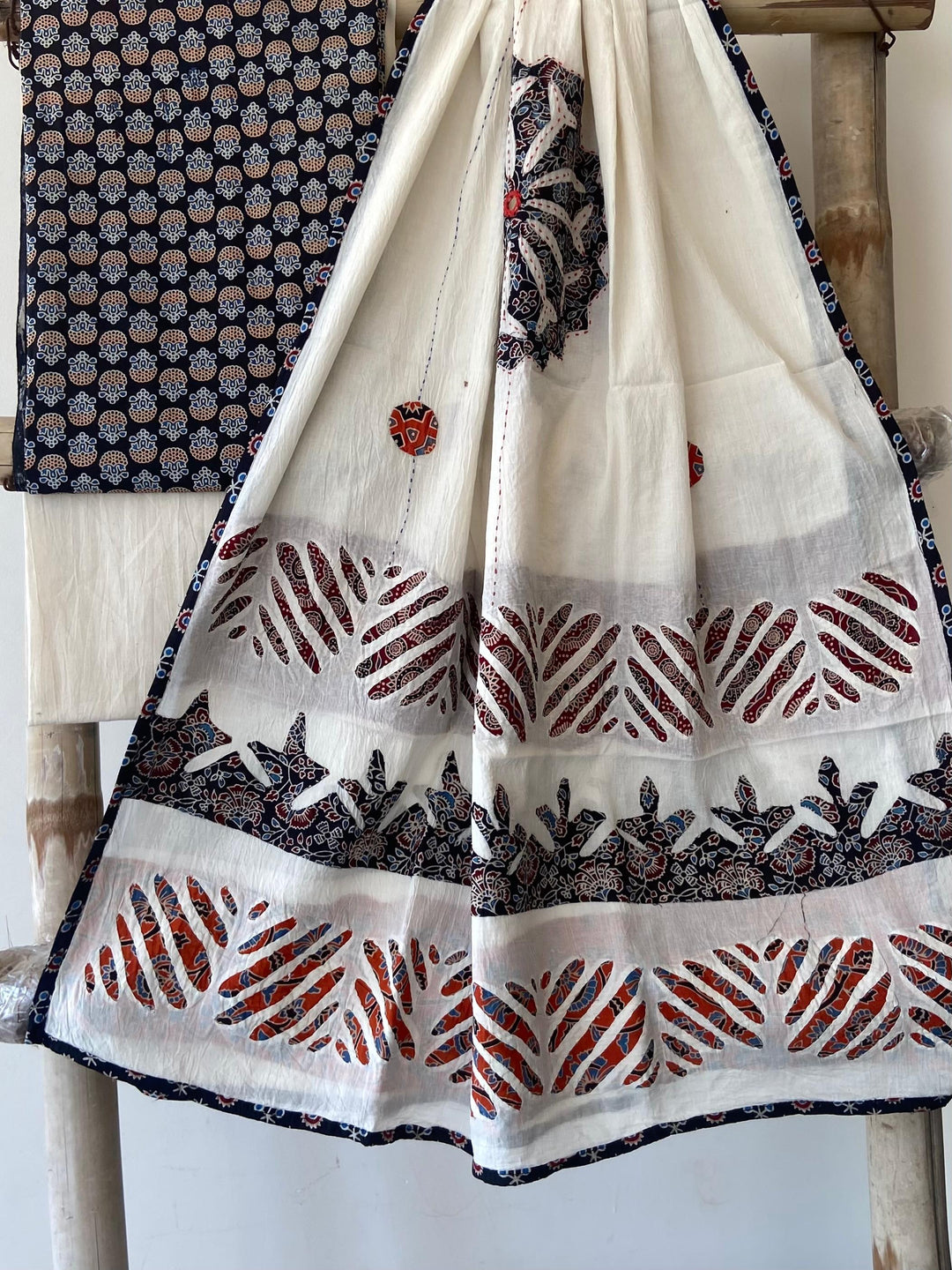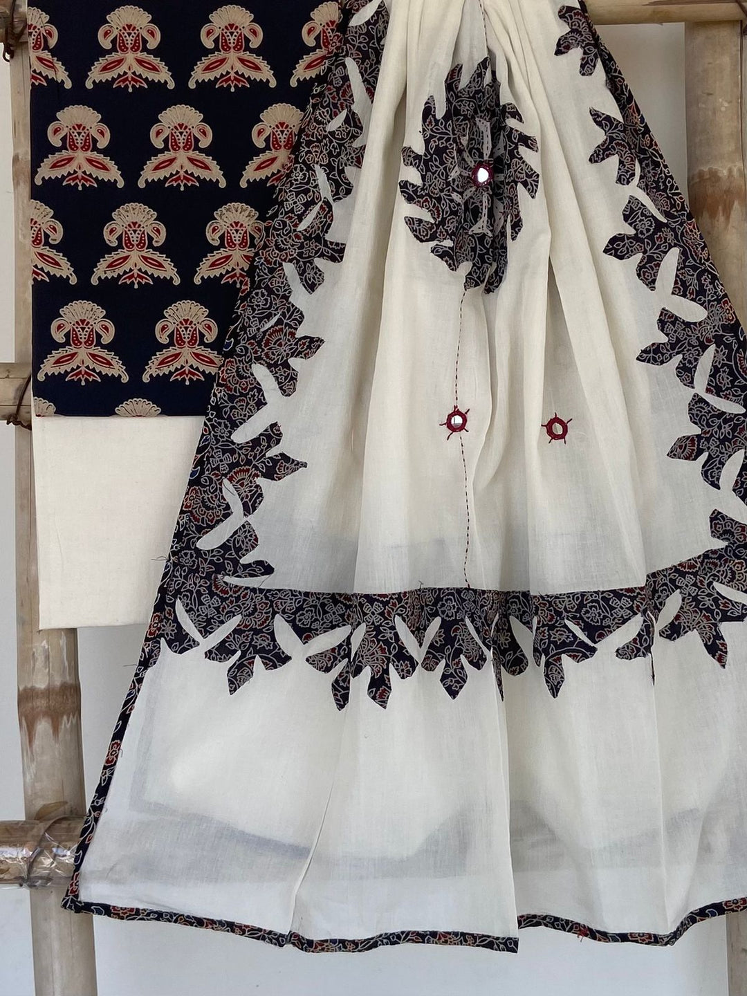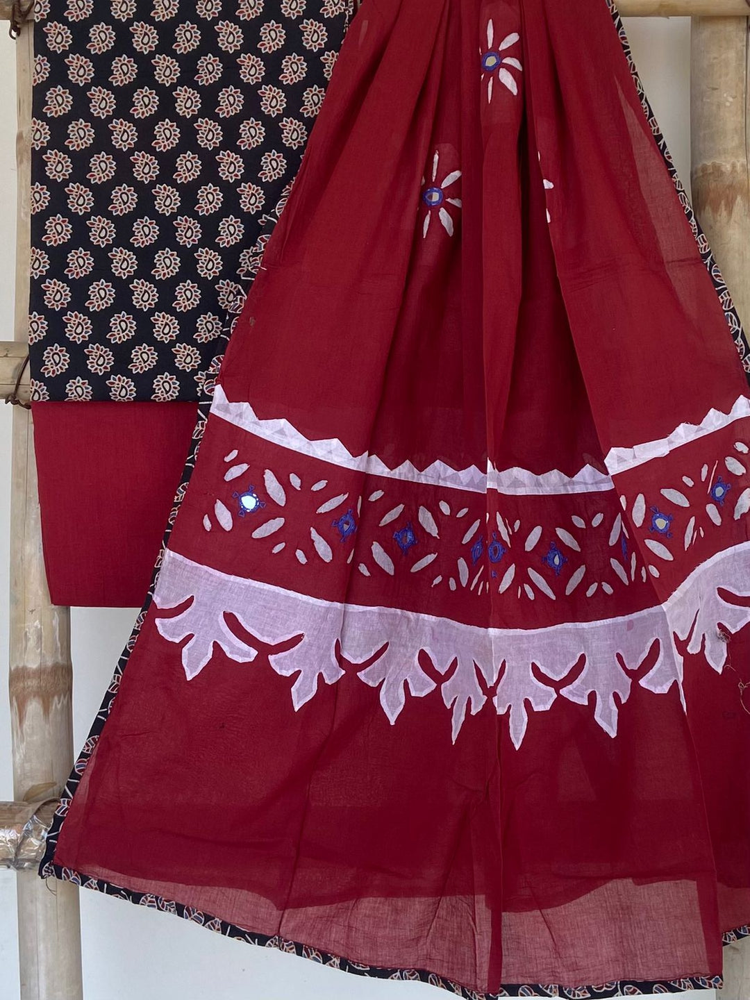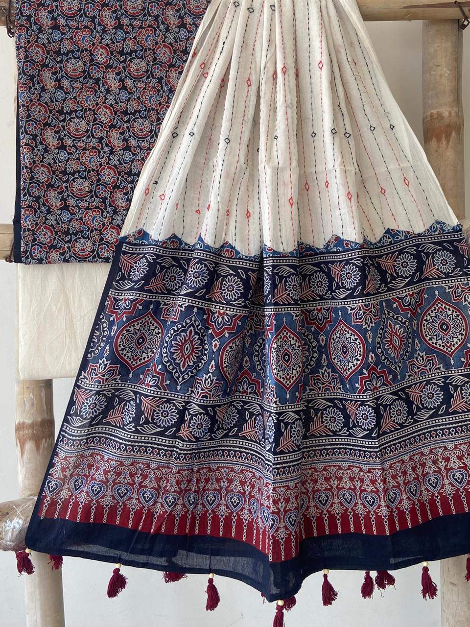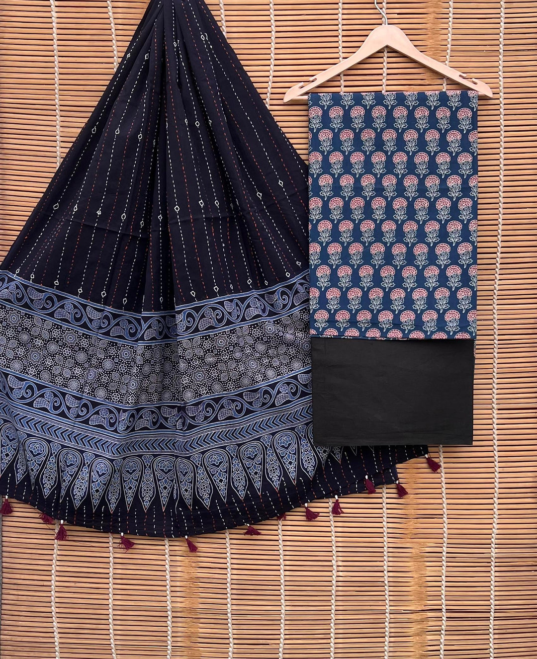 Fab-Persona prints Ajrakh on high-quality pure cotton and modal silk, as per tradition. Cotton Unstitched suits fabric, which is popular and best-selling, is chosen for its durability, softness, and breathability. It is also the best fabric for retaining the vibrancy of natural dyes and patterns.
