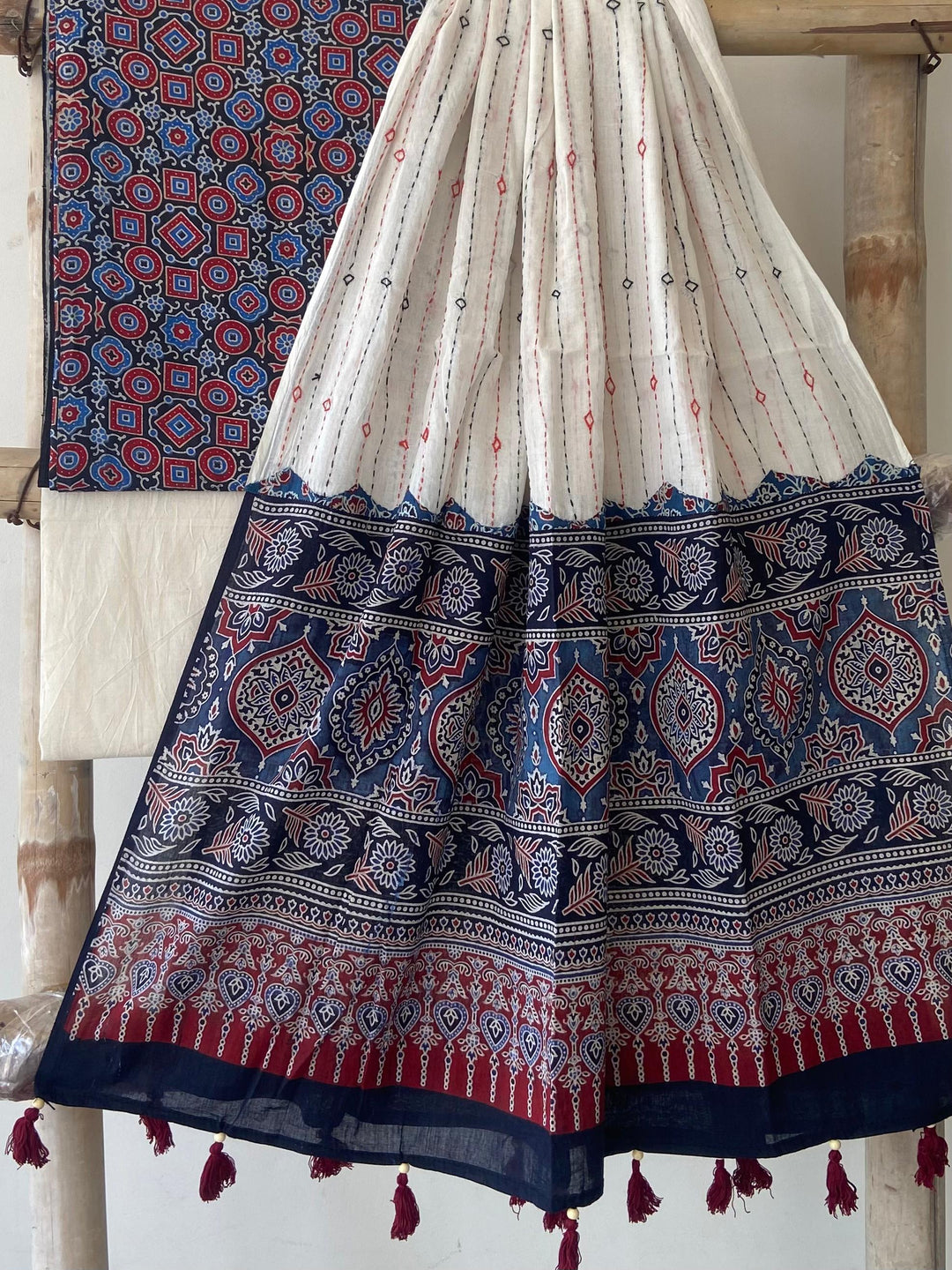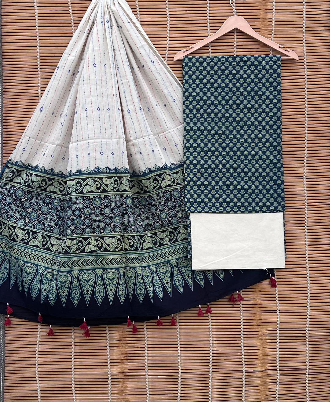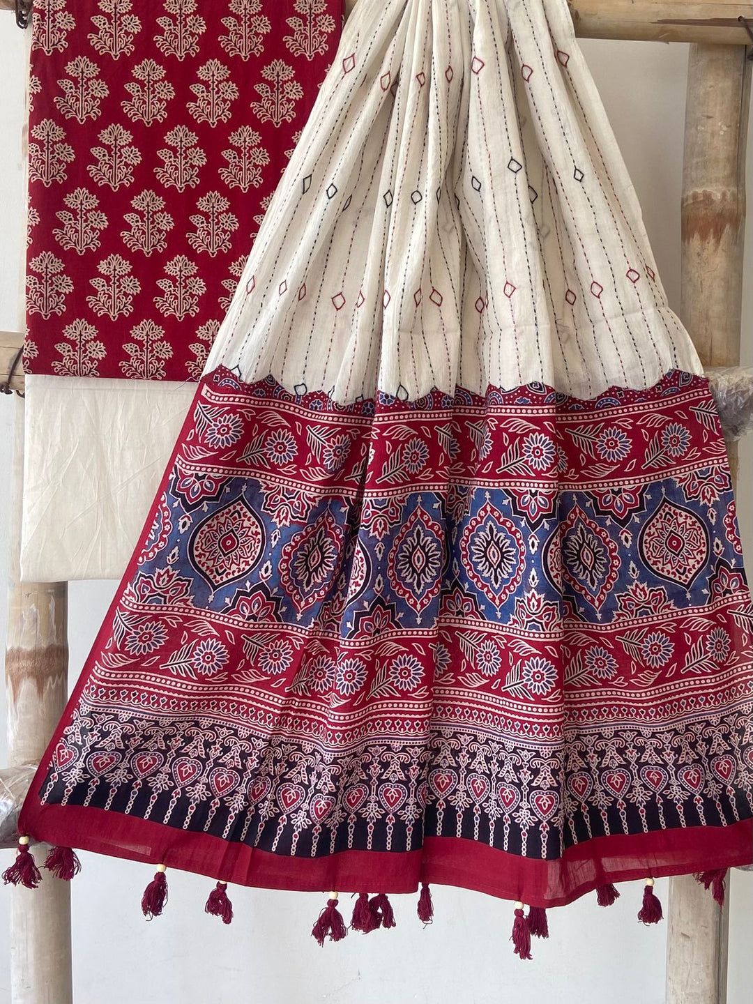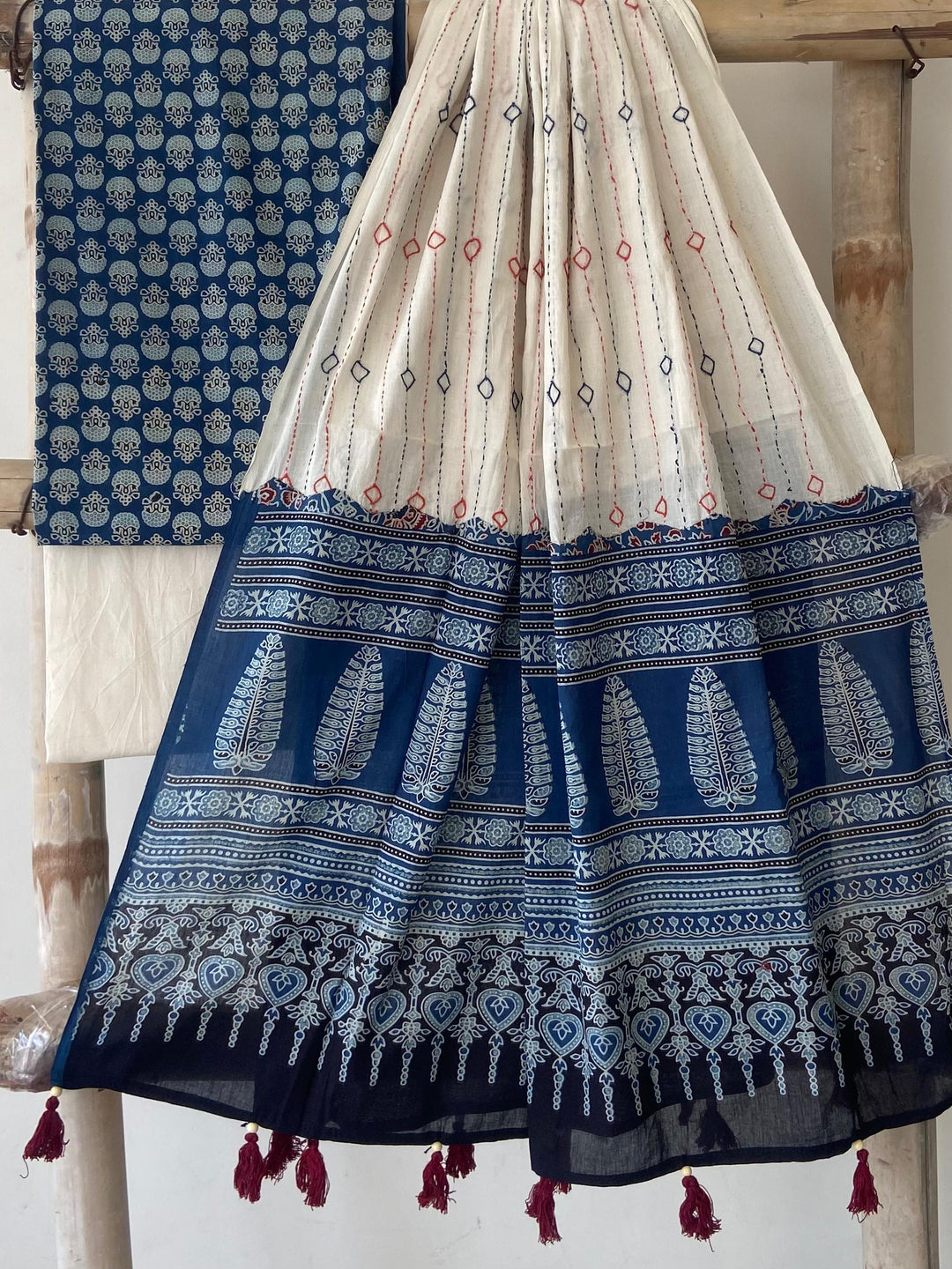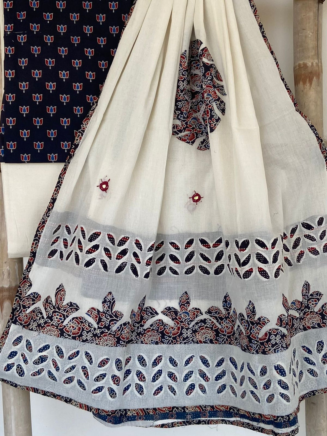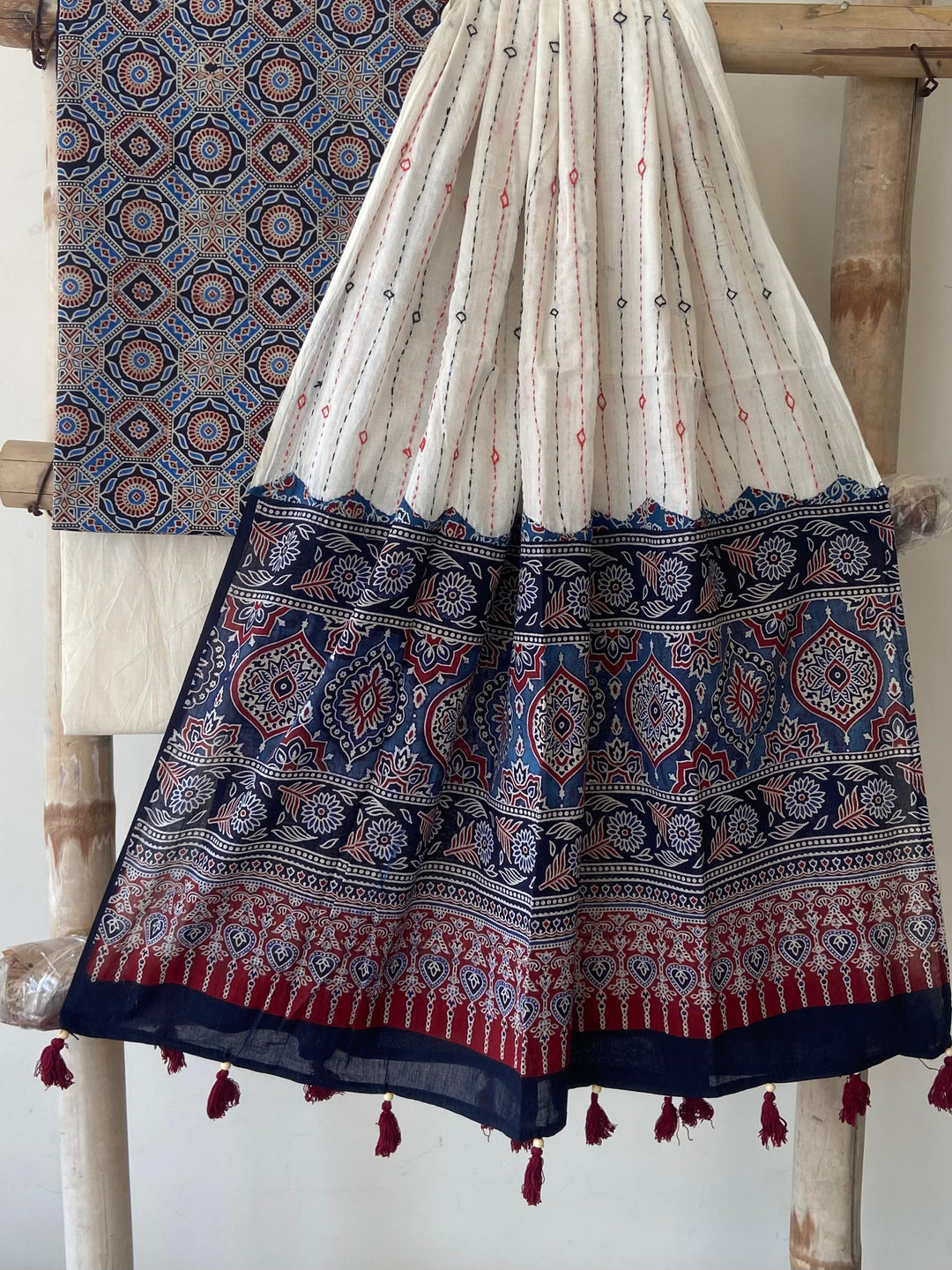 Fab-Persona prints Ajrakh on high-quality pure cotton and modal silk, as per tradition. Cotton Unstitched suits fabric, which is popular and best-selling, is chosen for its durability, softness, and breathability. It is also the best fabric for retaining the vibrancy of natural dyes and patterns.