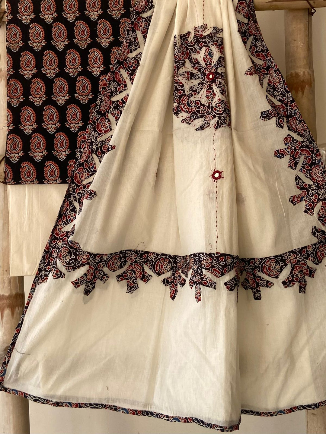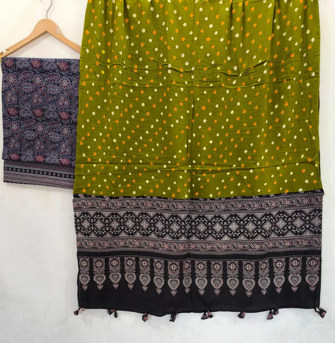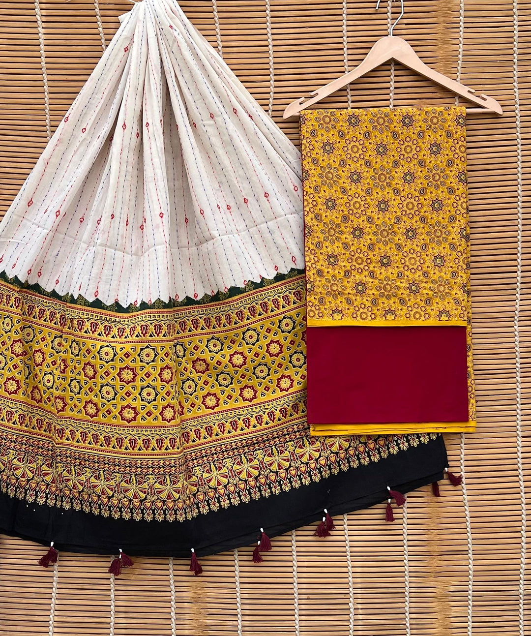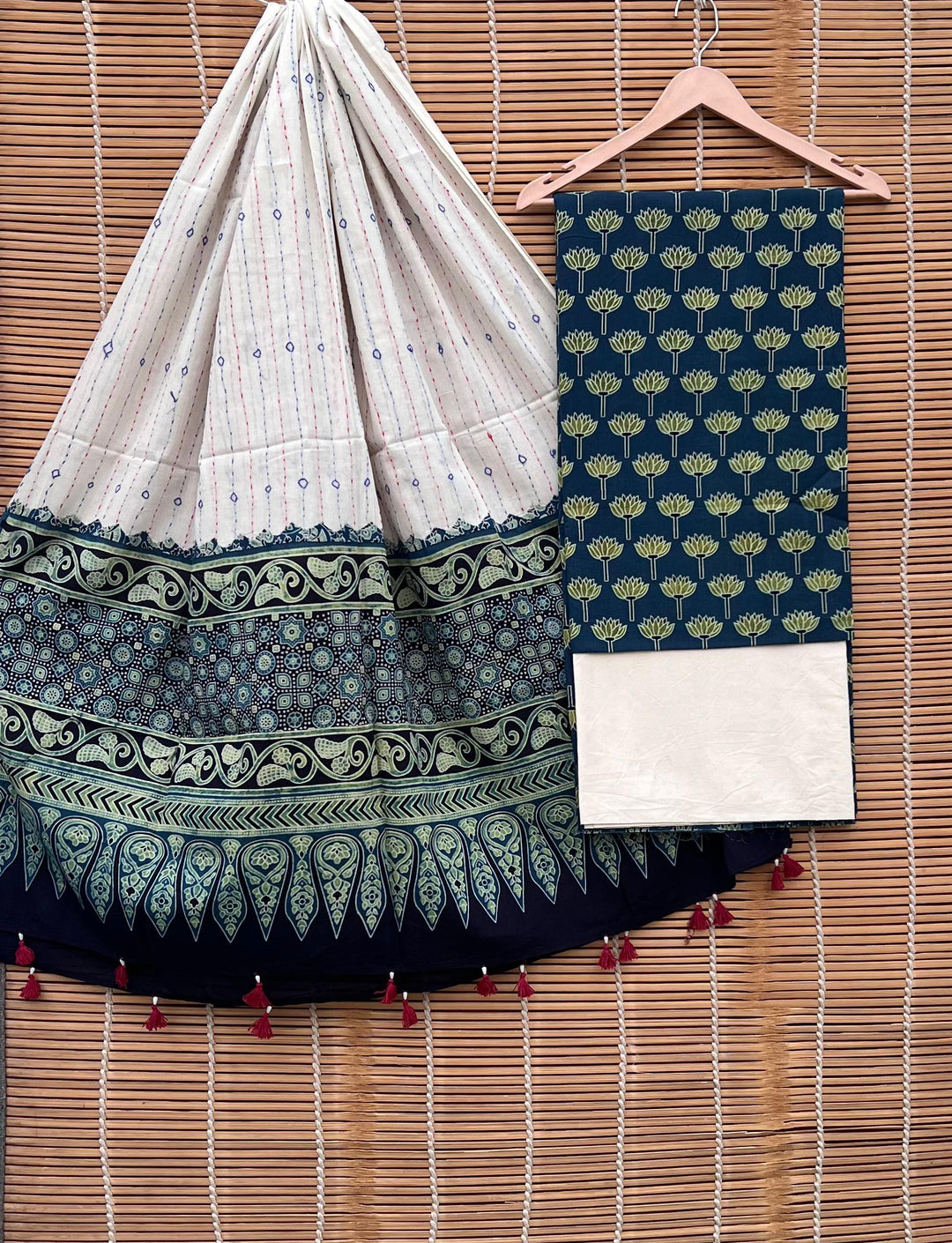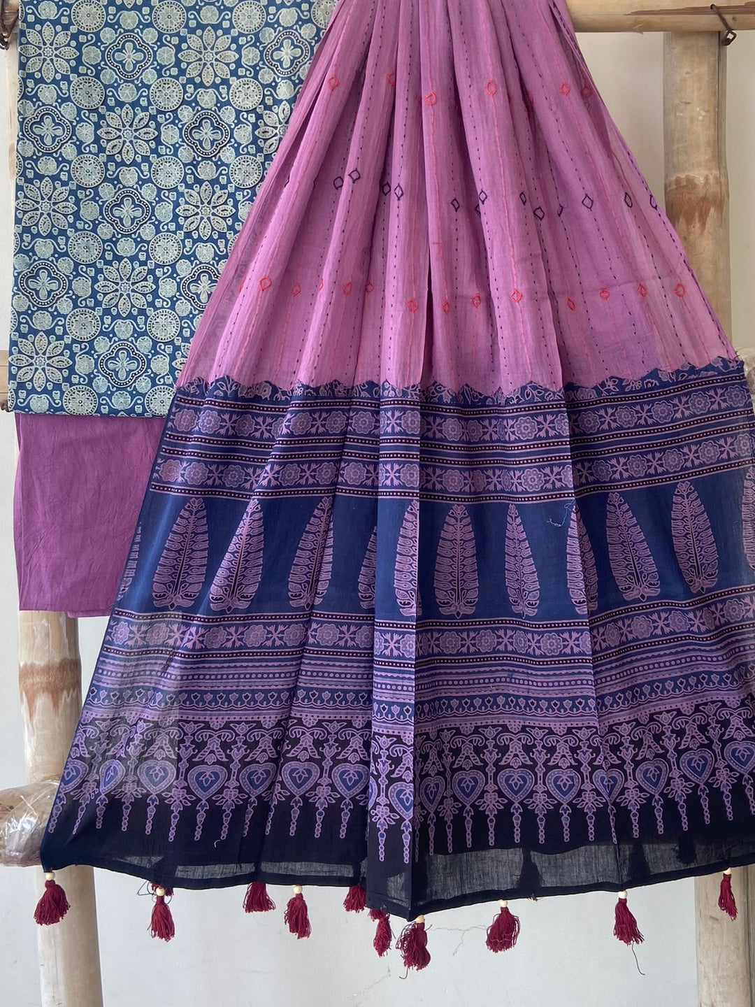 Fab-Persona prints Ajrakh on high-quality pure cotton and modal silk, as per tradition. Cotton Unstitched suits fabric, which is popular and best-selling, is chosen for its durability, softness, and breathability. It is also the best fabric for retaining the vibrancy of natural dyes and patterns.