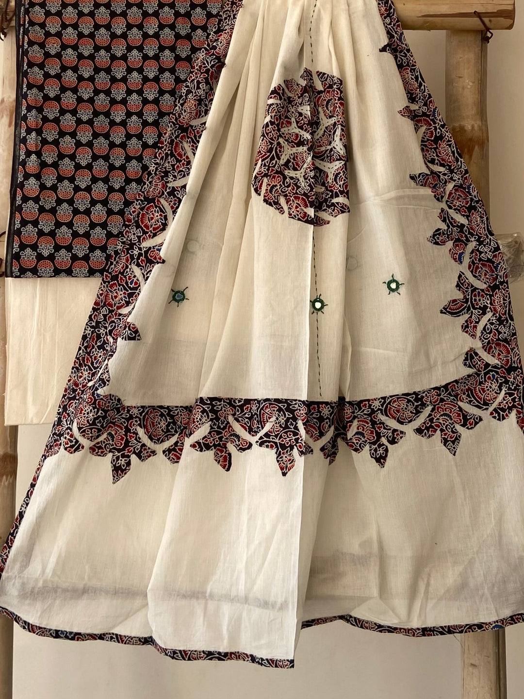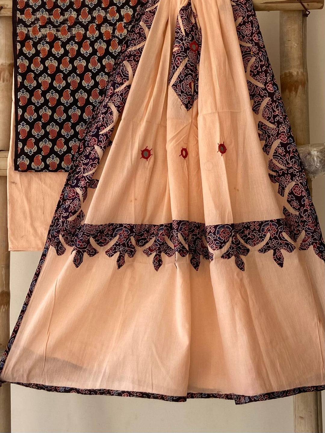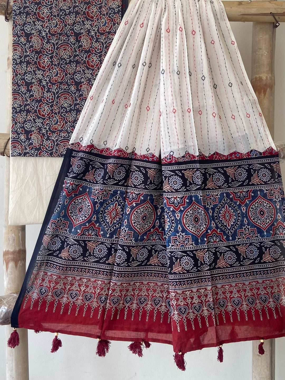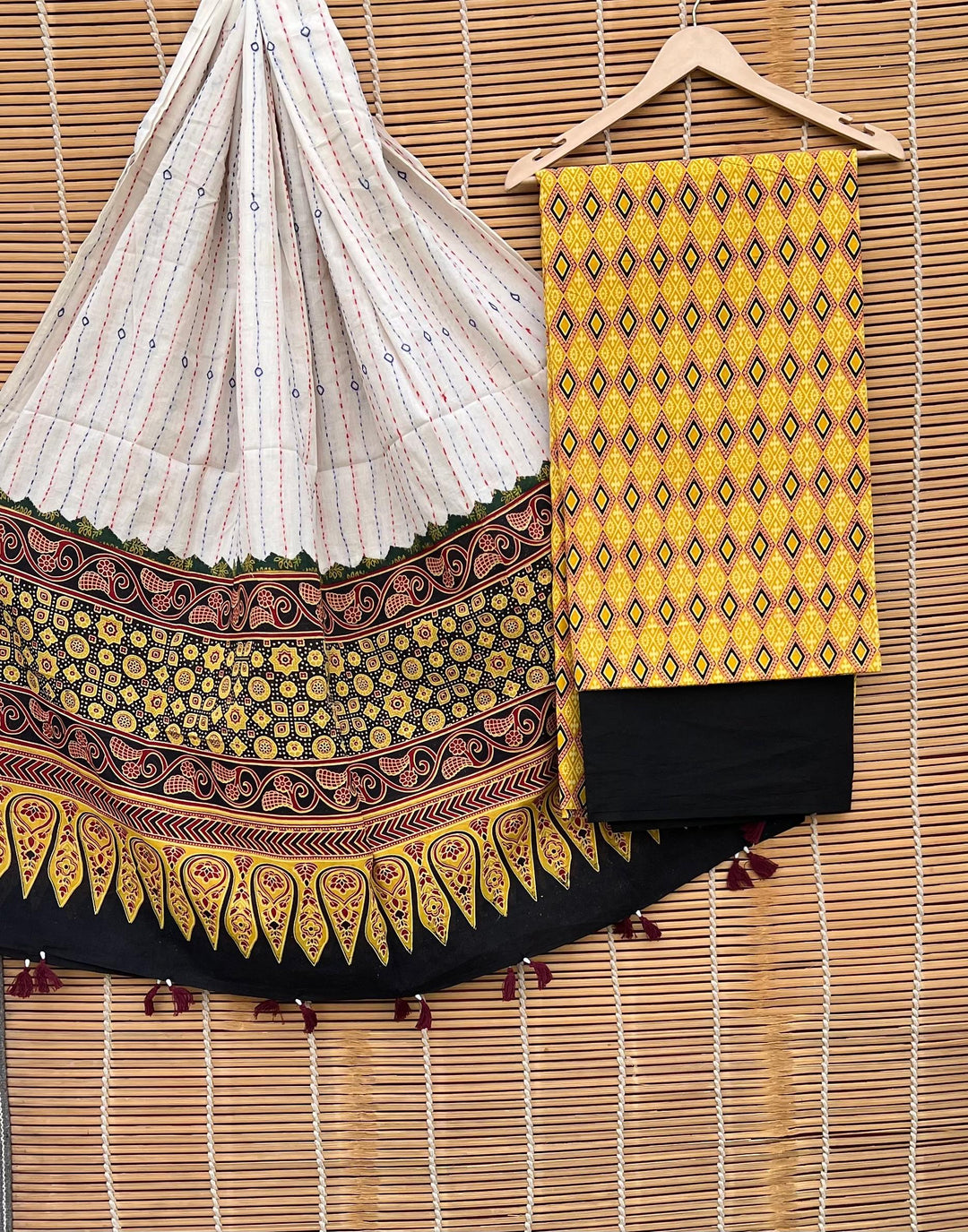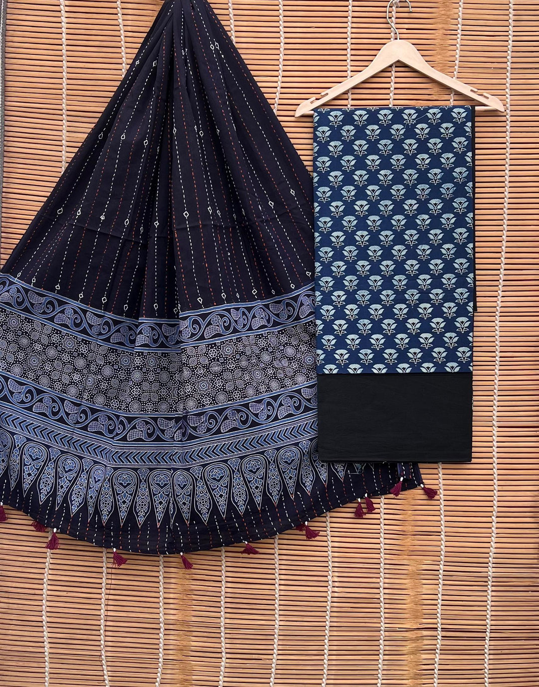 Fab-Persona prints Ajrakh on high-quality pure cotton and modal silk, as per tradition. Cotton Unstitched suits fabric, which is popular and best-selling, is chosen for its durability, softness, and breathability. It is also the best fabric for retaining the vibrancy of natural dyes and patterns.
