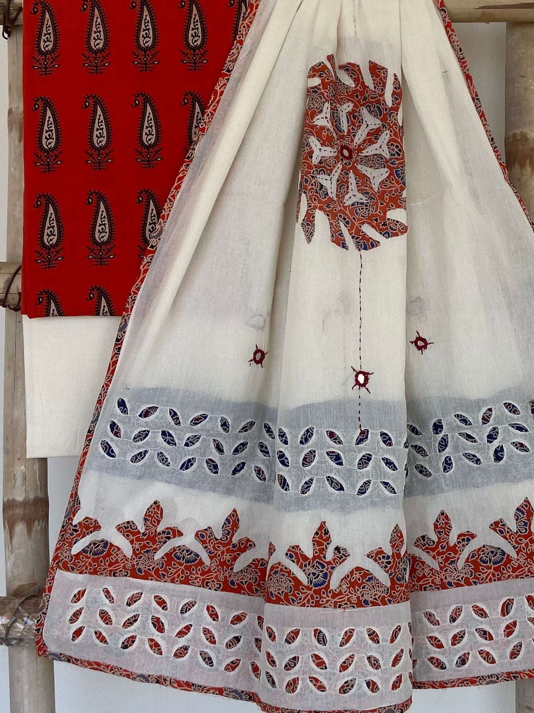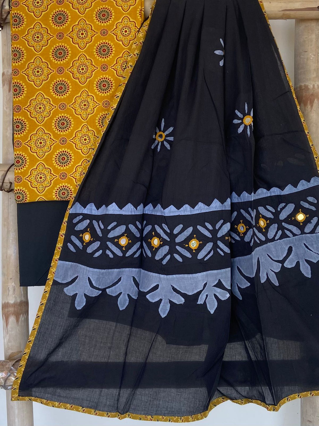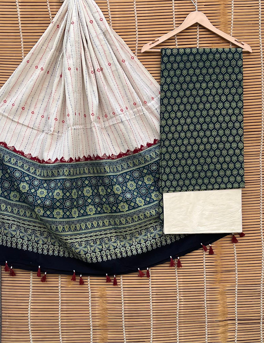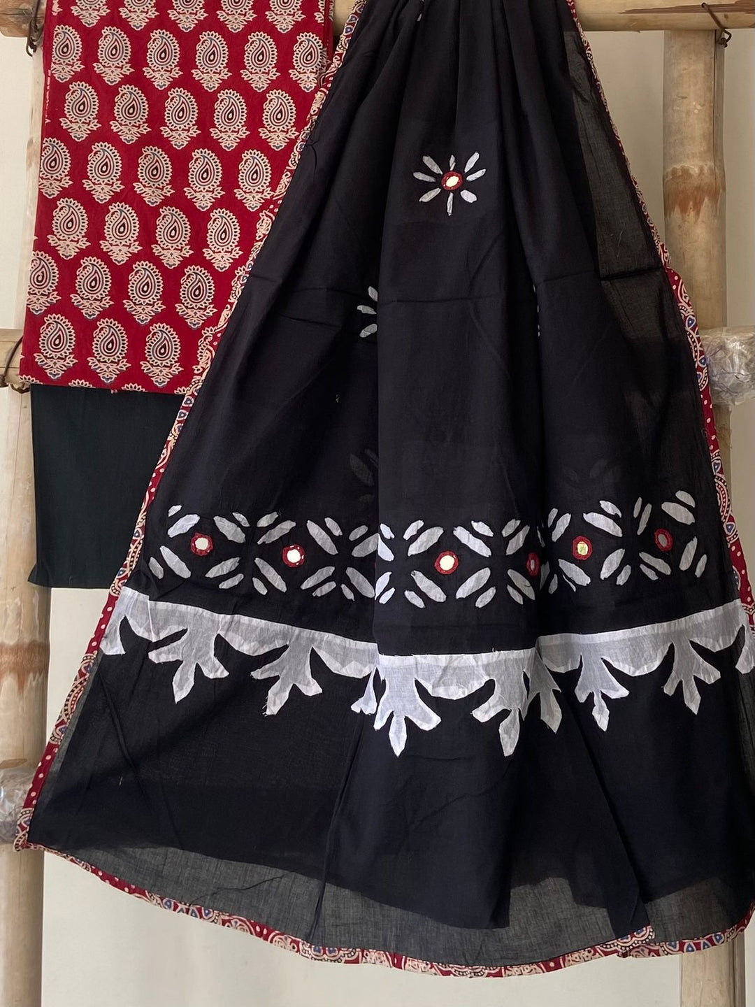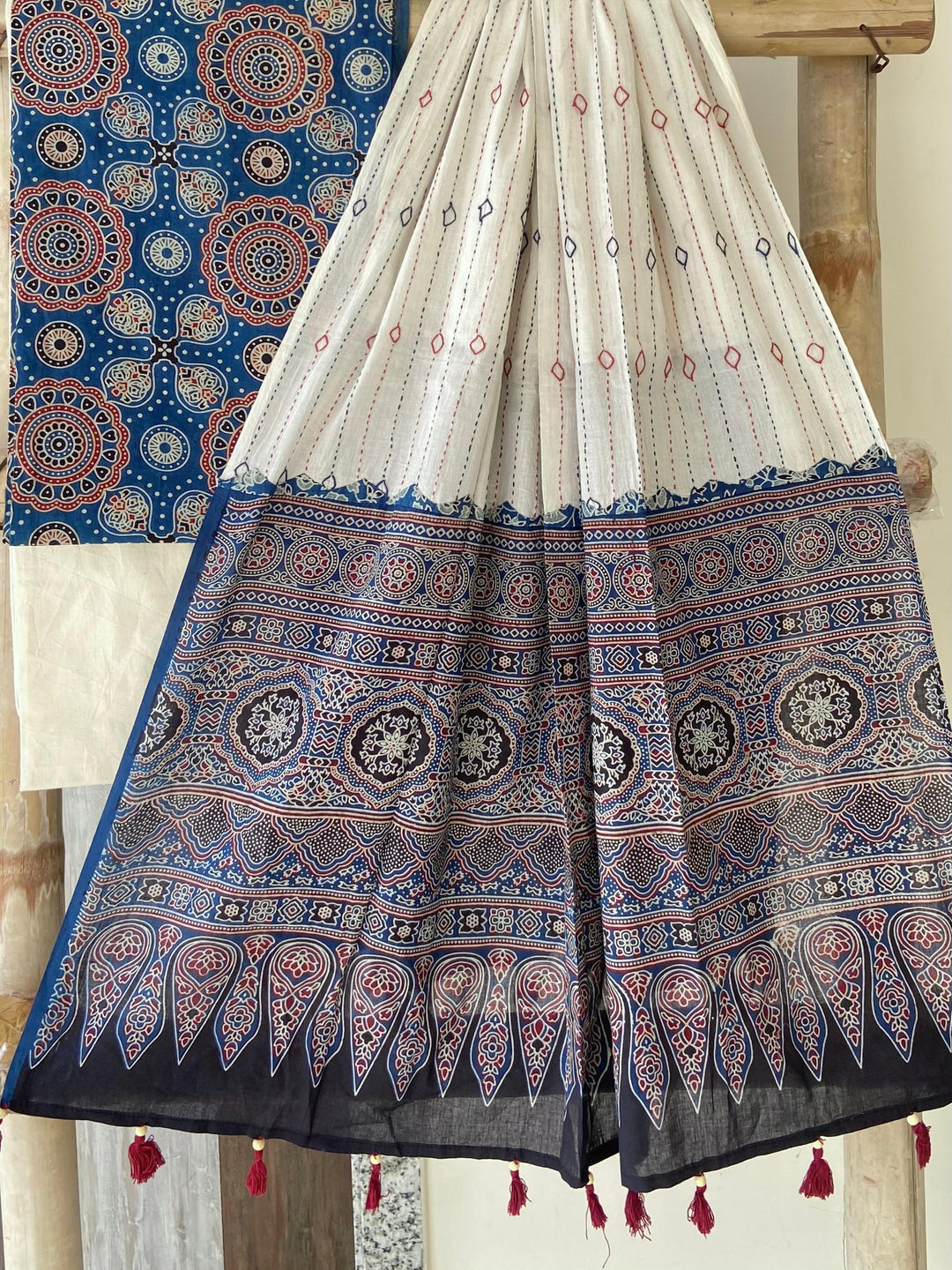 Fab-Persona prints Ajrakh on high-quality pure cotton and modal silk, as per tradition. Cotton Unstitched suits fabric, which is popular and best-selling, is chosen for its durability, softness, and breathability. It is also the best fabric for retaining the vibrancy of natural dyes and patterns.