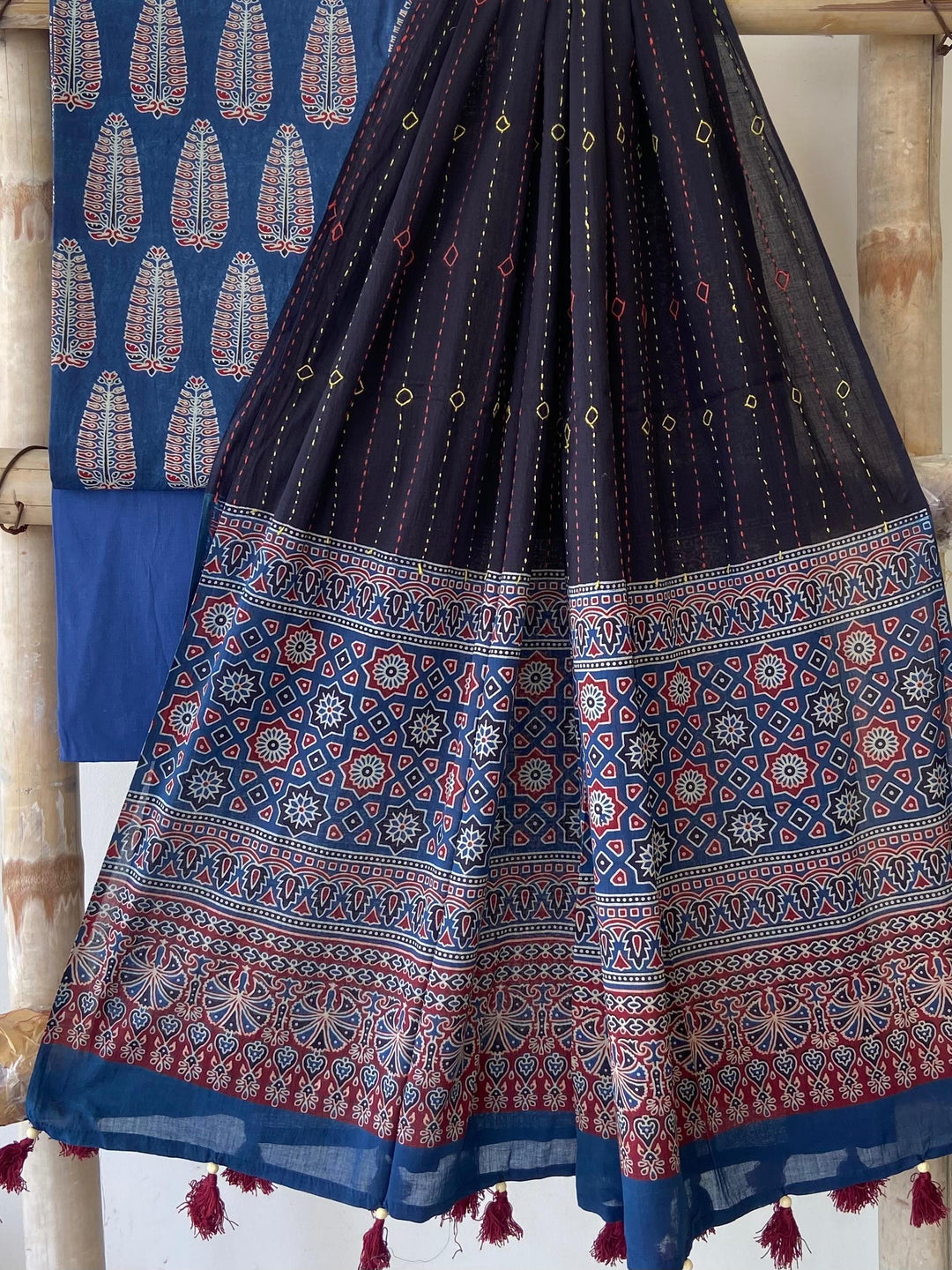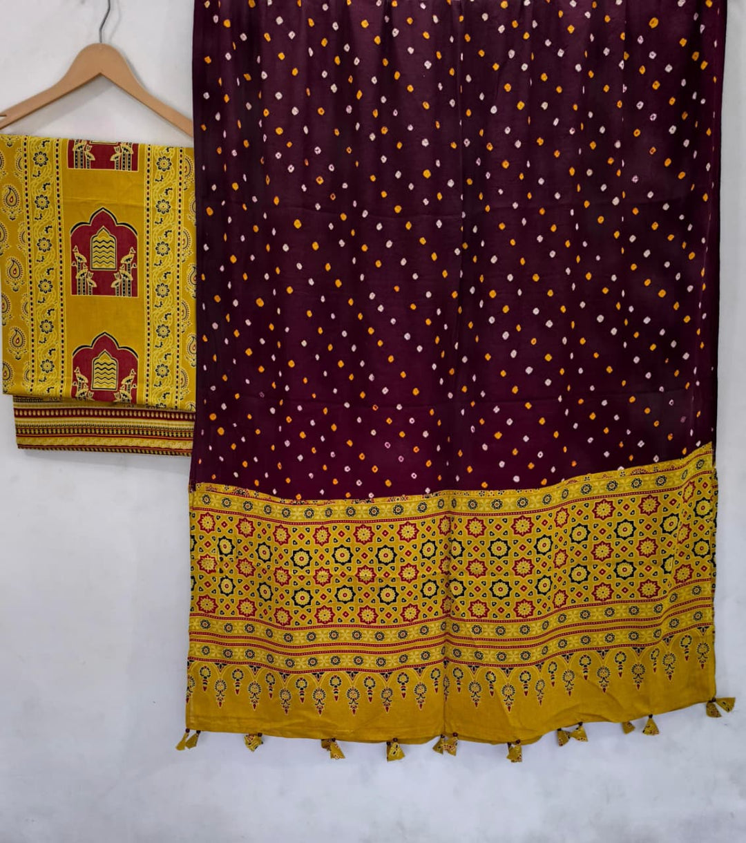 Each Unstitched Ajrakh Suit fabric is further beautified with traditional Indian patterns and embroideries. Our Ajrakh print suits’ online collection includes the following limited editions: