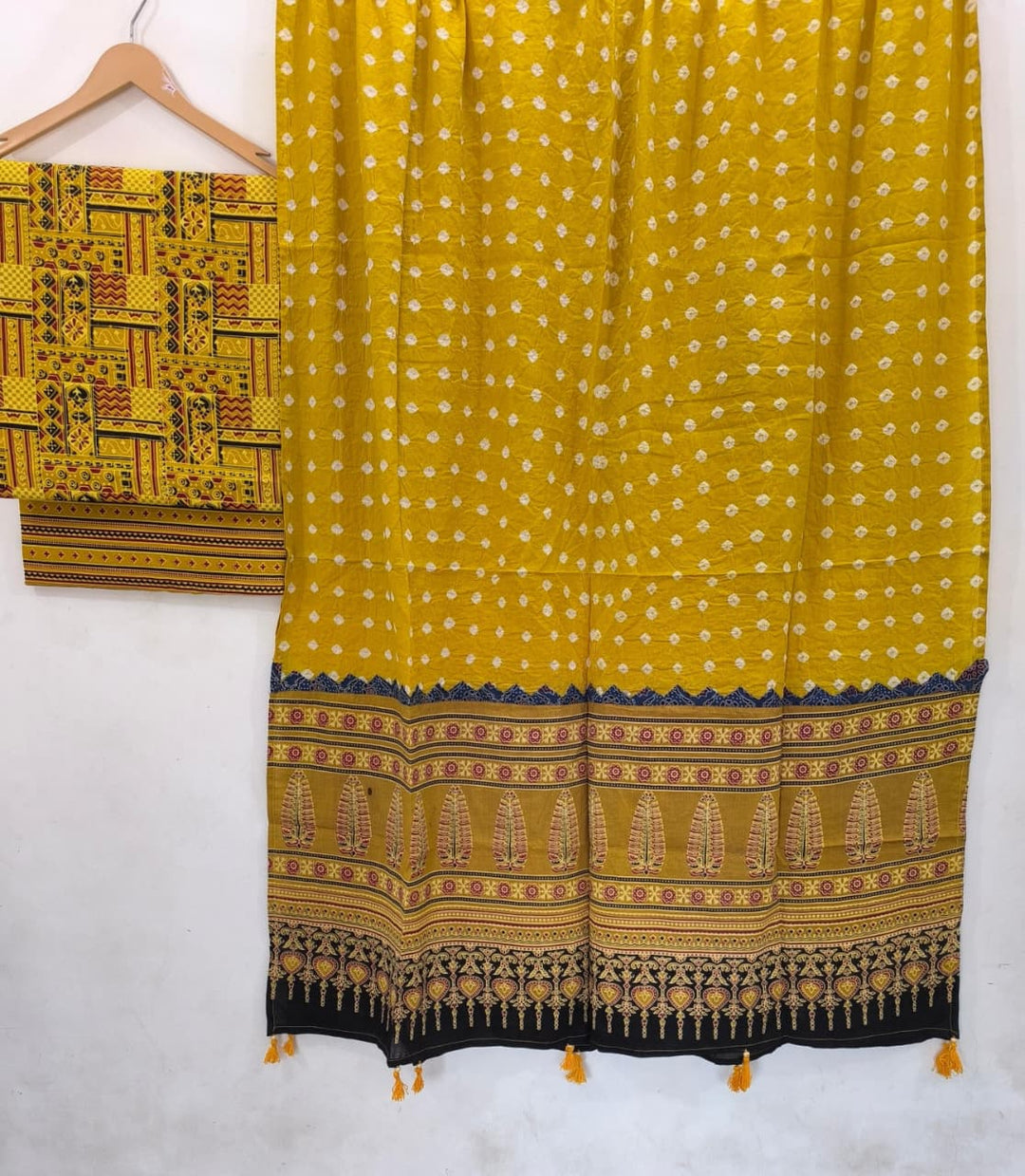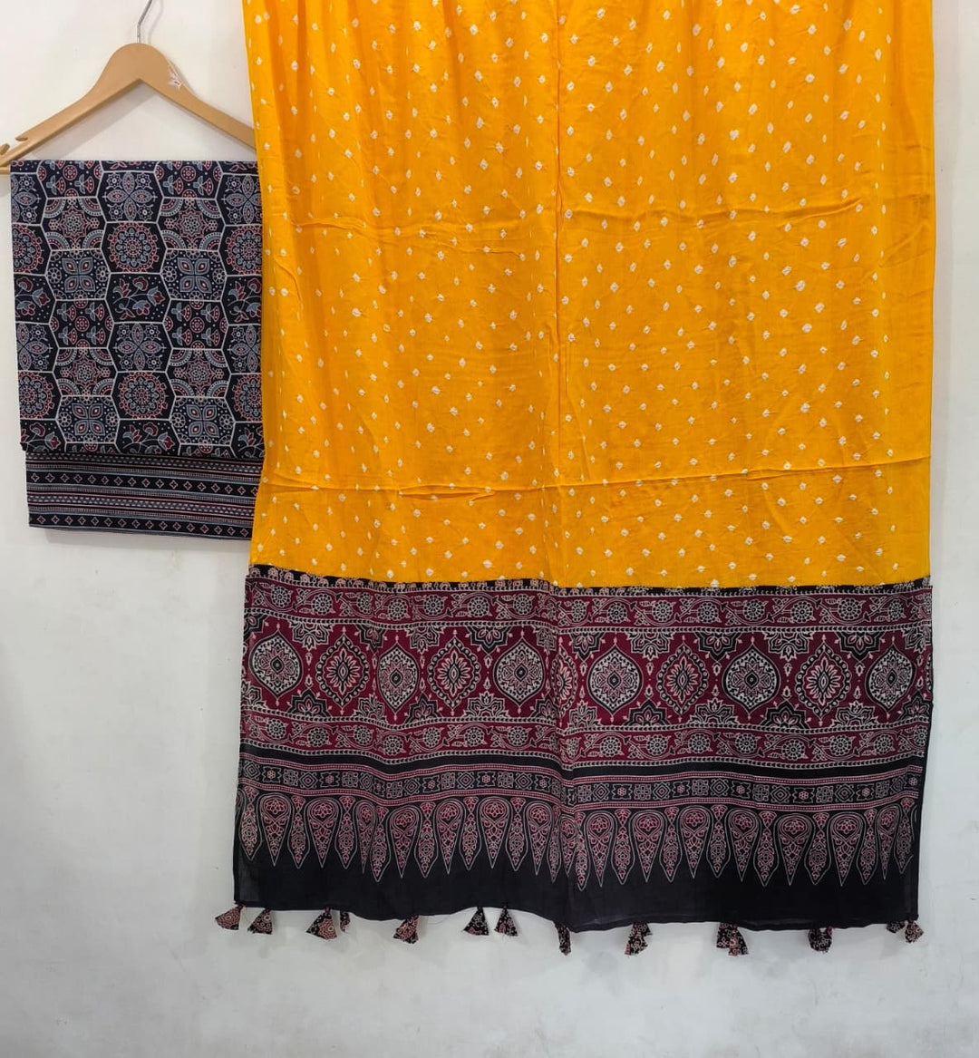 Most of our Ajrakh Unstitched Suit Sets are crafted from a single fabric, such as pure cotton. However, you can also explore mix-and-match options, like a pure cotton kurta suits fabric paired with a silk tissue bottom and dupatta fabric, among other combinations. All Unstitched Ajrakh Suits Online include a total of 7.5 meters of fabric: 2.5 meters for the top, 2.5 meters for the bottom, and 2.5 meters for the dupatta.