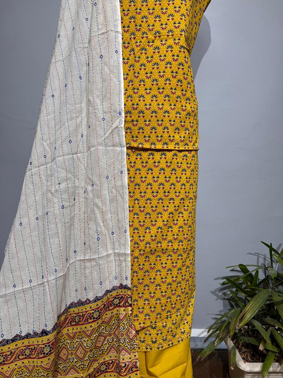Elevate your ethnic wardrobe with this exquisite Pure Cotton Azrakh Print unstitched suit. Crafted from premium cotton, this ensemble features the timeless Azrakh block print technique, renowned for its intricate geometric patterns and natural indigo hues. The suit includes a beautifully embellished dupatta adorned with delicate katha work—traditional hand embroidery that adds sophistication and texture. Perfect for festive occasions, celebrations, or everyday elegance, this versatile piece allows you to customize the fit through your preferred tailor. The breathable cotton fabric ensures comfort in warm climates, while the authentic Azrakh print and katha embroidery showcase traditional craftsmanship. An investment in timeless style that honors heritage design.