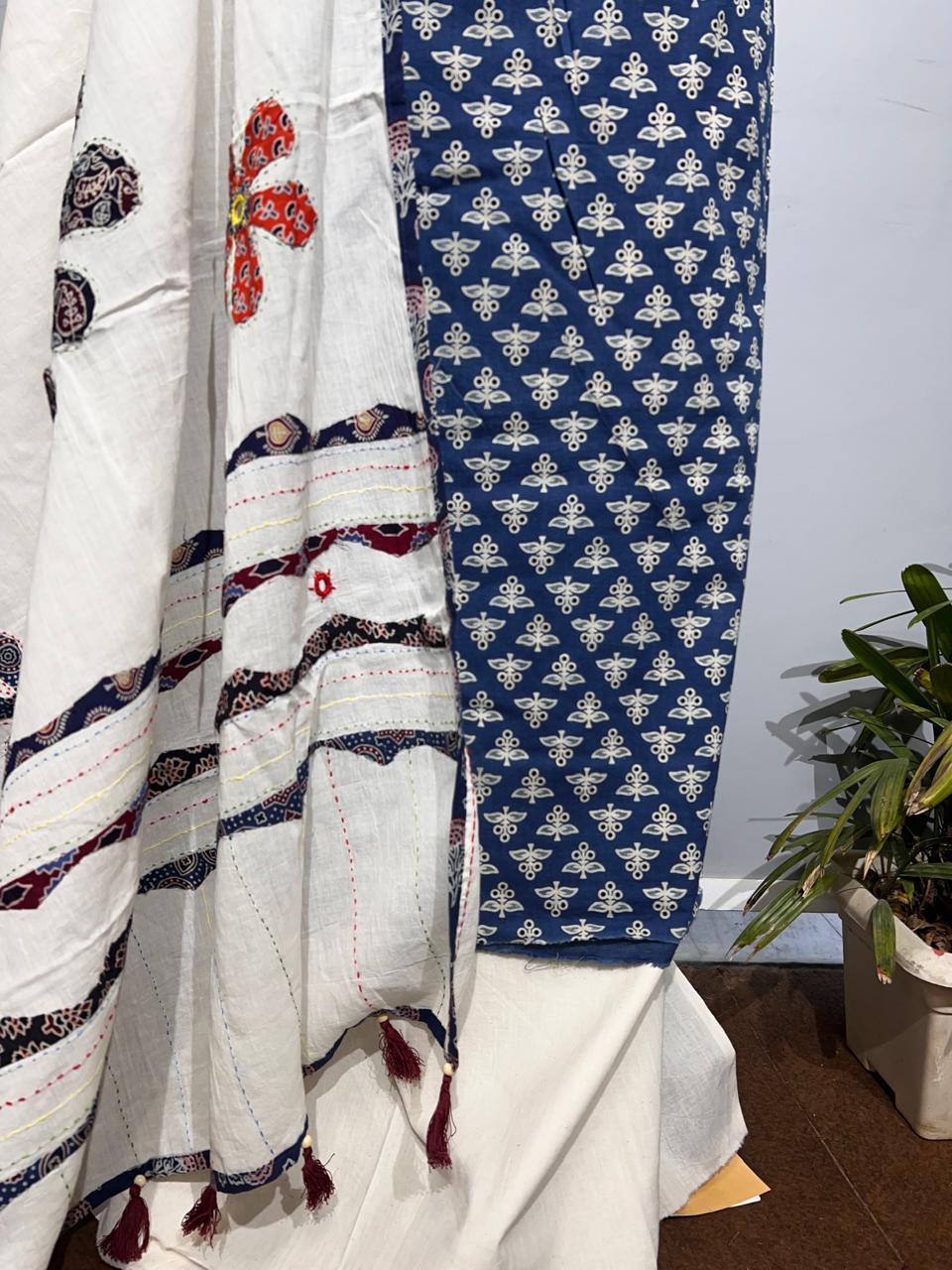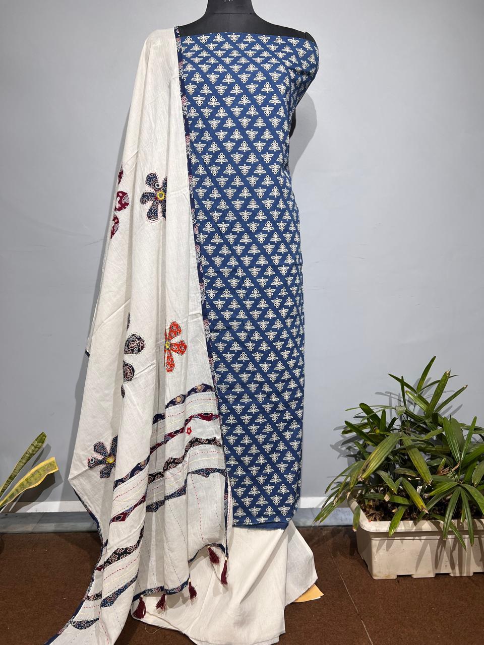 Elevate your ethnic wardrobe with this exquisite Pure Cotton Azrakh Print unstitched suit. Crafted from premium cotton, this ensemble features the timeless Azrakh block print technique, renowned for its intricate geometric patterns and natural indigo hues. The suit includes a beautifully embellished dupatta adorned with delicate katha work—traditional hand embroidery that adds sophistication and texture. Perfect for festive occasions, celebrations, or everyday elegance, this versatile piece allows you to customize the fit through your preferred tailor. The breathable cotton fabric ensures comfort in warm climates, while the authentic Azrakh print and katha embroidery showcase traditional craftsmanship. An investment in timeless style that honors heritage design.