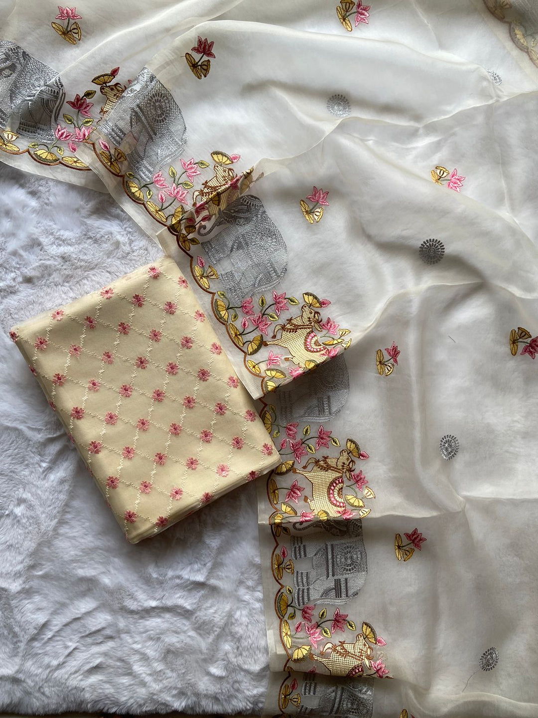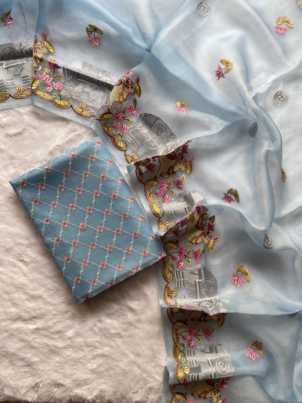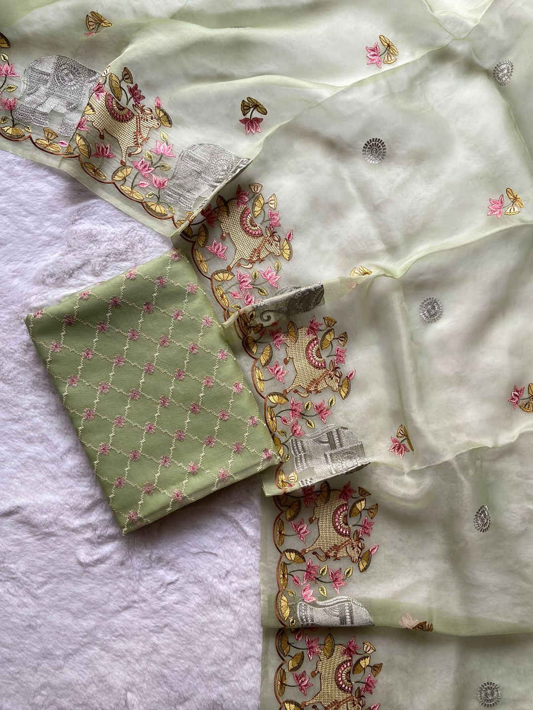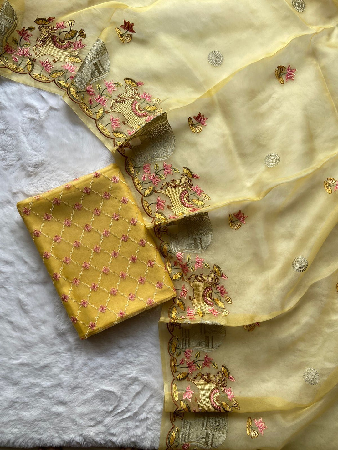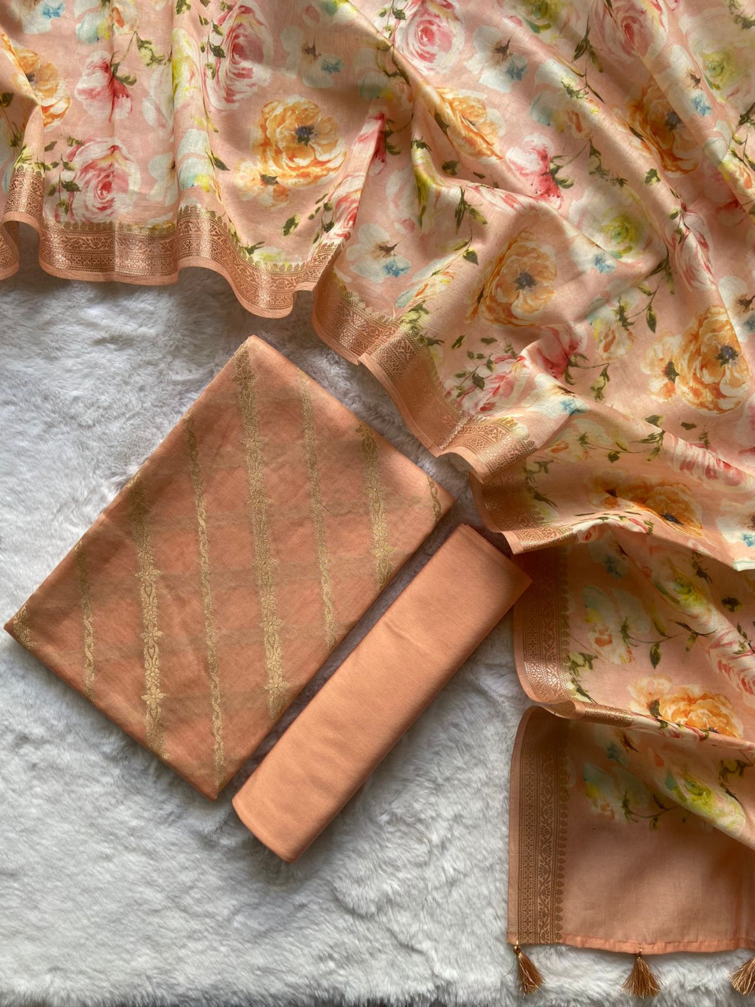 Whether you are going to a wedding, festive event or a casual get-together, our Pure Banarasi Suit Materials are designed to leave everyone in awe. The stunning prints and the opulent texture of Banarasi fabric make these the perfect statement piece for any event. Enhance with a matching dupatta for that final touch of glamour and sophistication.