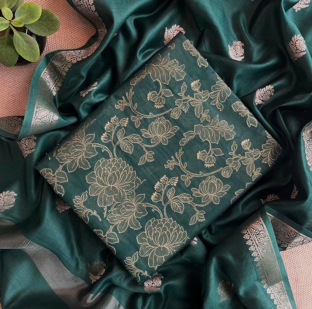 Pure Chanderi Mercerized Zari Woven Unstitched Suit With Pure Chanderi Floral Print Dupatta.