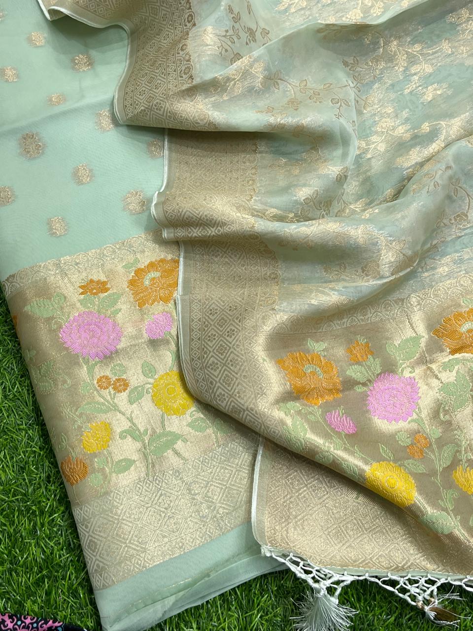 It’s a premium fusion of organza fabric with traditional Banarasi weaving—offering a lightweight, luxurious drape with detailed zari work.