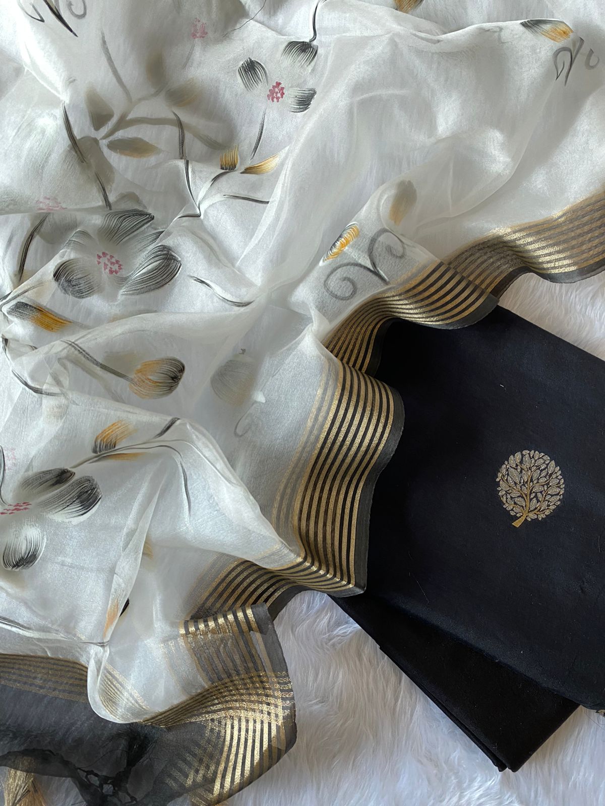 Pure Banarasi Resham Chanderi Silk Alfi Weaved Suit with Organza Zari Border handbrush print dupatta