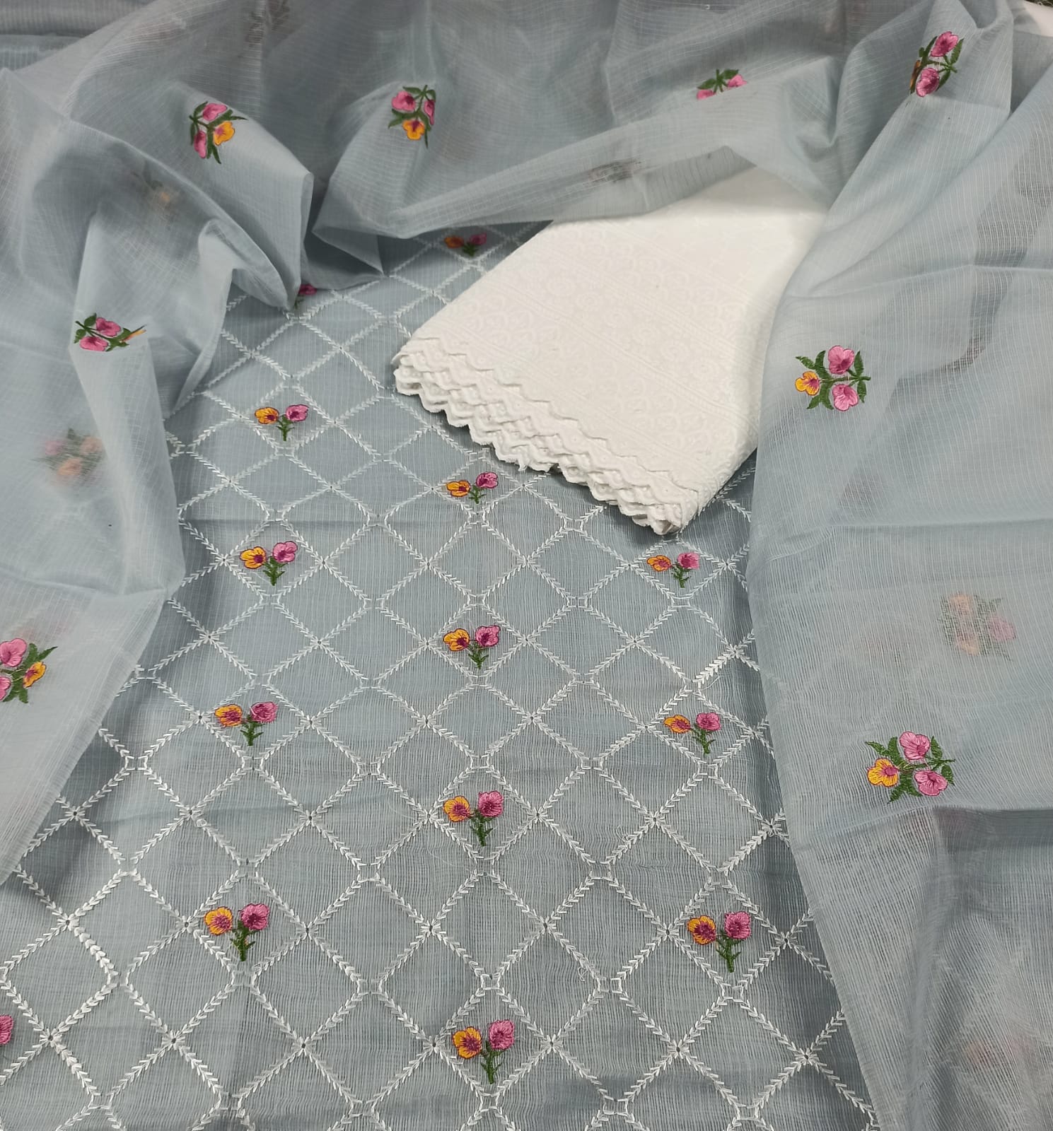 Pure Cotton Kota Doriya Hand Embroidery Unstitched Suit With Chikankari Bottom.