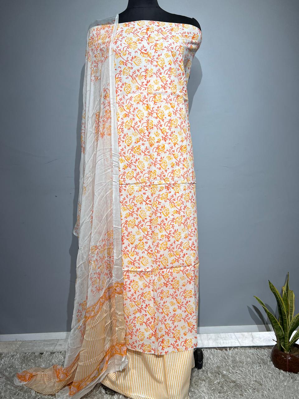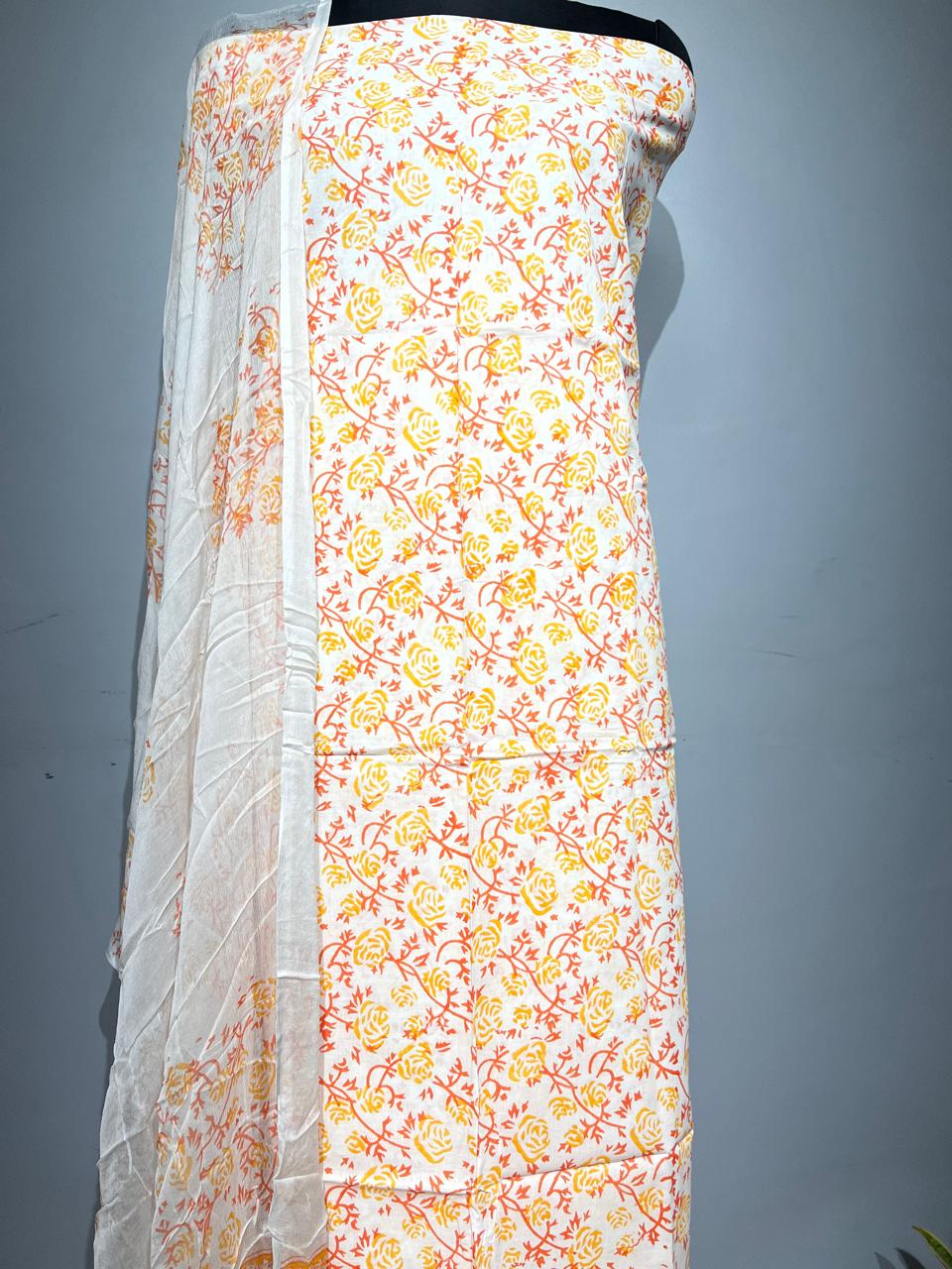 Pure Cotton Hand Block Print Unstitched Suit With Chiffon Dupatta