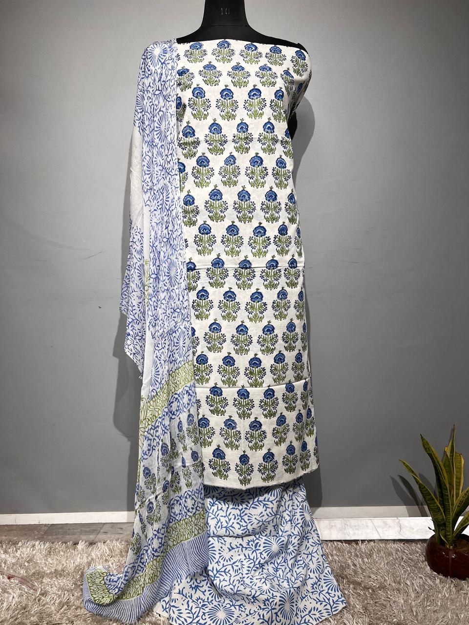 Pure Cotton Hand Block Print Unstitched Suit With Chiffon Dupatta