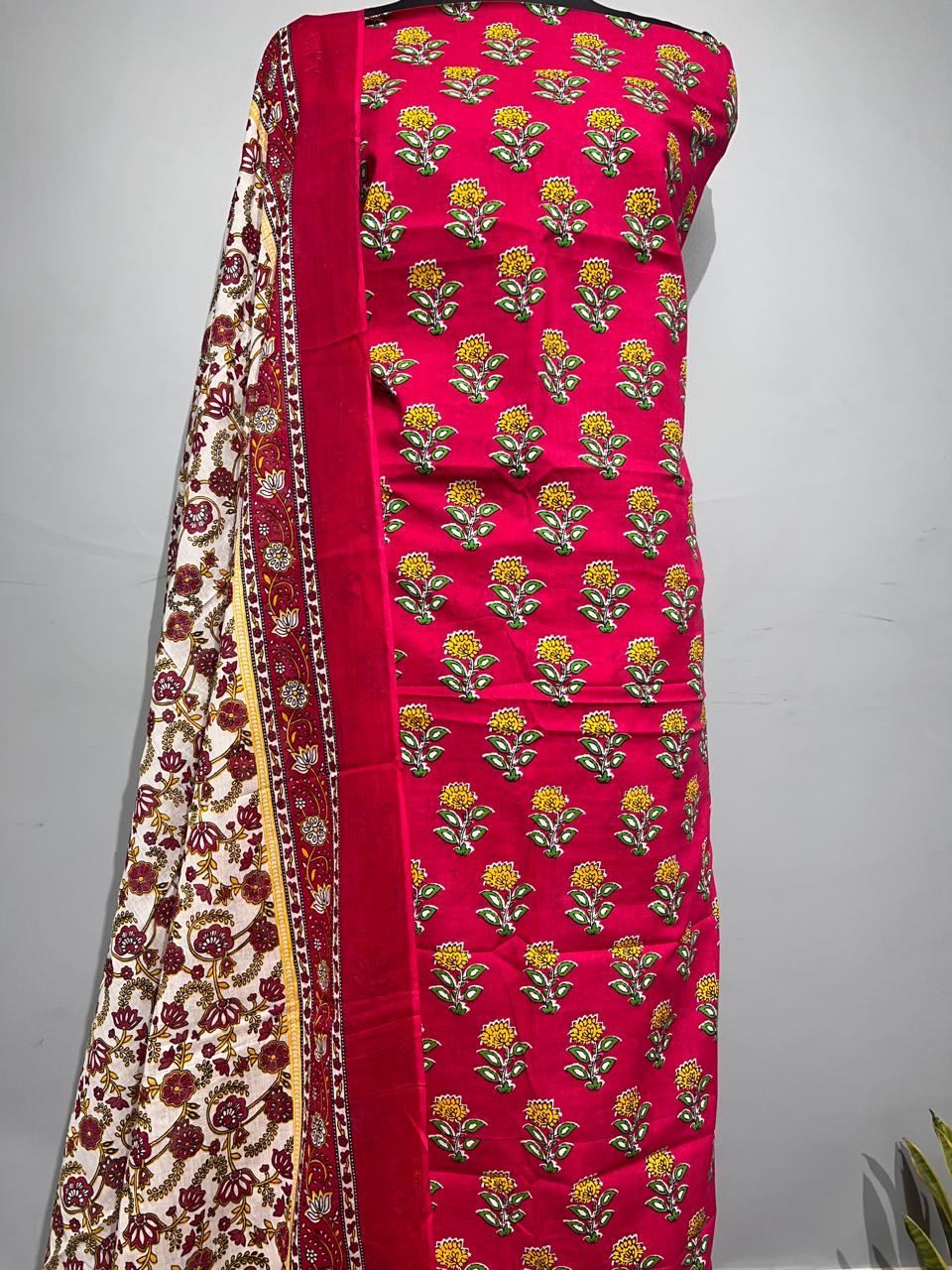 Pure Cotton Hand Block Print Unstitched Suit With Cotton Dupatta.