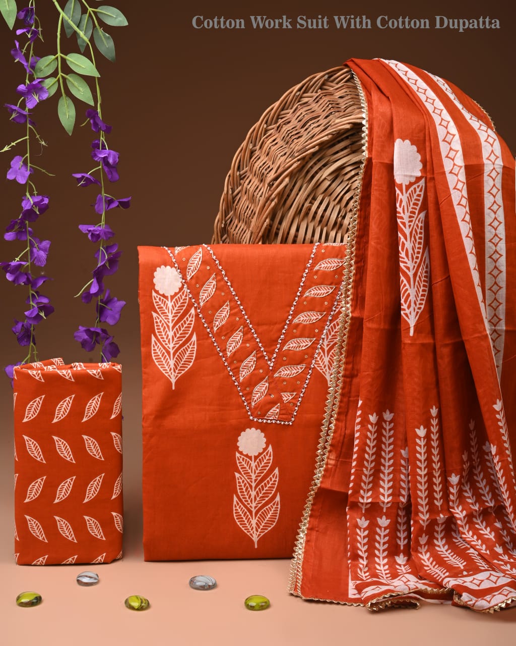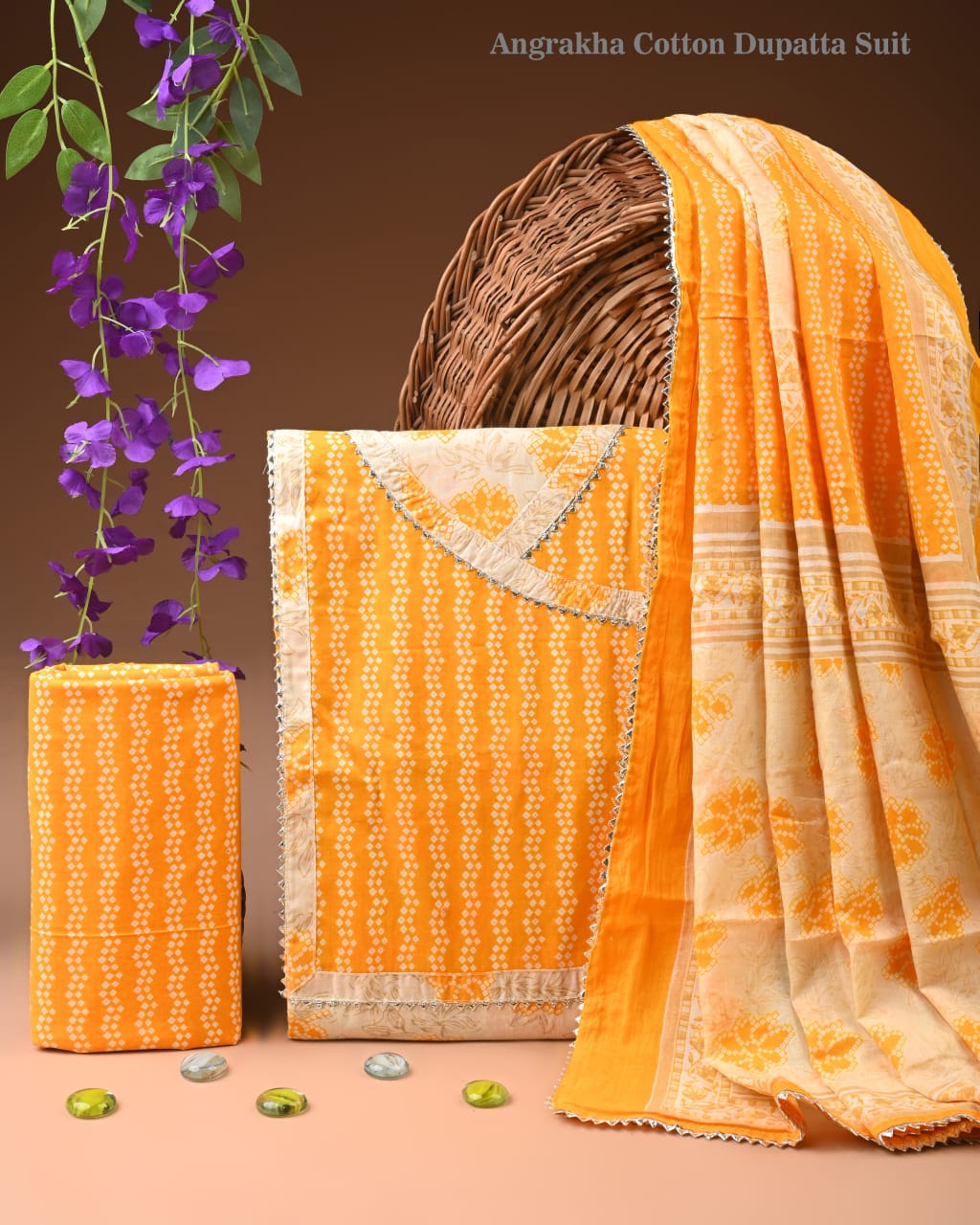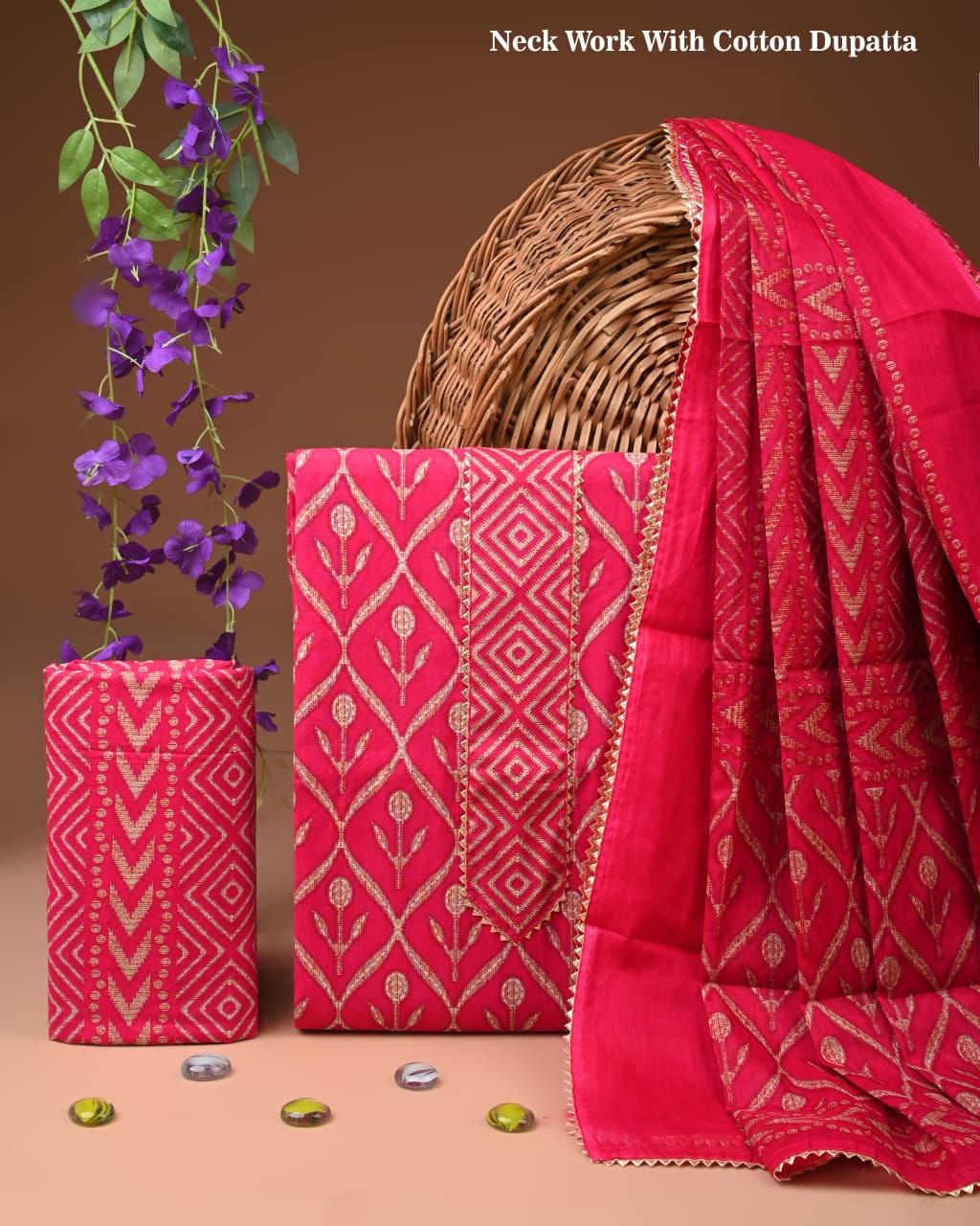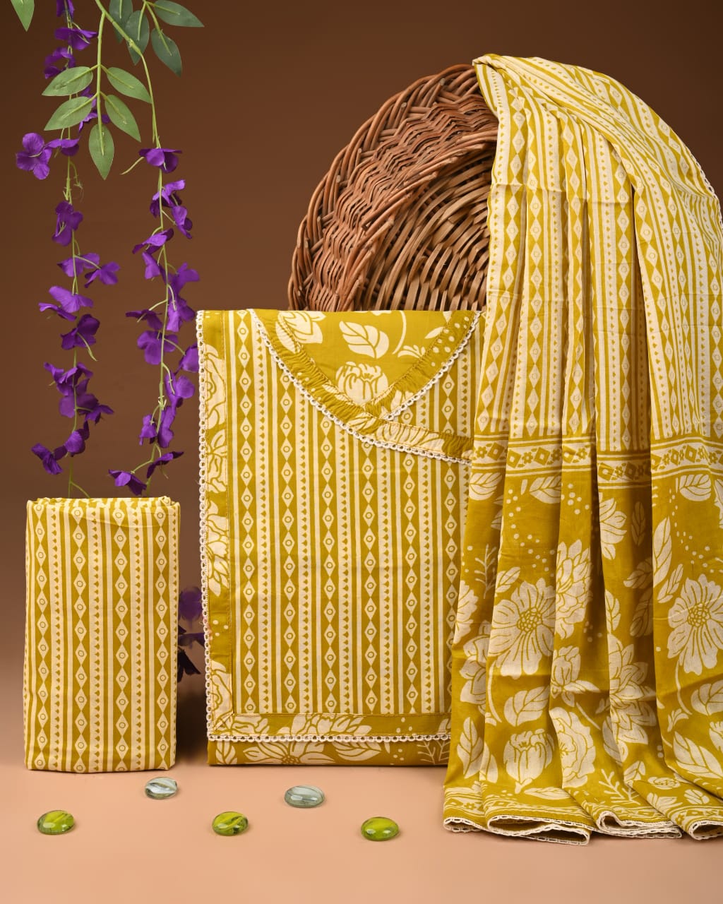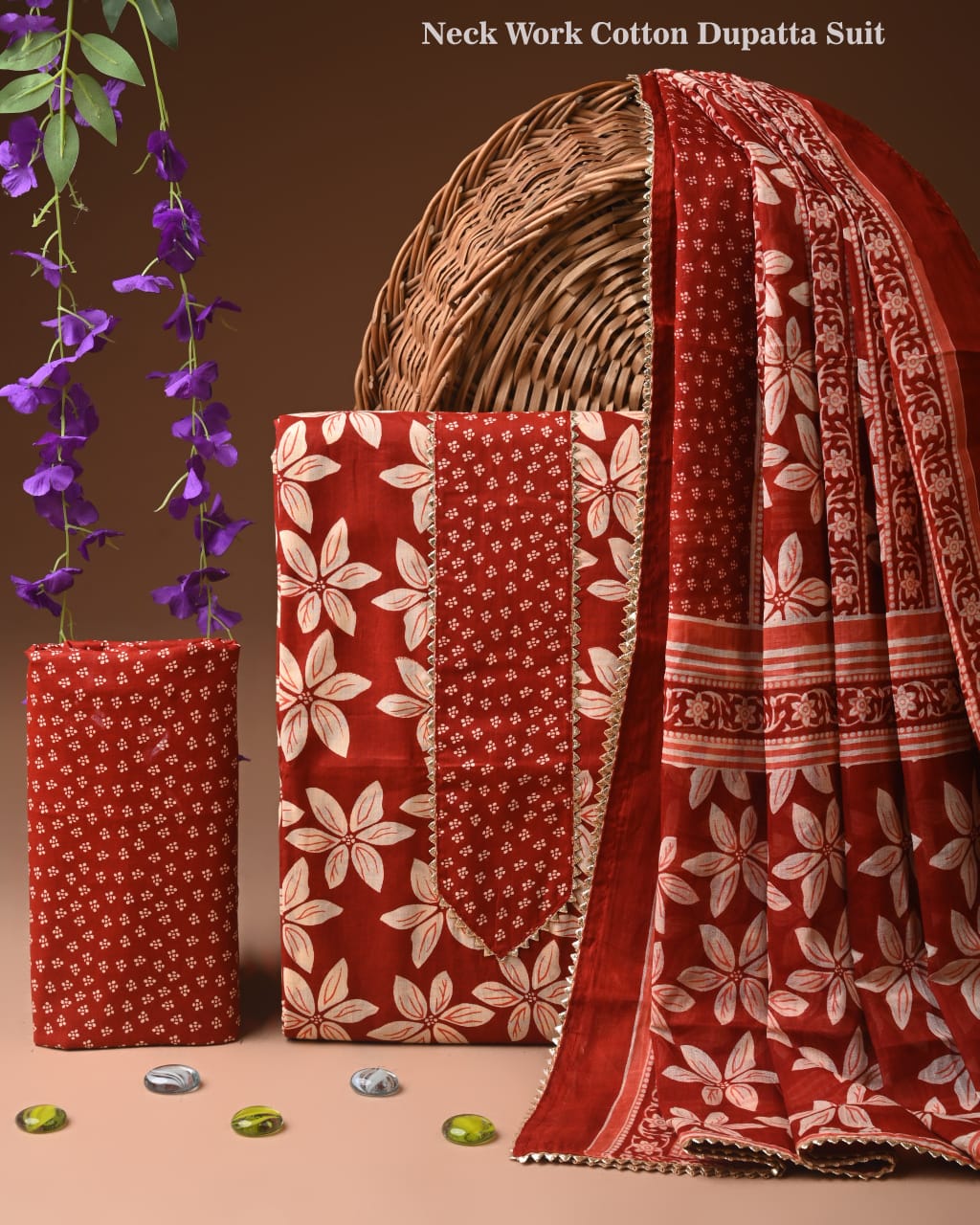 Our Gota Patti unstitched suits are made from breathable, high-quality fabrics like pure cotton, Chanderi, and Kota Doria—all ideal for comfort and festive elegance.