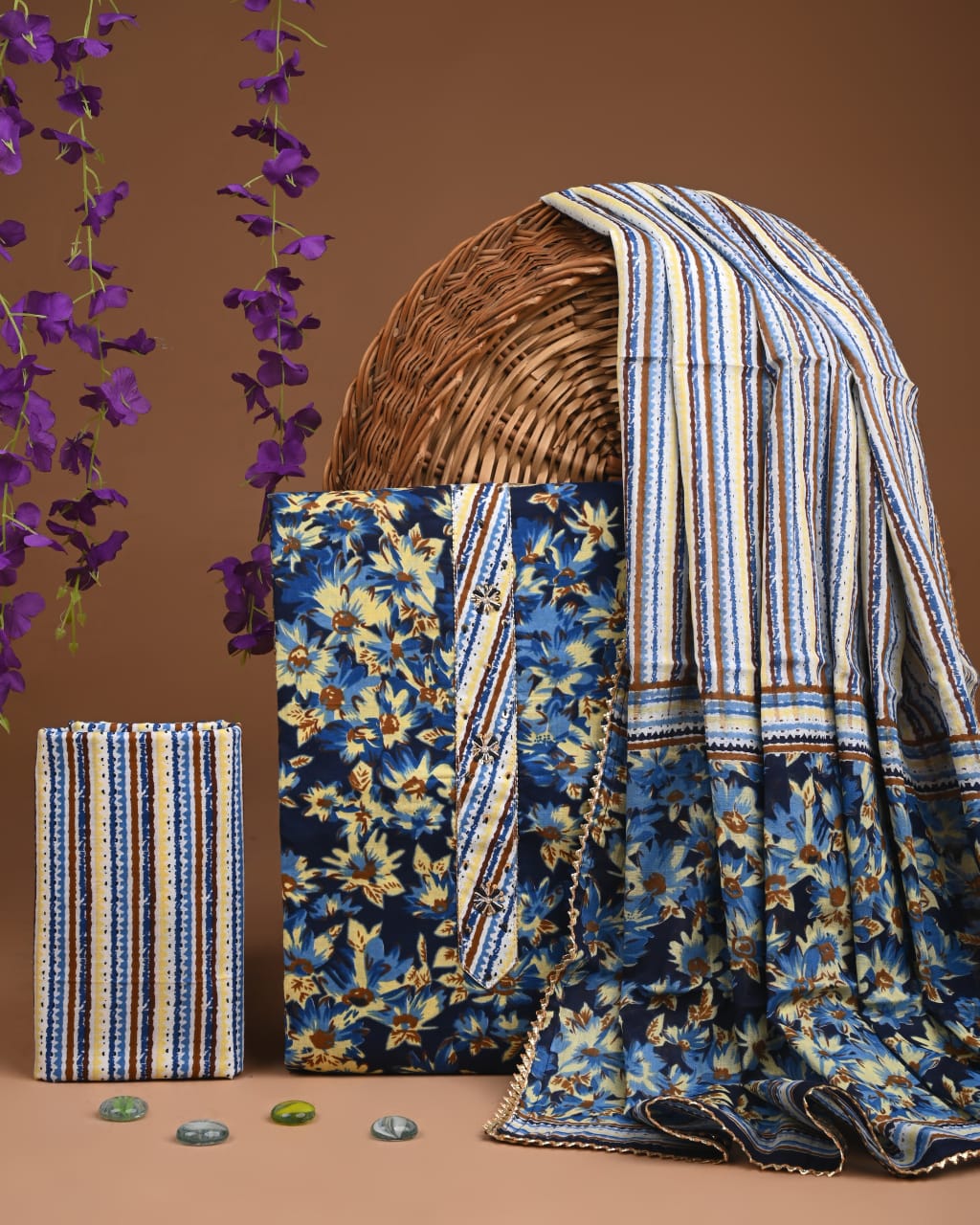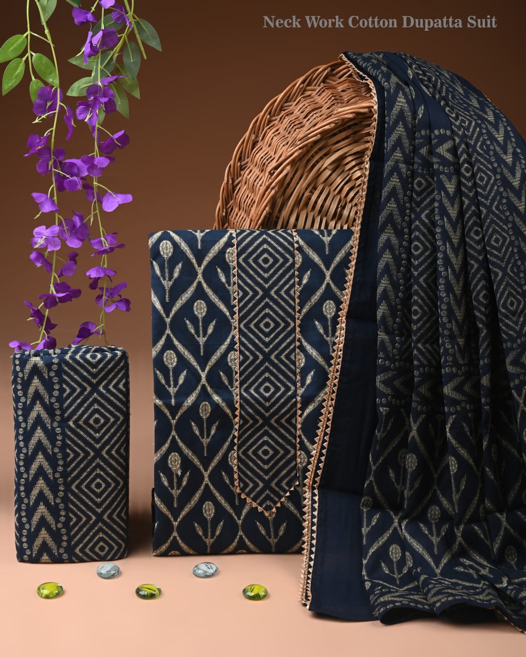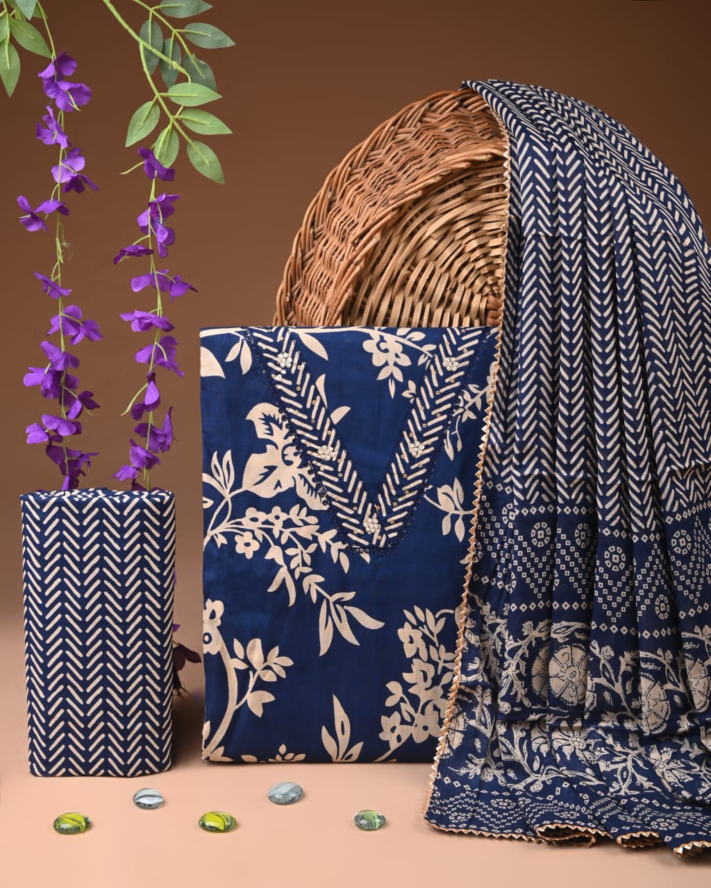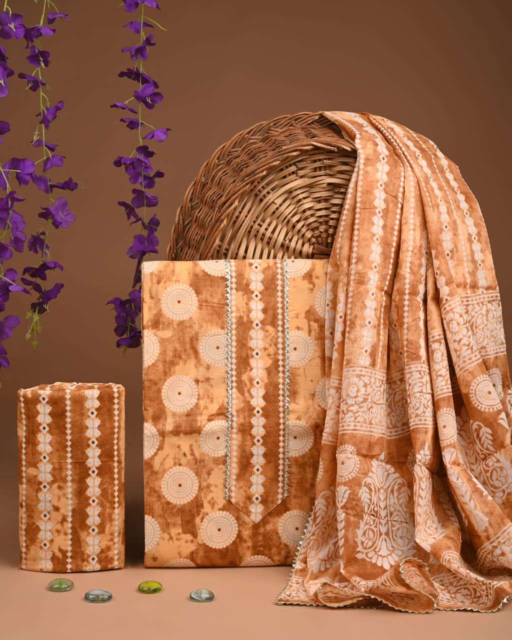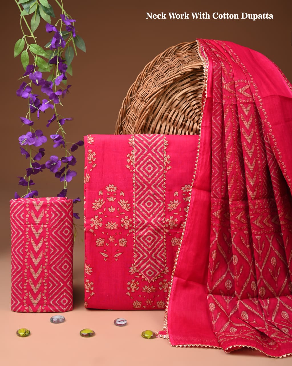 Our Gota Patti unstitched suits are made from breathable, high-quality fabrics like pure cotton, Chanderi, and Kota Doria—all ideal for comfort and festive elegance.