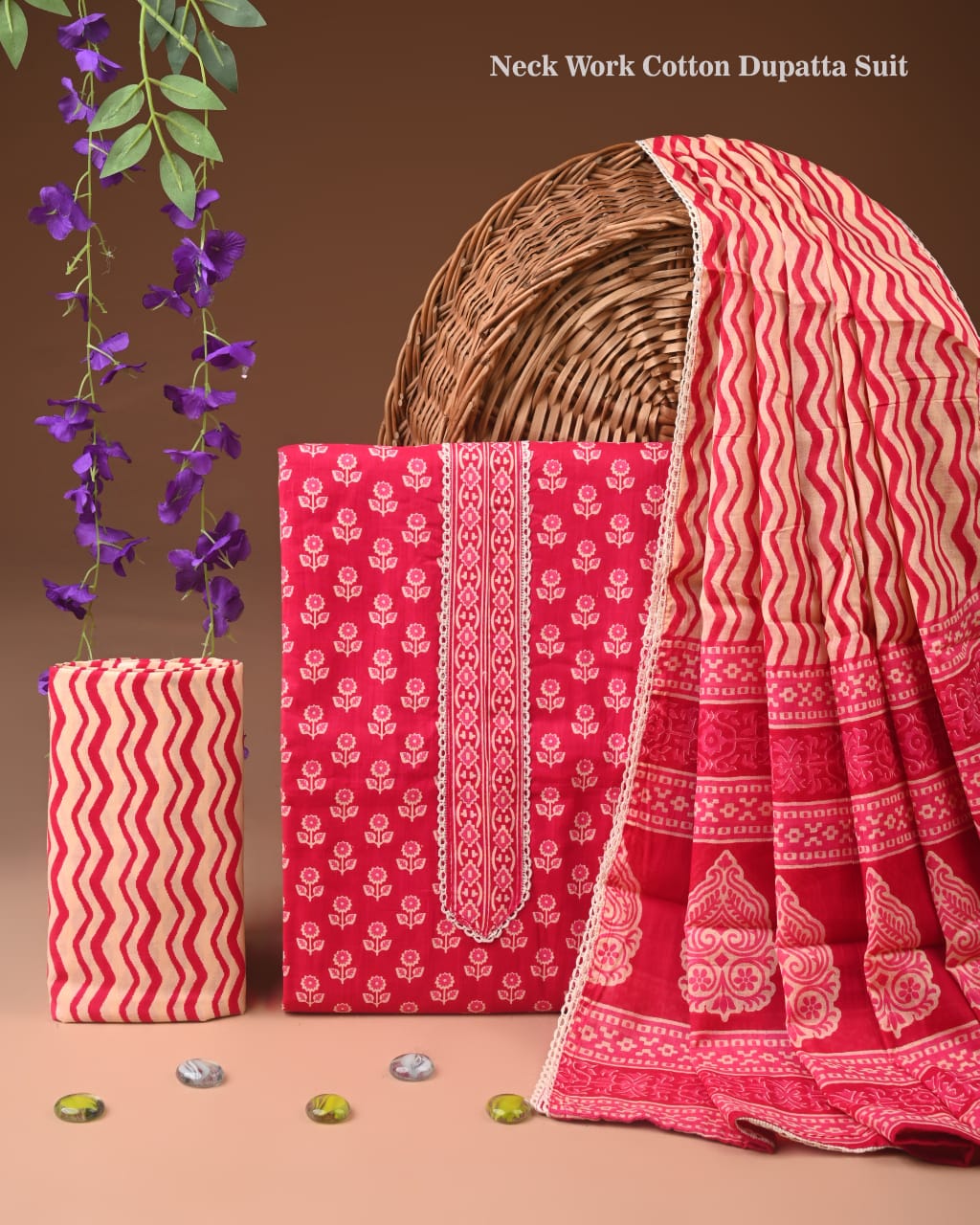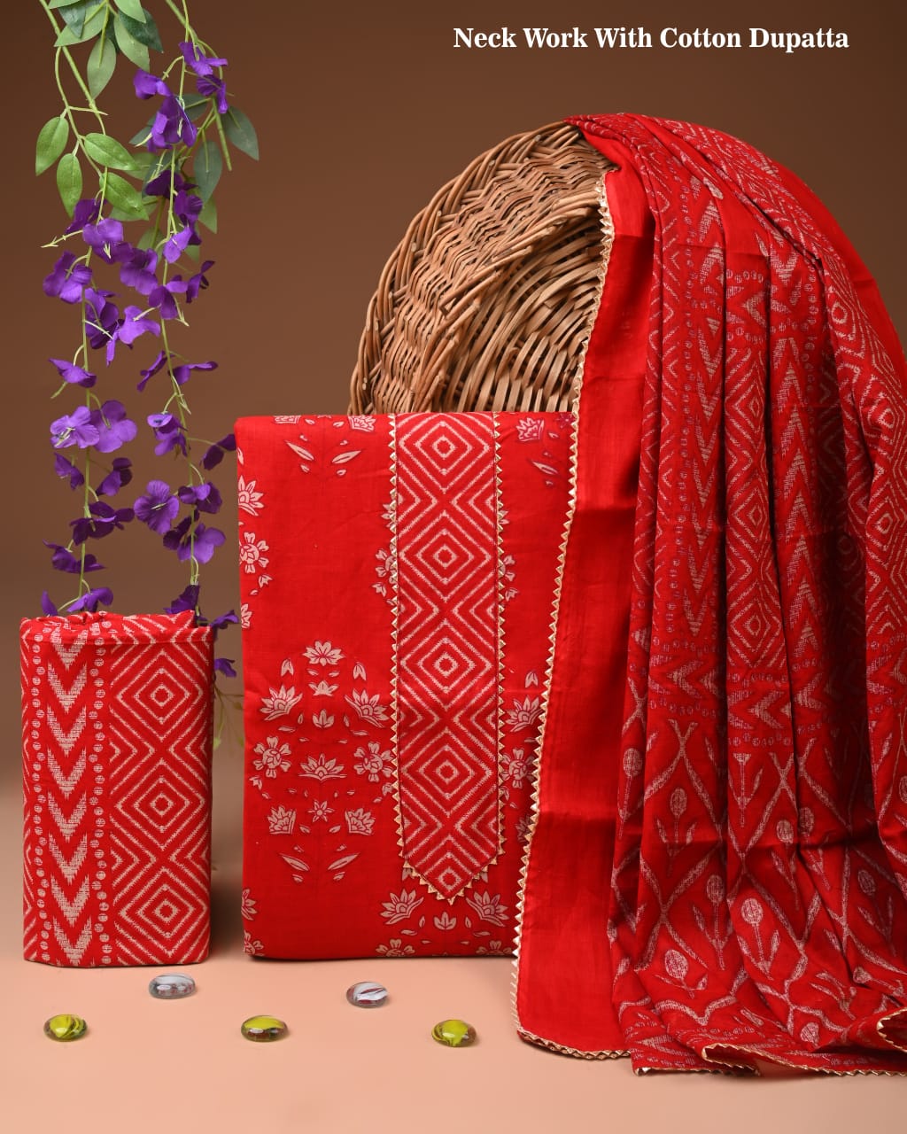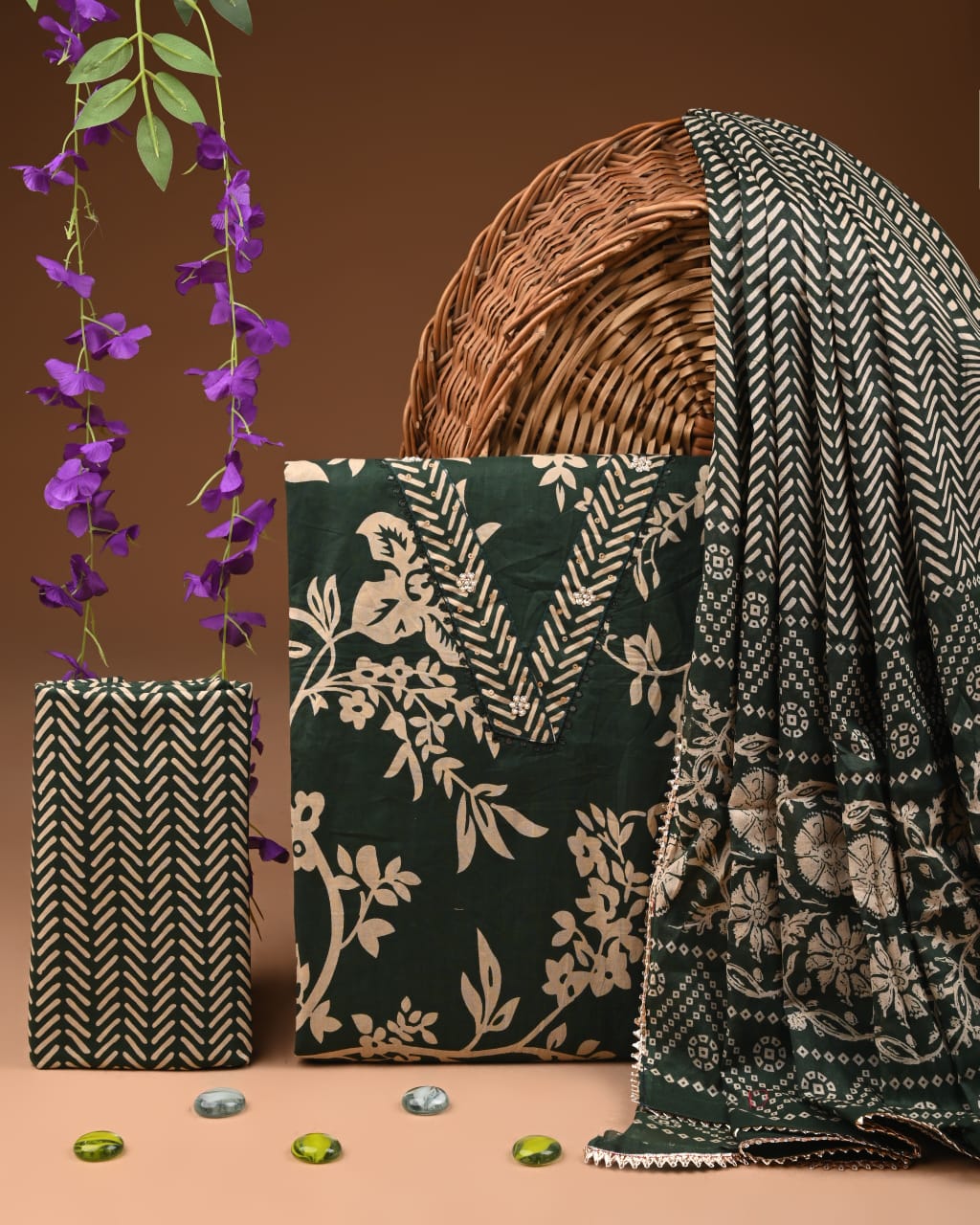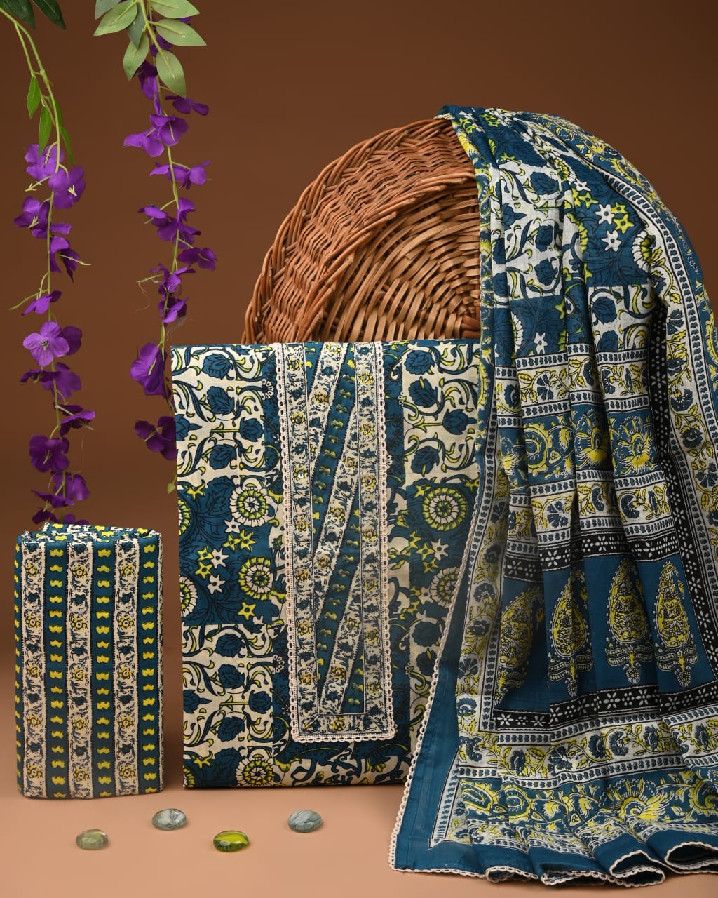 Our Gota Patti unstitched suits are made from breathable, high-quality fabrics like pure cotton, Chanderi, and Kota Doria—all ideal for comfort and festive elegance.