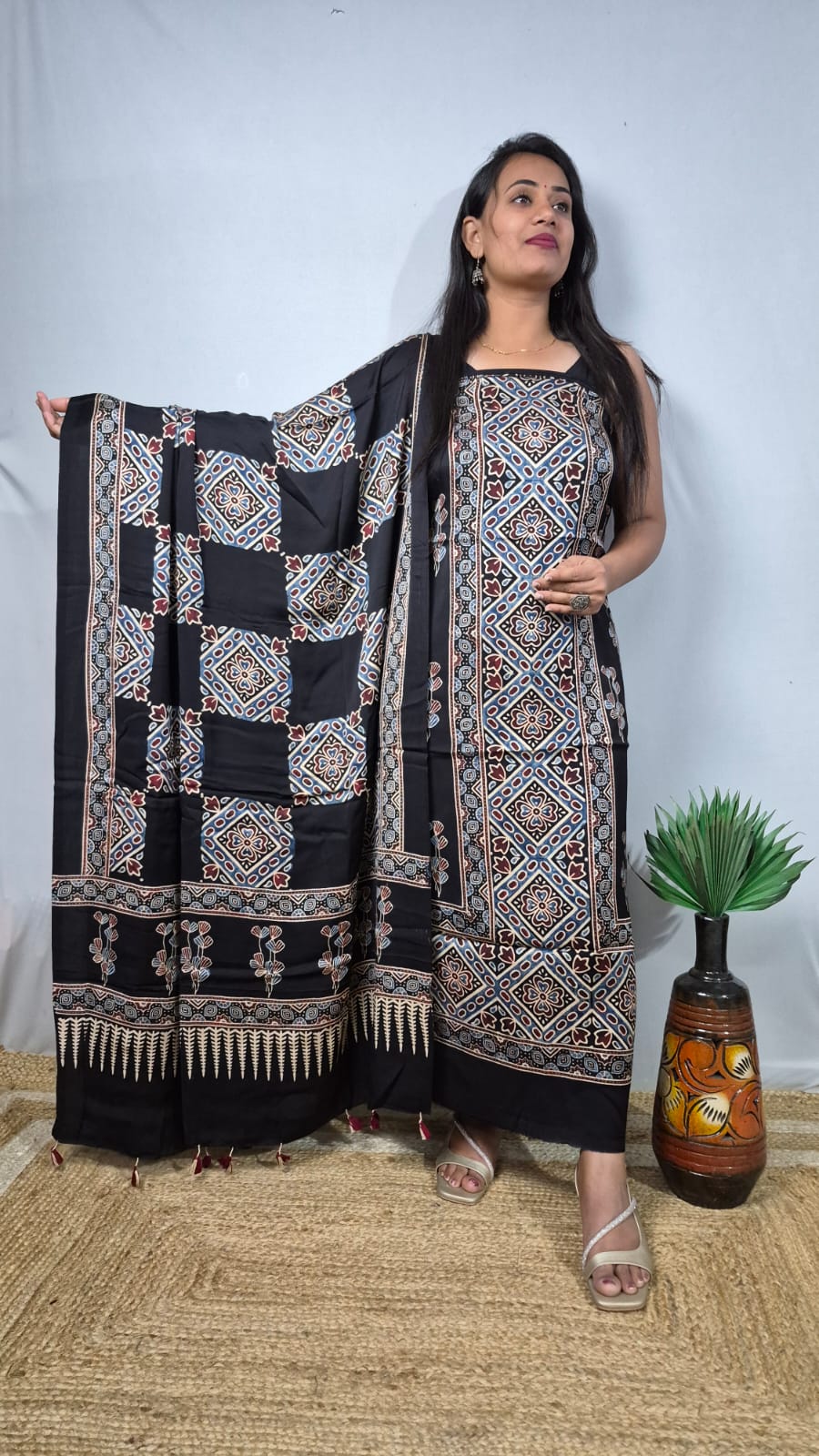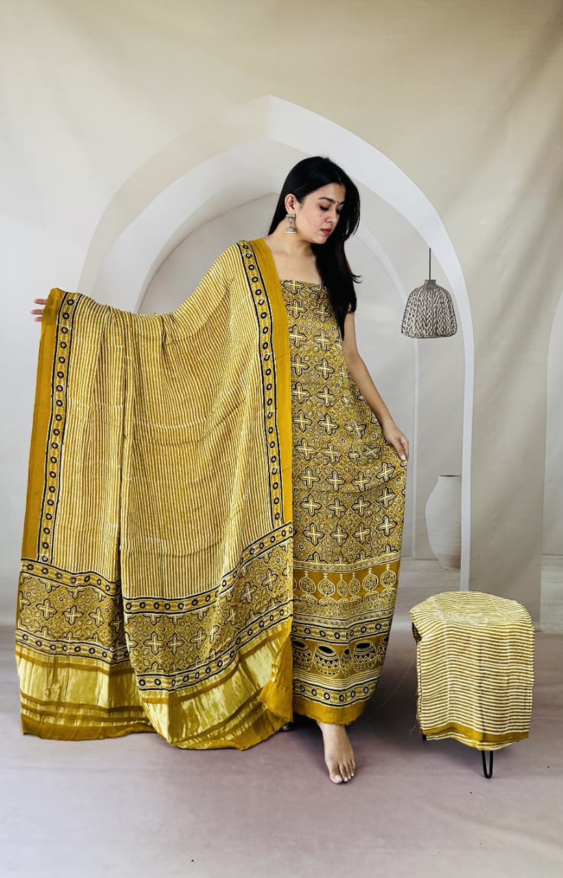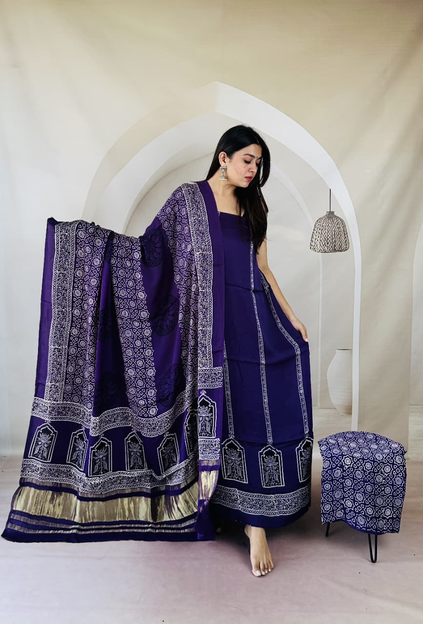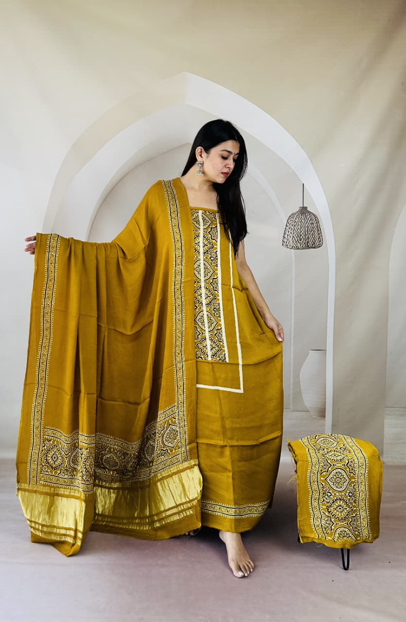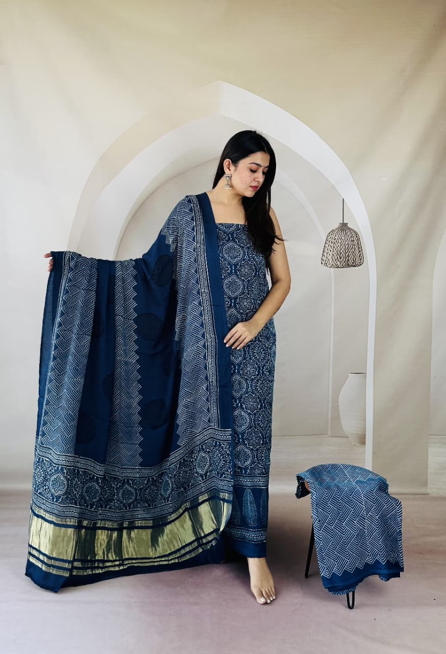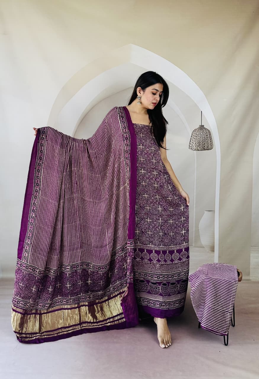 Pure Modal Silk Ajrakh Hend Block Zari Pallu Weaved 3pc Unstitched Suit .