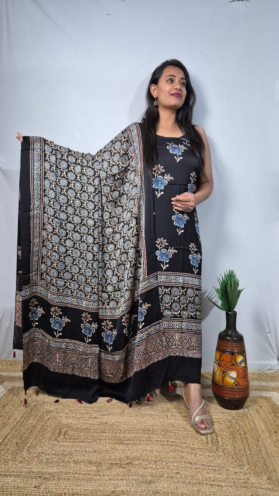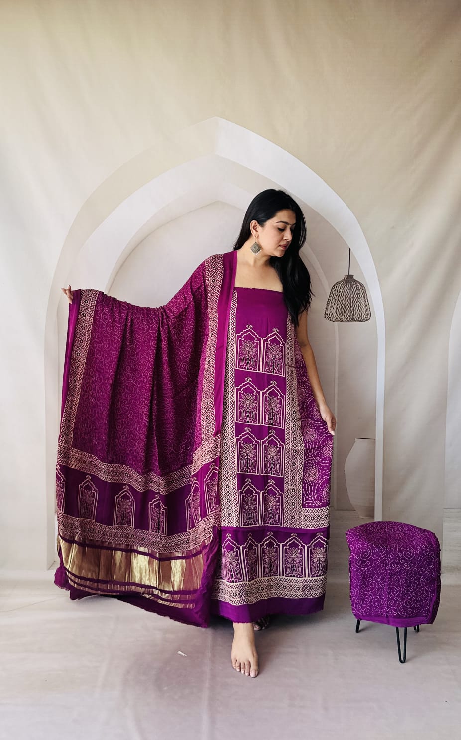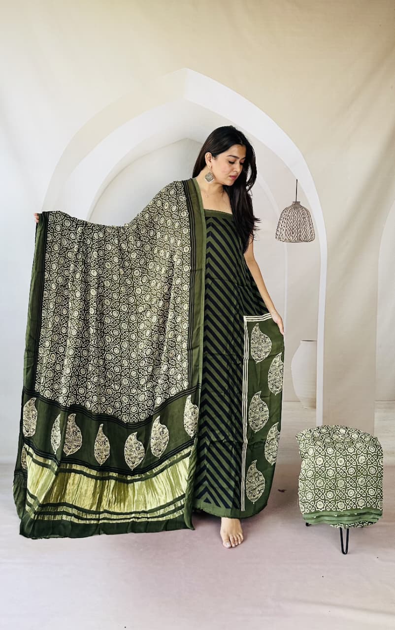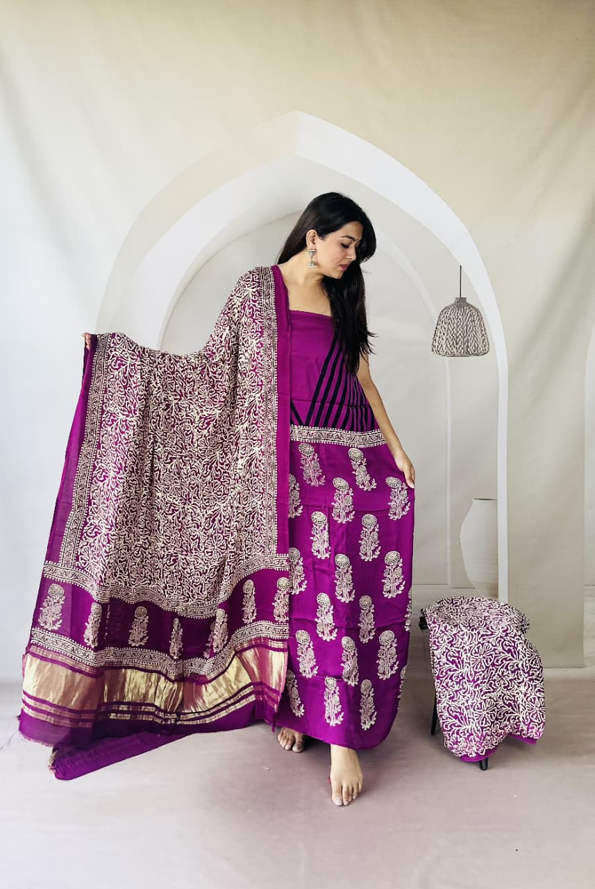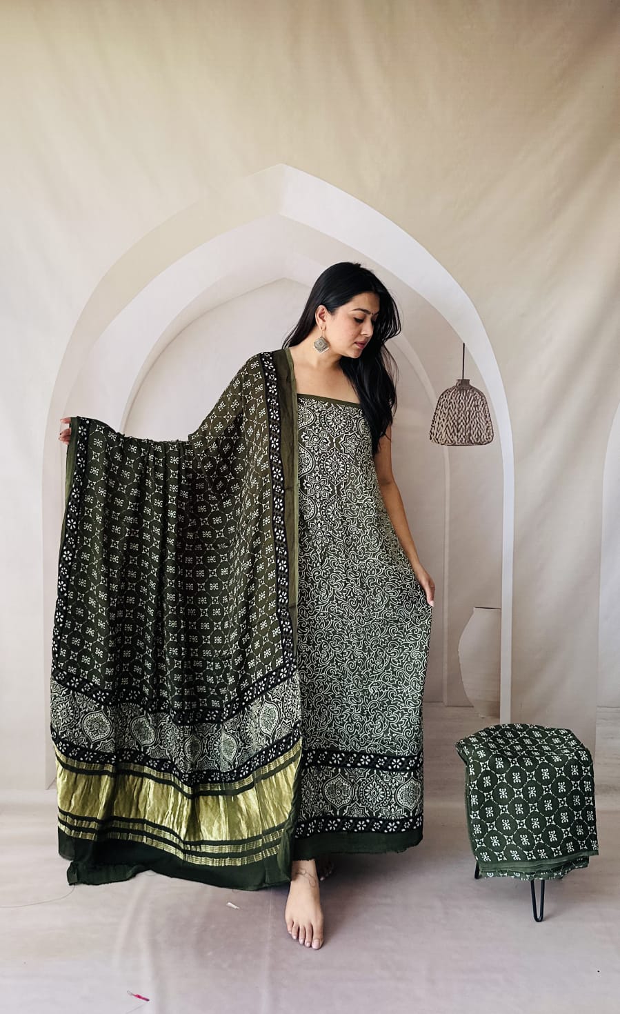 Pure Modal Silk Ajrakh Hend Block Zari Pallu Weaved 3pc Unstitched Suit .