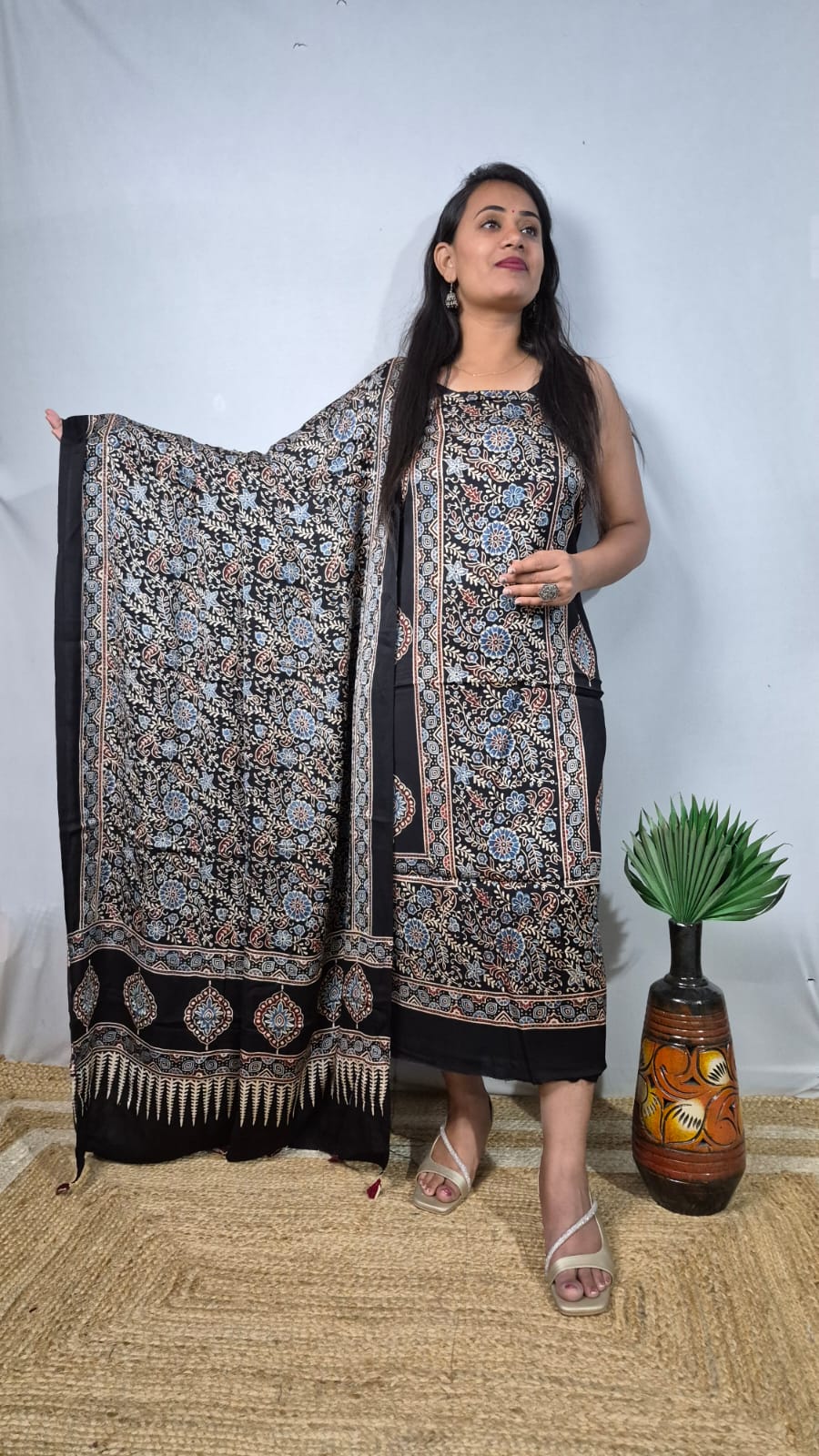 Pure Modal Silk Ajrakh Hand Block Zari Pallu Weaved 3pc Unstitched Suit