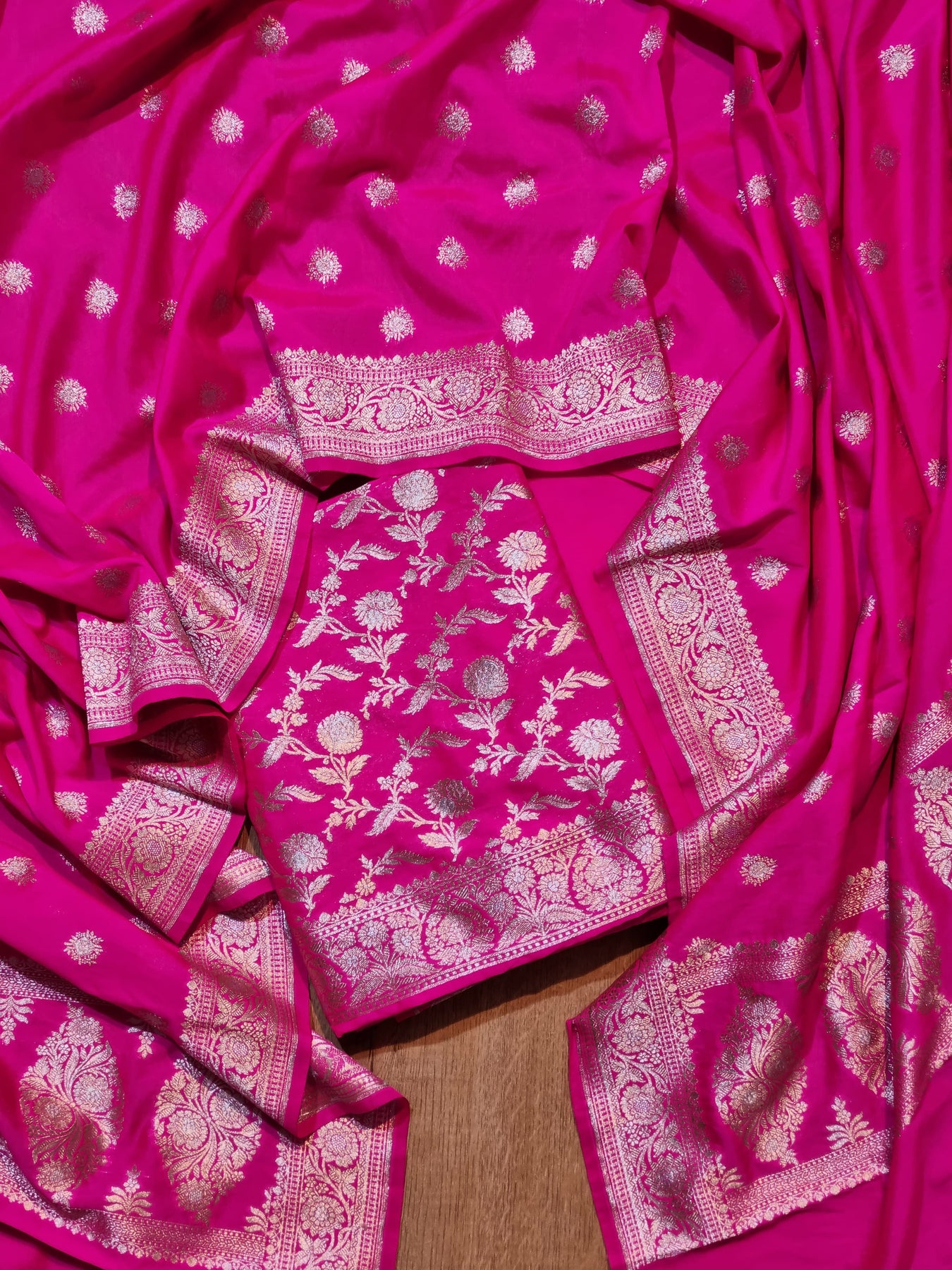 Exclusive Banarasi Katan Alfi Meenadar Unstitched suit with Sona Rupa Zari Work