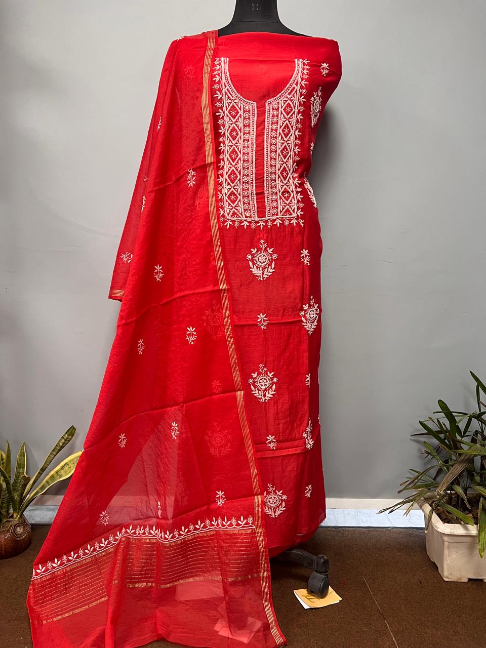 Pure Chanderi Silk Chikankari Hand Work Unstitched Suit.
