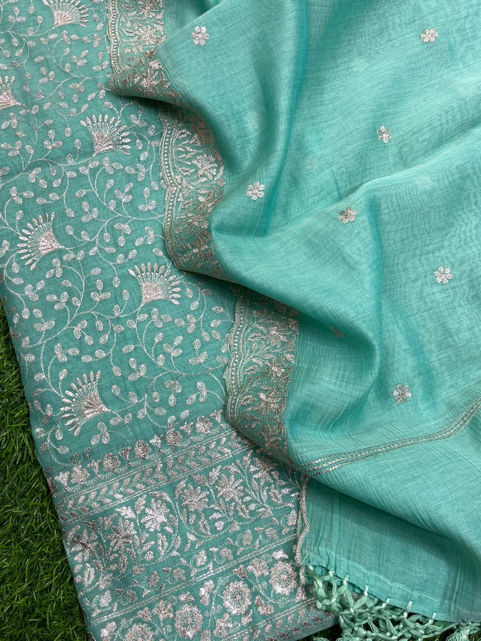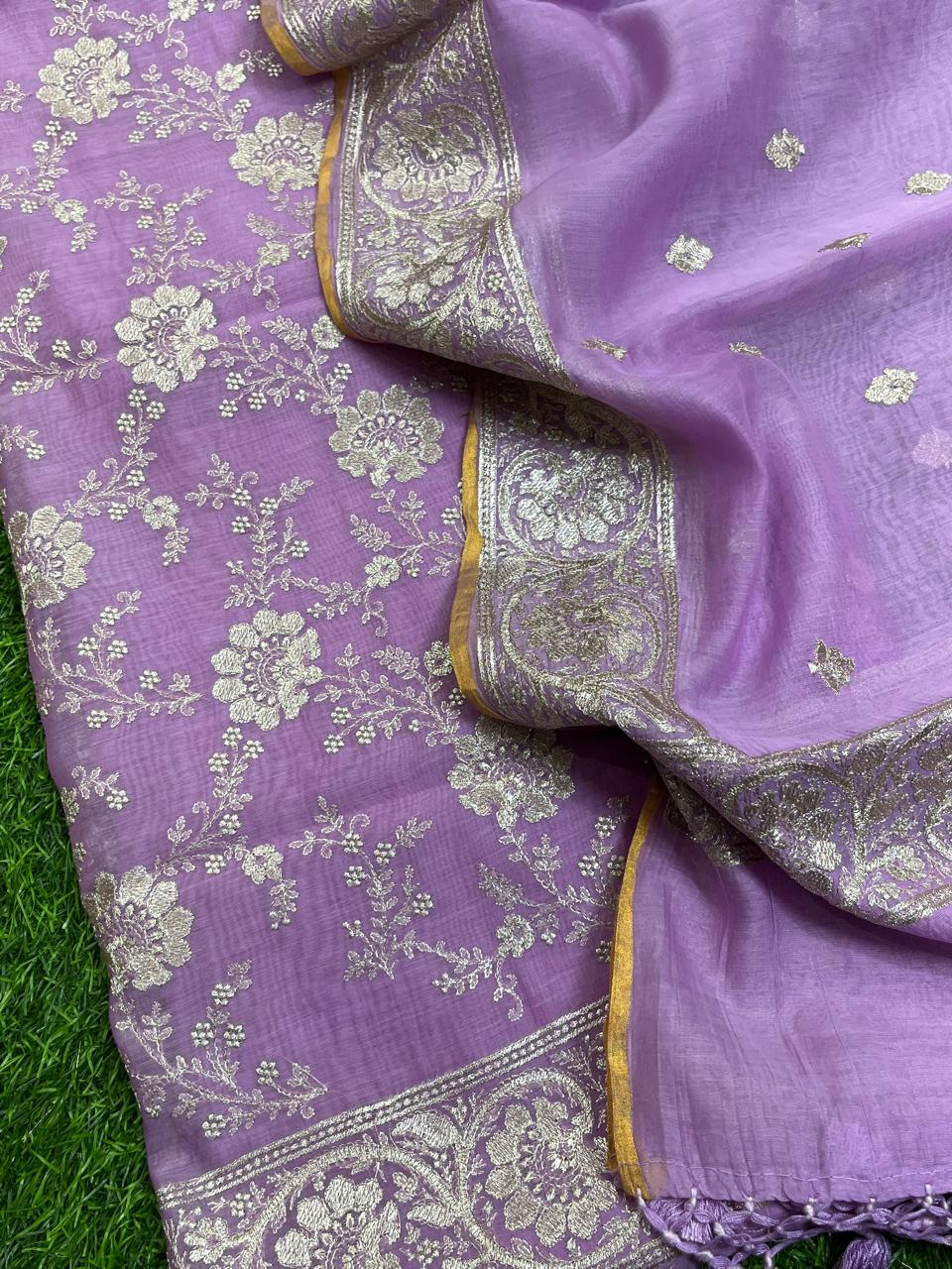 Pure Banarasi Resham Mul-mul Chanderi Embroidery Unstitched Suit .
