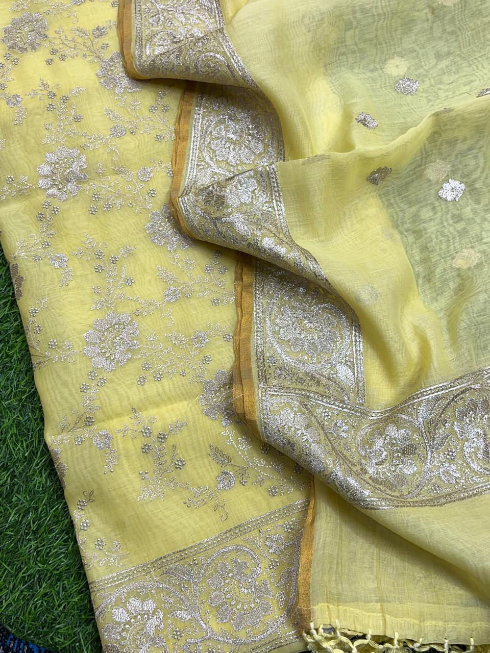 Pure Banarasi Kora Tissue Silk Unstitched Suit with beautiful Neck embeoidery | LIMITED EDITION |