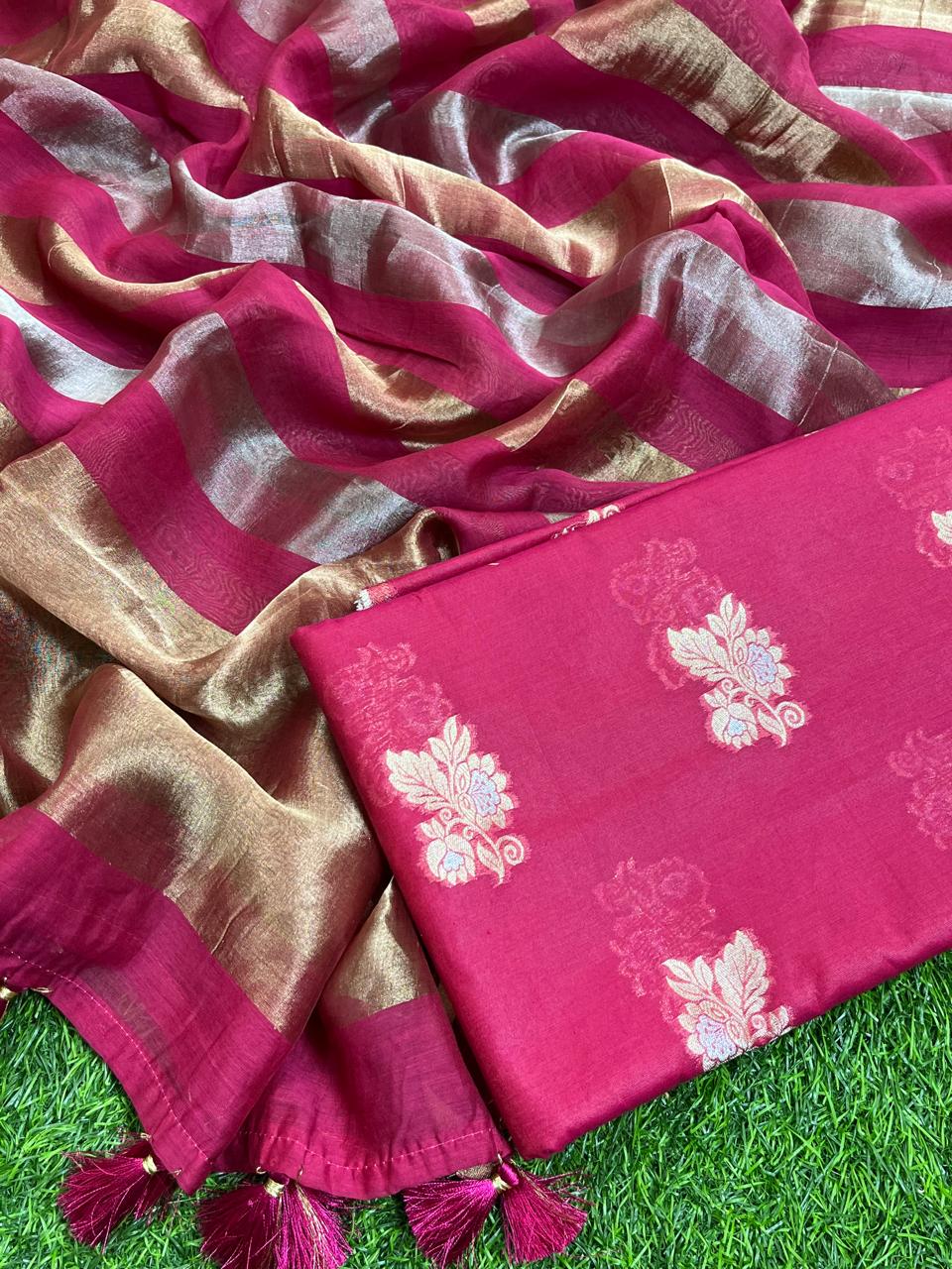 Pure Banarasi Mercerized Chanderi Zari Buti Weaved Unstitched Suit With Pure Mercerized Chanderi Zari Weaved Dupatta.
