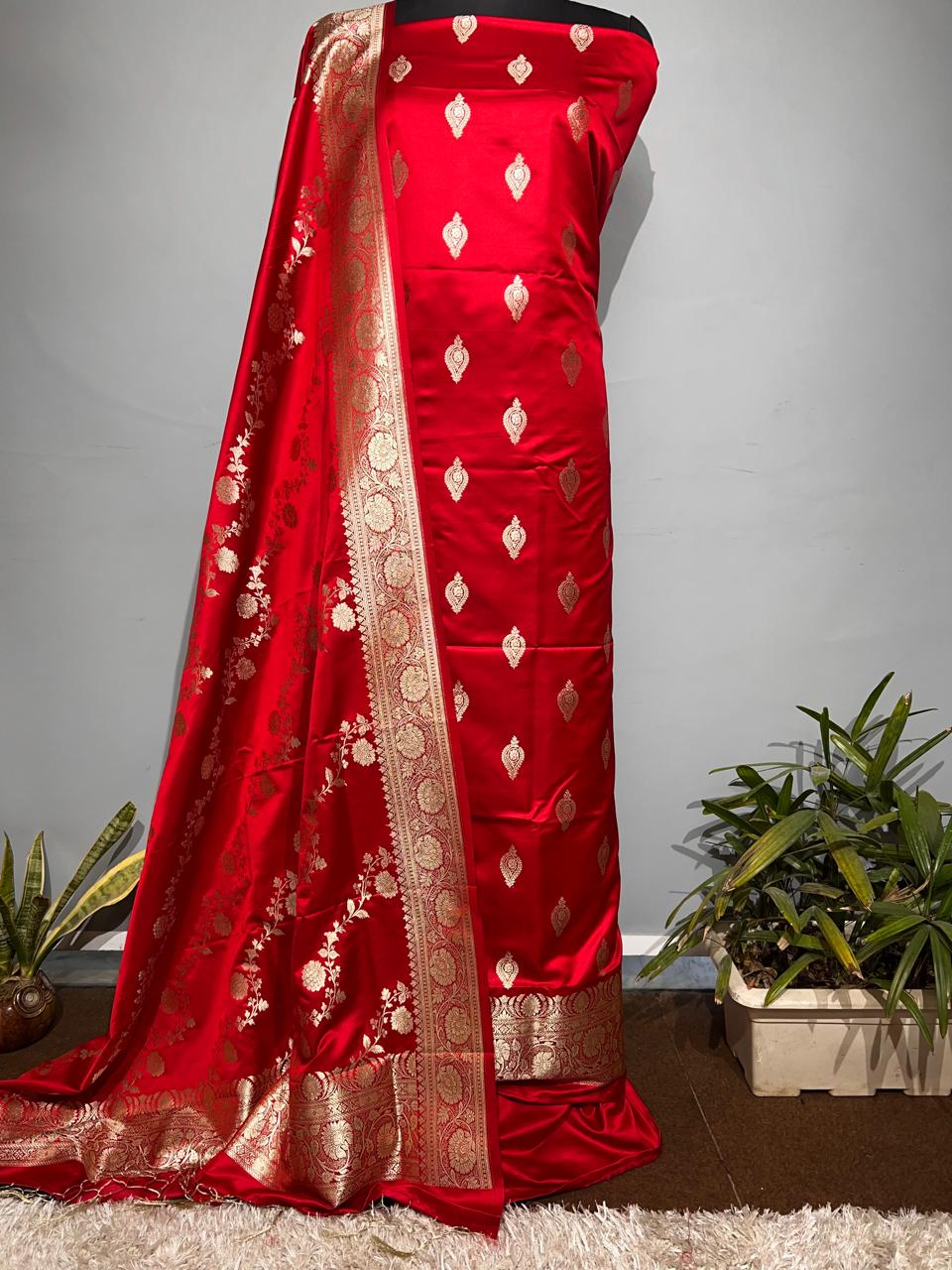 Pure Banarasi Satin Silk Zari Work Unstitched Suit With Jaal Work Dupatta.