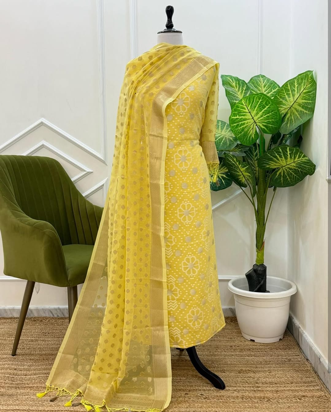 Elevate your ethnic wardrobe with this exquisite Banarasi Chiffon Georgette unstitched suit, a masterpiece that seamlessly blends traditional craftsmanship with contemporary elegance. The luxurious chiffon and georgette fabric combination offers a graceful drape and breathable comfort, perfect for both festive occasions and everyday sophistication. Featuring authentic Banarasi weaving techniques, this suit showcases intricate detailing that reflects timeless artistry. The unstitched format allows complete customization—tailor it to your precise measurements and personal style preferences. Ideal for those who appreciate quality textiles and bespoke tailoring, this versatile piece transforms into a stunning kurta, saree, or dress. A wardrobe essential that celebrates Indian heritage with refined aesthetics.