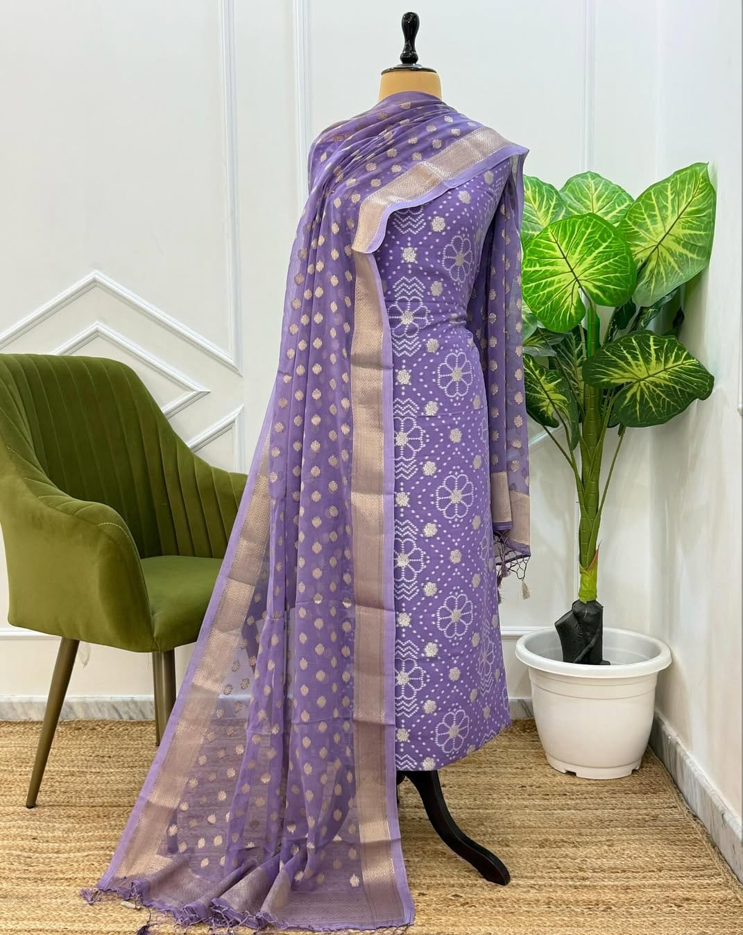 Elevate your ethnic wardrobe with this exquisite Banarasi Chiffon Georgette unstitched suit, a masterpiece that seamlessly blends traditional craftsmanship with contemporary elegance. The luxurious chiffon and georgette fabric combination offers a graceful drape and breathable comfort, perfect for both festive occasions and everyday sophistication. Featuring authentic Banarasi weaving techniques, this suit showcases intricate detailing that reflects timeless artistry. The unstitched format allows complete customization—tailor it to your precise measurements and personal style preferences. Ideal for those who appreciate quality textiles and bespoke tailoring, this versatile piece transforms into a stunning kurta, saree, or dress. A wardrobe essential that celebrates Indian heritage with refined aesthetics.