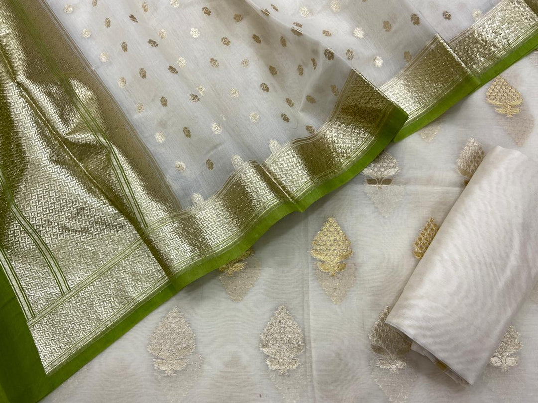 For a more contemporary style, discover our elegant Banarasi organza silk suits, offering a light and lovely look with a modern twist. Our Banarasi silk suits are made to help you look beautiful and special.
