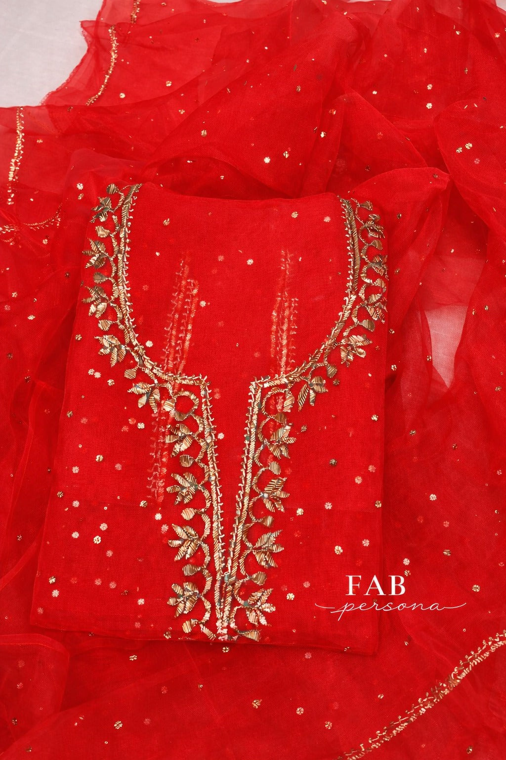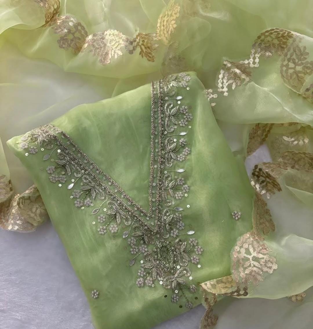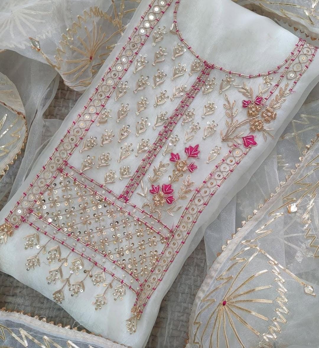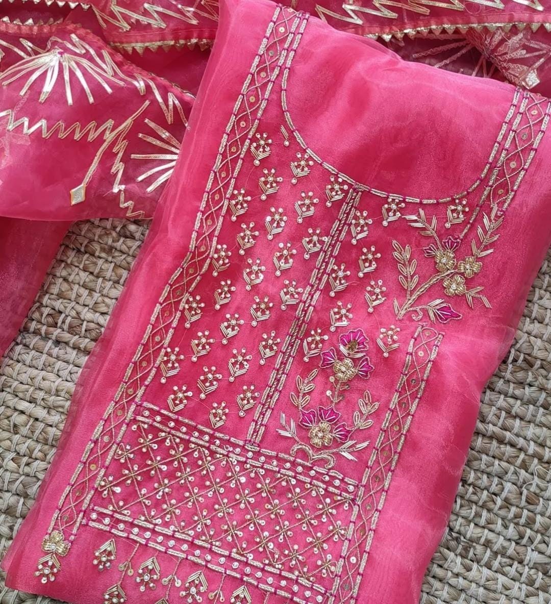 Organza Hand Zardosi work unstitched kurta with Organza Gotta patti Work Dupatta.