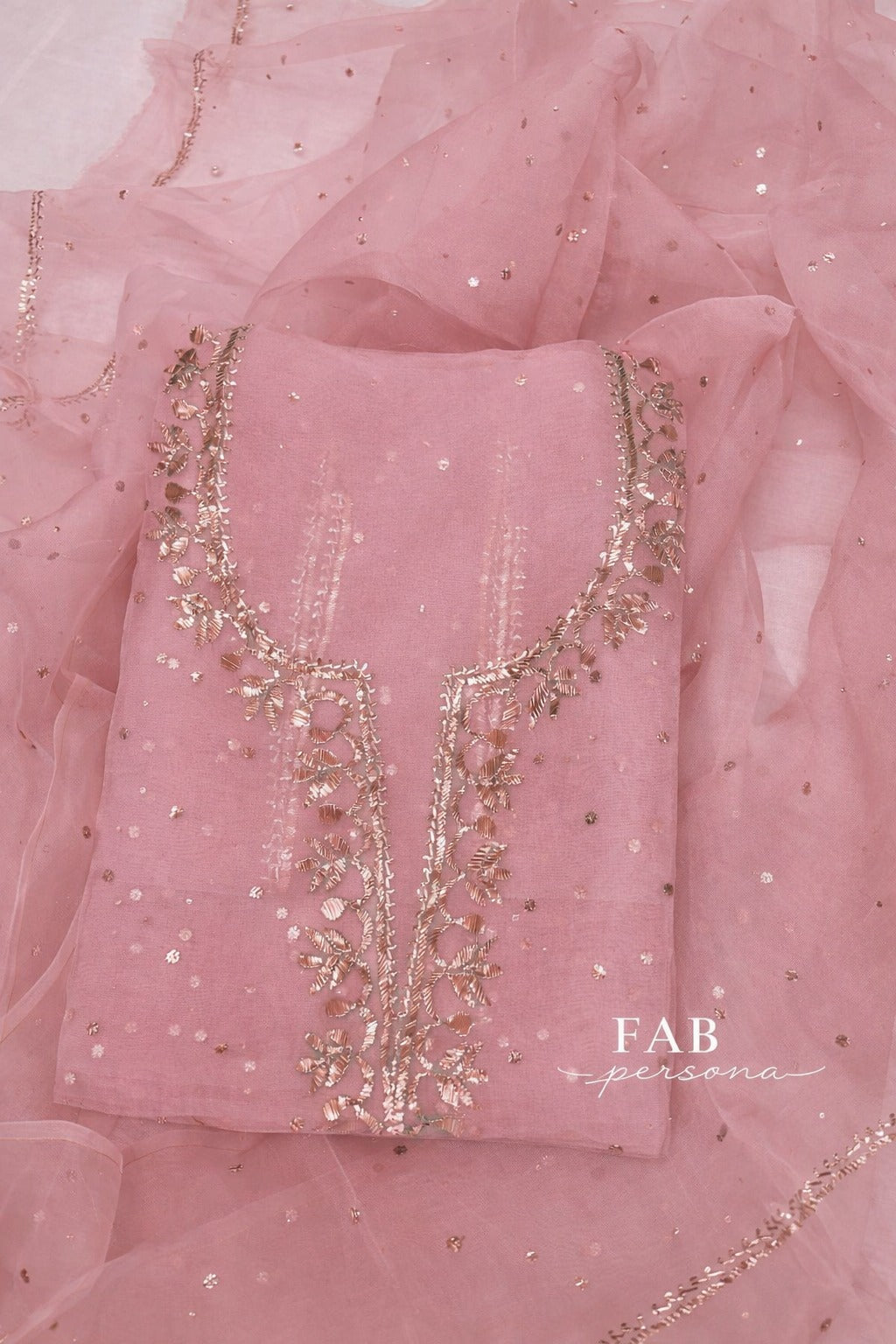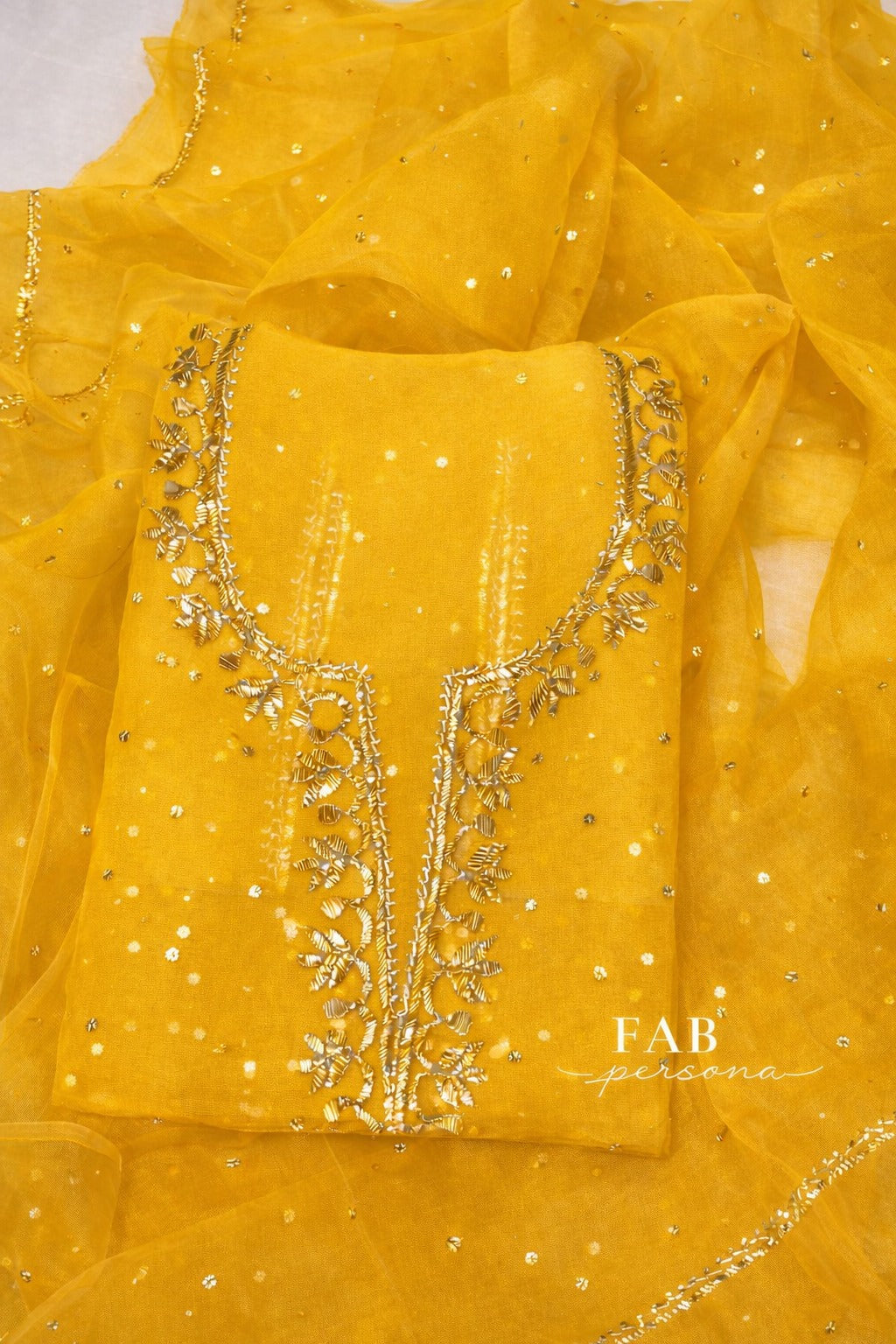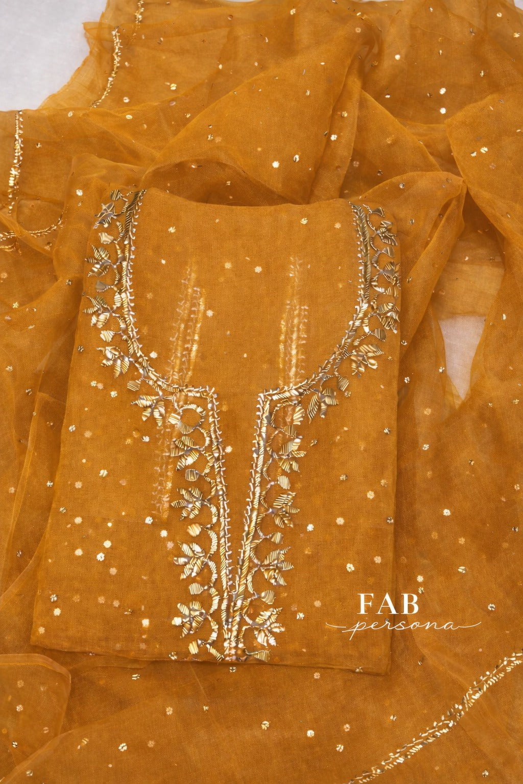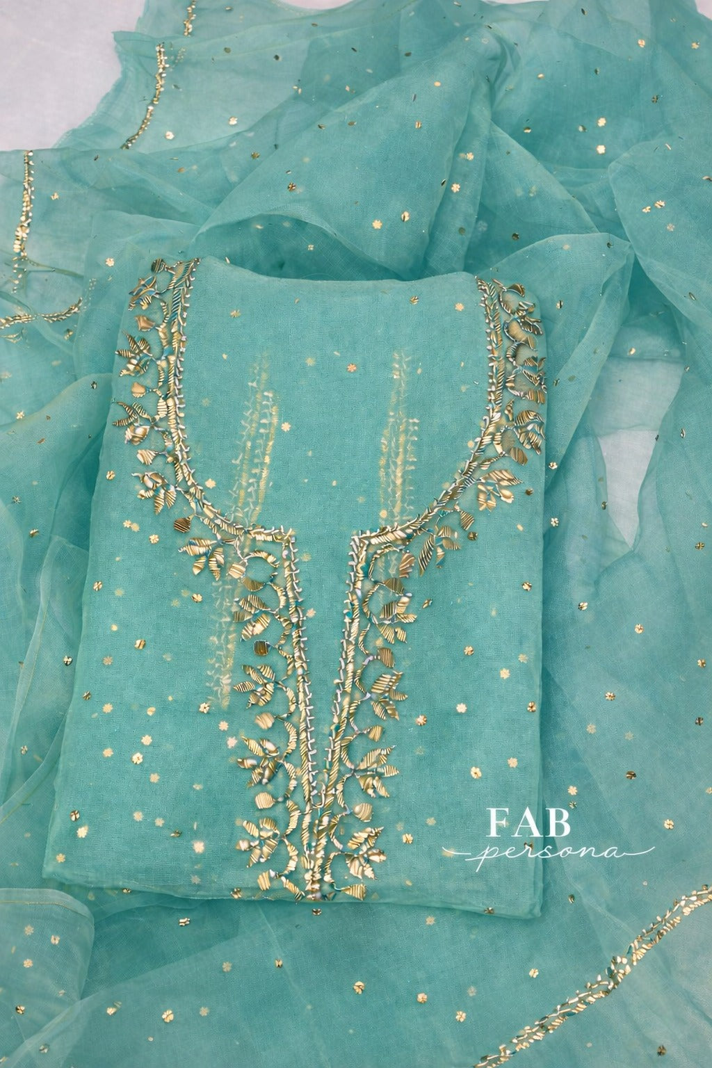 Organza Hand Zardosi work unstitched kurta with Organza Gotta patti Work Dupatta.