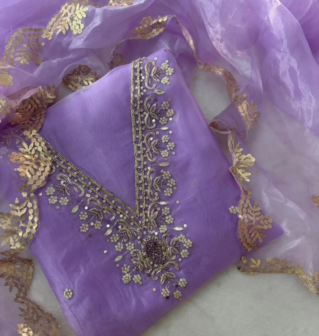 Organza Hand work unstitched kurta and dupatta with zardosi work