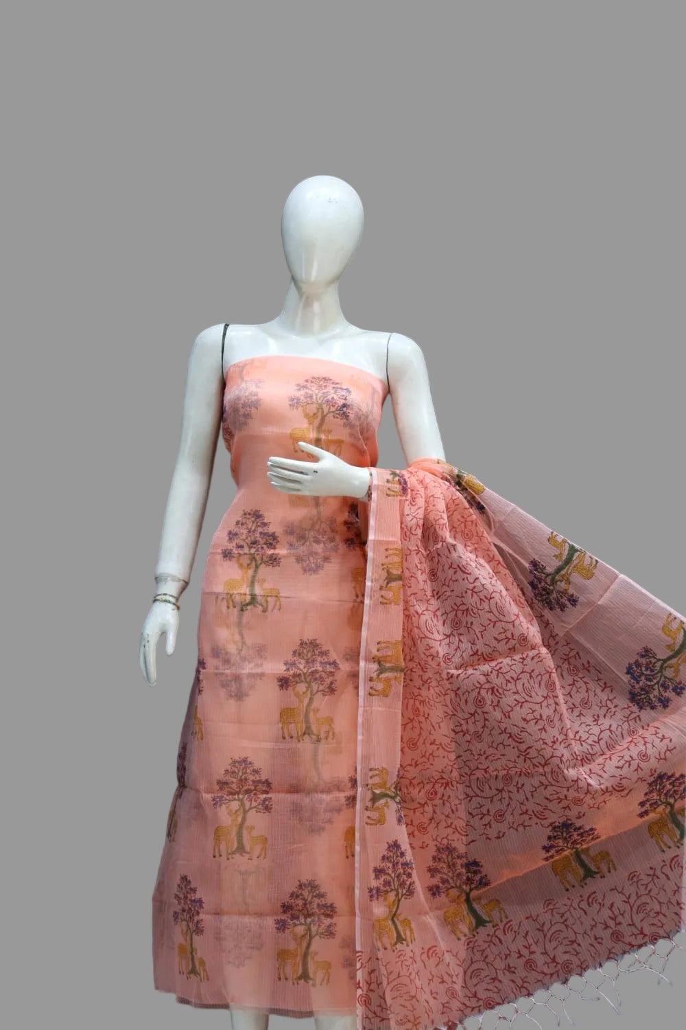 Organza Hand Brush Print Work 3pc Unstitched Suit with Kota Doria Dupatta |PEACH|