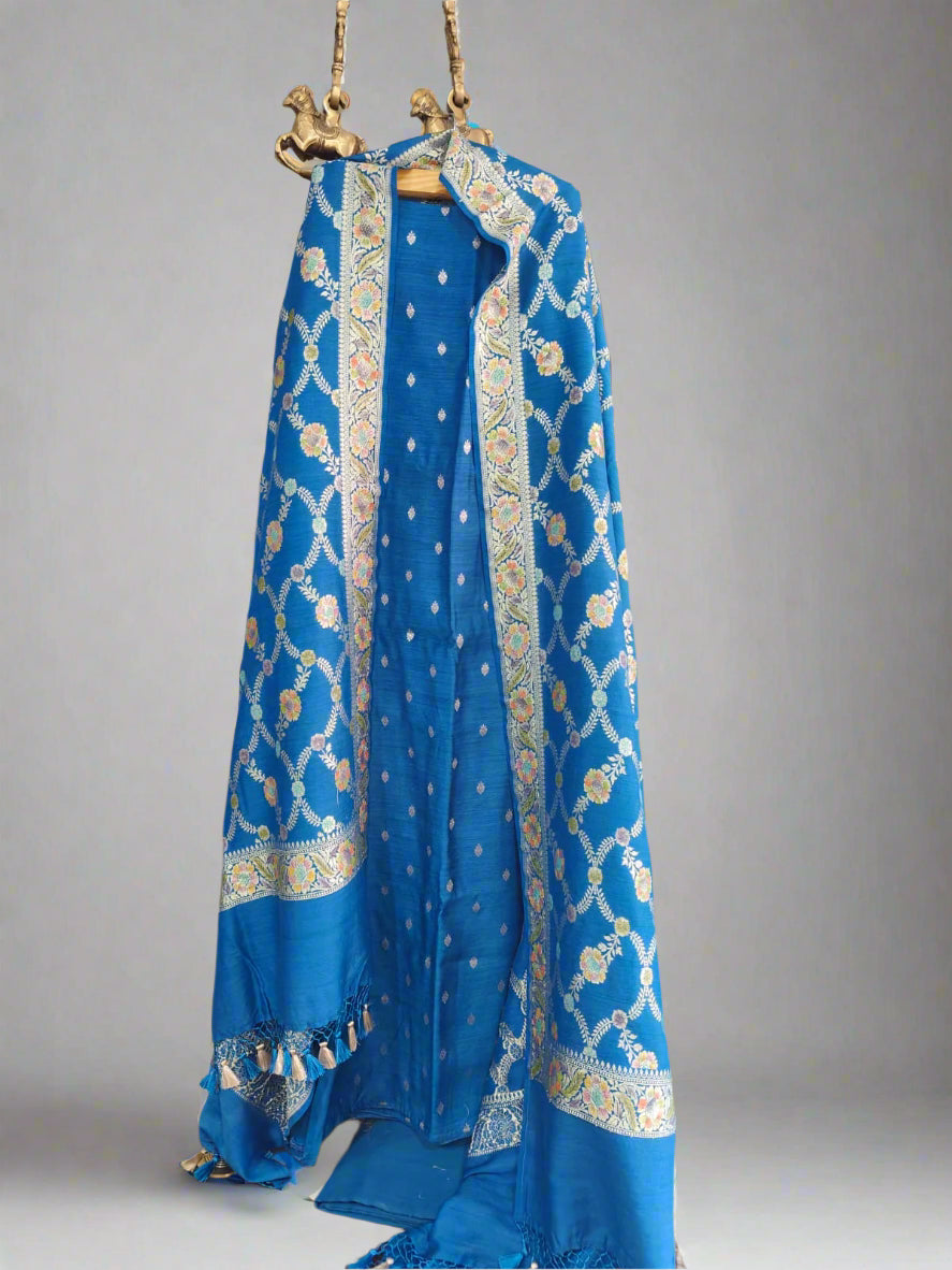 Expertly handloom weaved with premium quality munga silk, this 3pc unstitched suit is a luxurious addition to any wardrobe. The zari weaved brush paint munga dupatta adds a touch of elegance to this traditional ensemble. Experience the softness and durability of pure munga silk for yourself.
