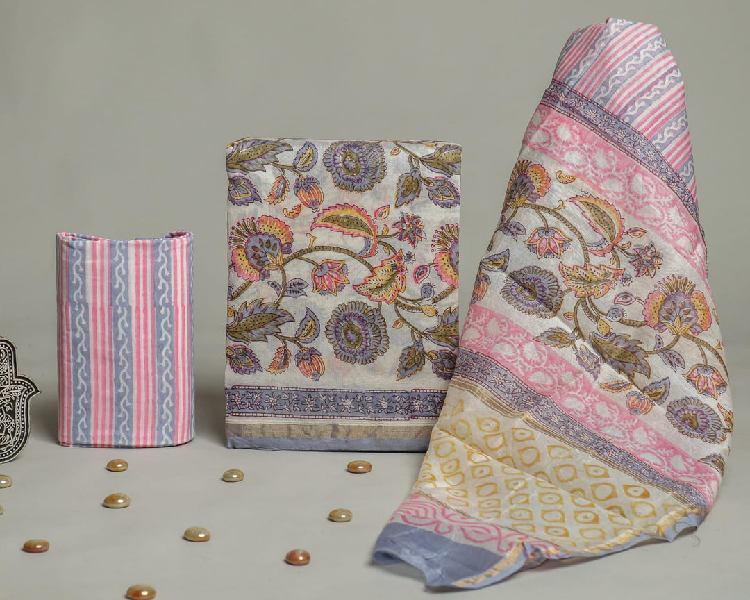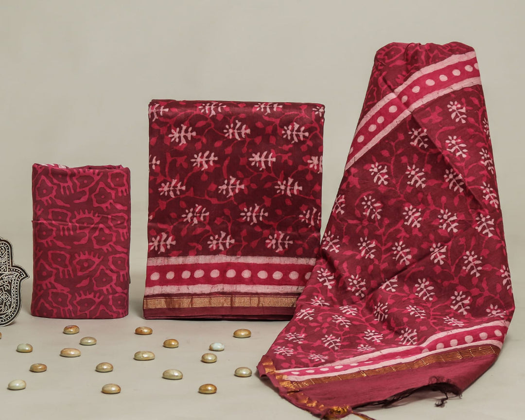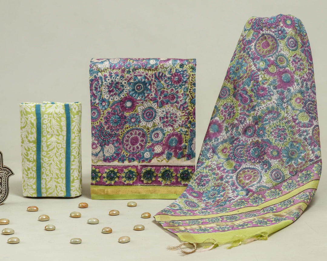 Pure Hand Block Chanderi Silk Unstitched Suit.