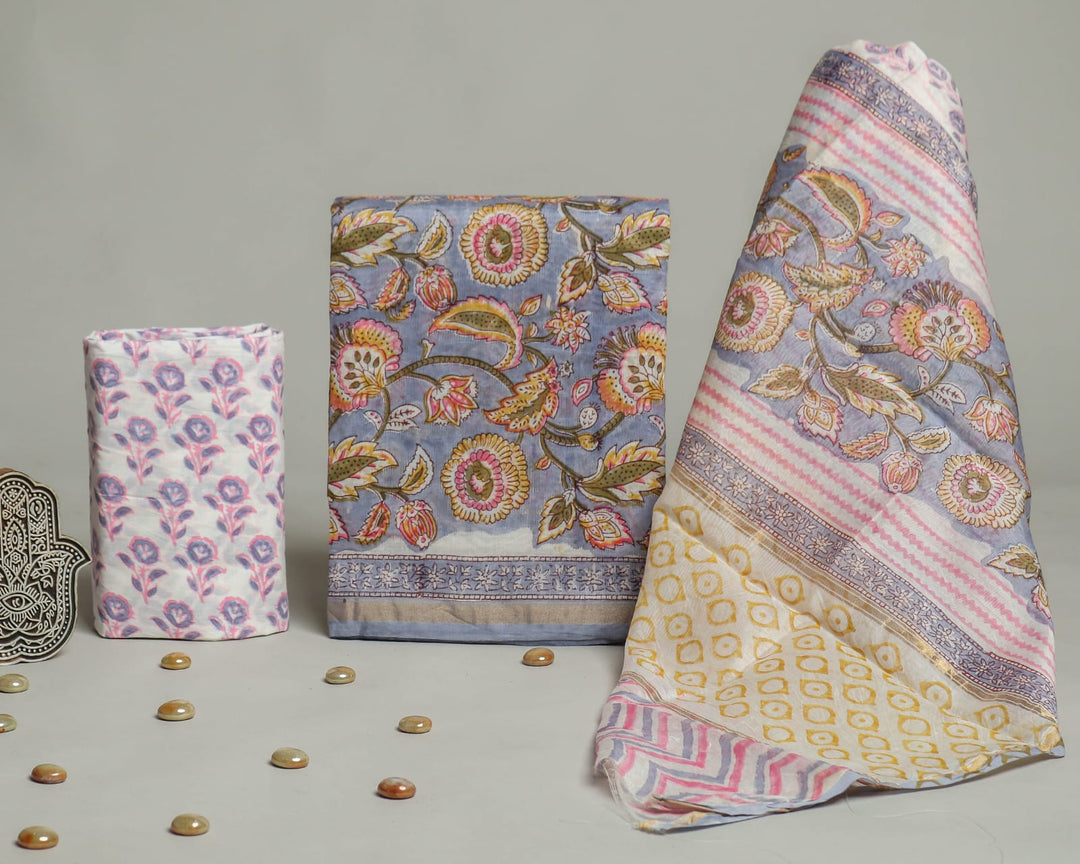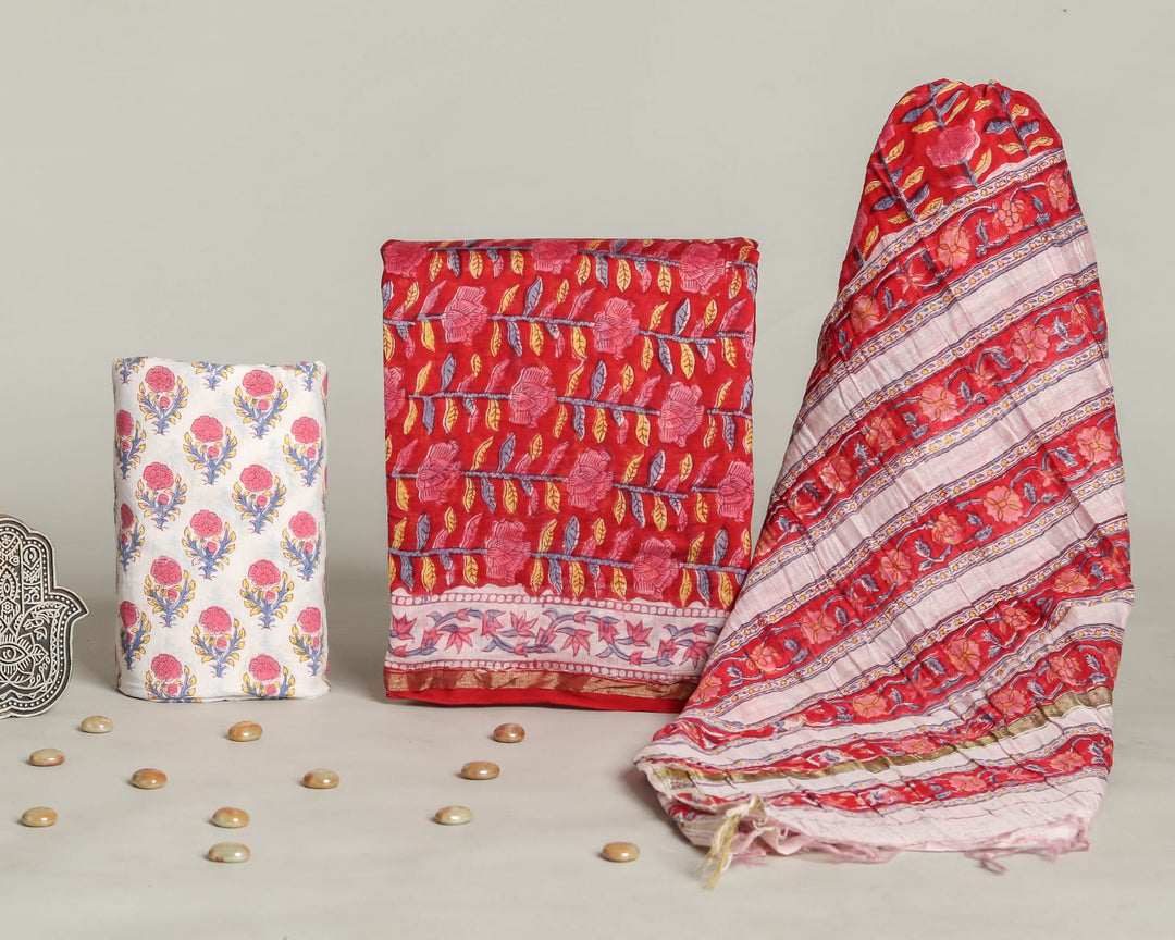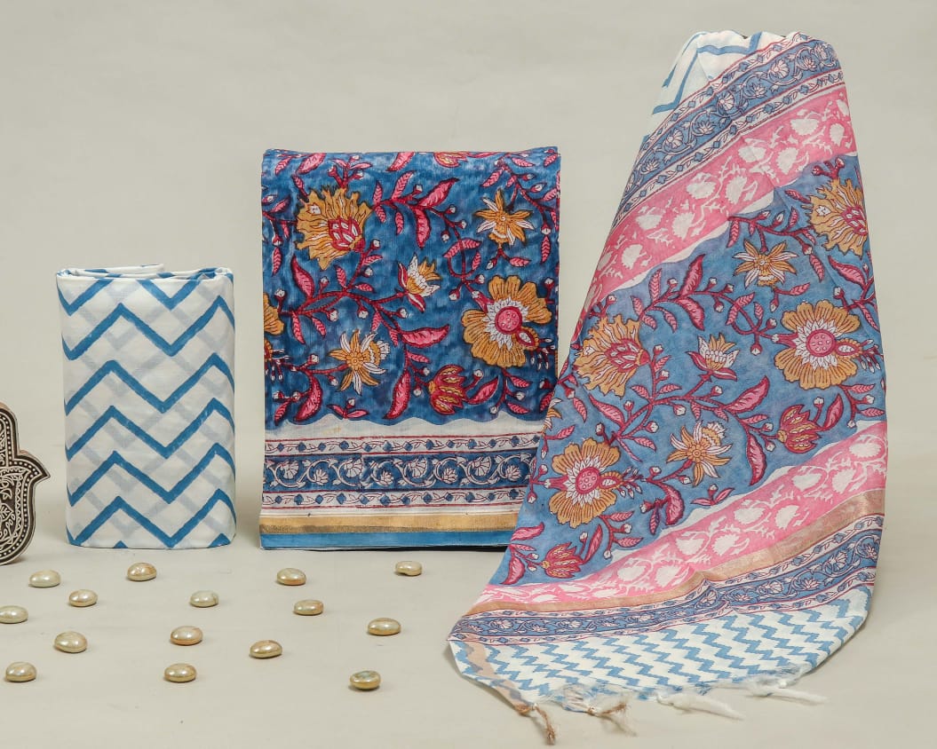 Pure Cotton Hand Block Print Unstitched Suit With Cotton Dupatta .