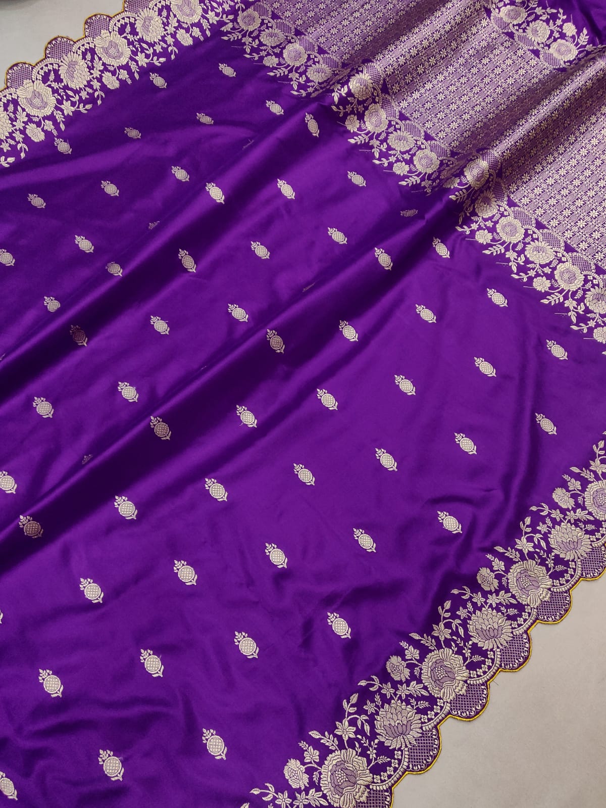 Pure katan silk Handwoven Khadwa work saree This distinguished Banarasi saree is woven entirely from premium katan silk using the traditional kadwa technique. Lustrous gold zari embellishes the fabric in elaborate bootie patterns that blanket the entire surface, creating a luminous, opulent appearance. The saree features a meticulously crafted designer scallop border that frames the weave with refined elegance. Handwoven by master artisans in Varanasi, this exclusive piece represents the pinnacle of classical saree craftsmanship, ideal for discerning collectors and those seeking authentic, investment-worthy heritage textiles.