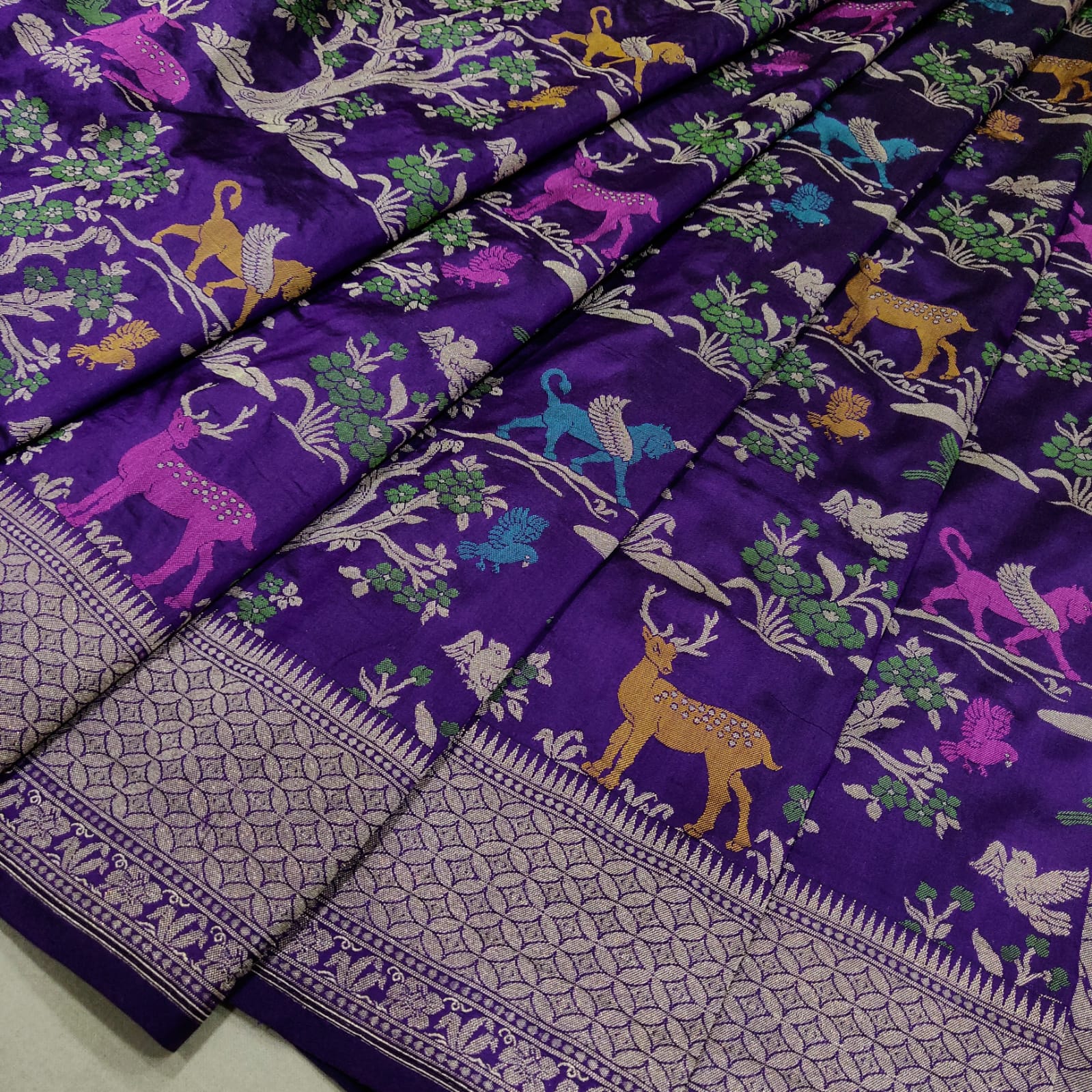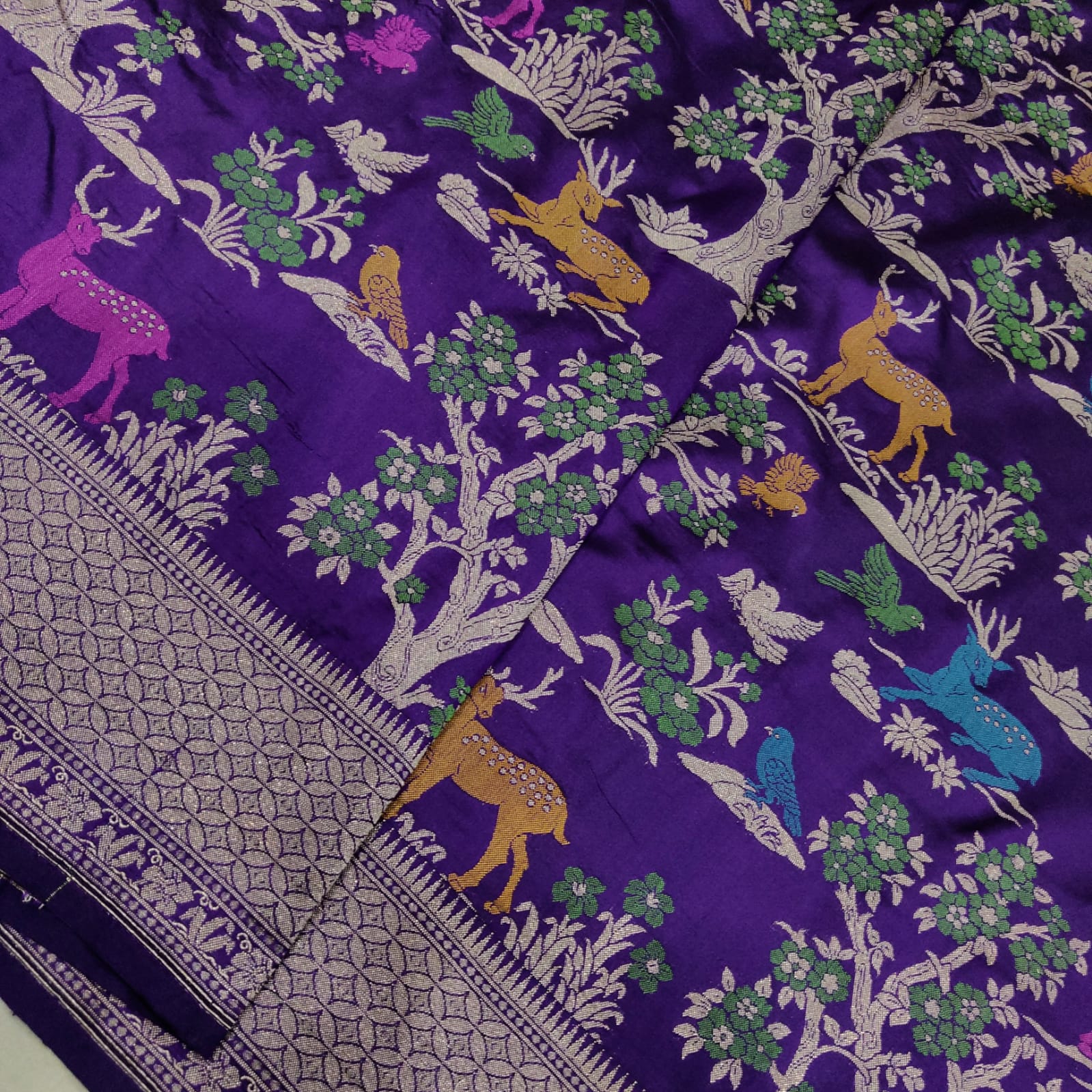 Pure katan silk Handwoven Meenakari work saree Crafted from premium katan silk, this exclusive Banarasi saree showcases masterful meenakari embroidery across its expanse. Intricate resham threadwork depicts vibrant birds, animals, and floral motifs in multicolor hues, creating a narrative of traditional artistry. The saree is adorned with a richly embellished gold zari border and a designer pallu weave that exemplifies the finest weaving techniques of Varanasi. Each piece is handwoven with meticulous attention to detail, making it a collector's treasure for those who appreciate authentic heritage textiles and timeless elegance.