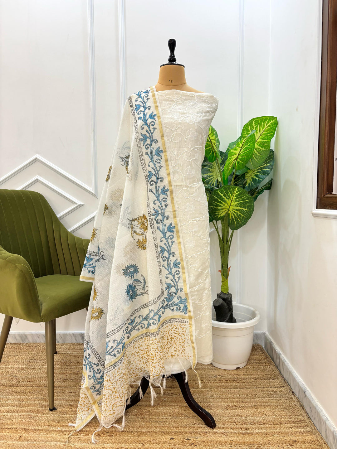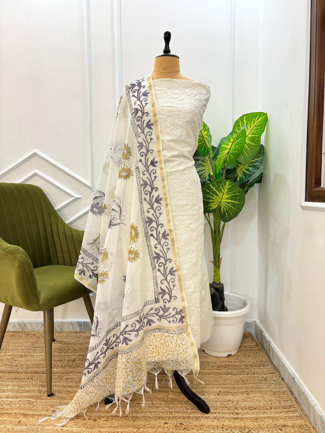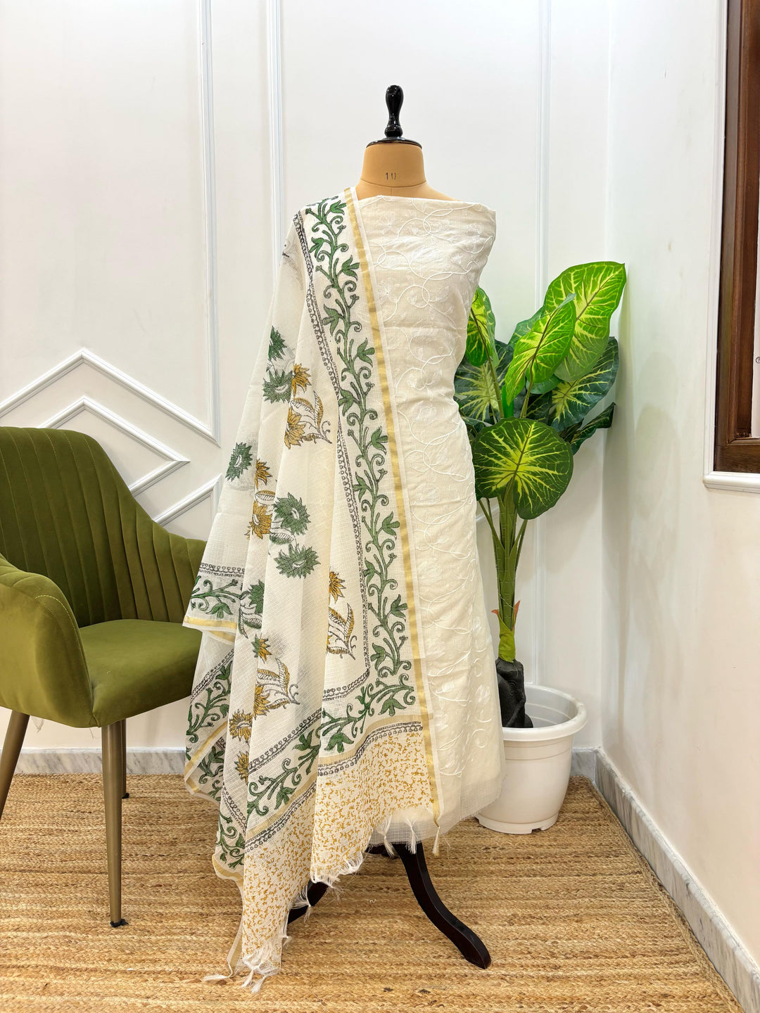 Banarasi Kota Embroidery Unstitched Suit With Kota Hand Block Print Dupatta.