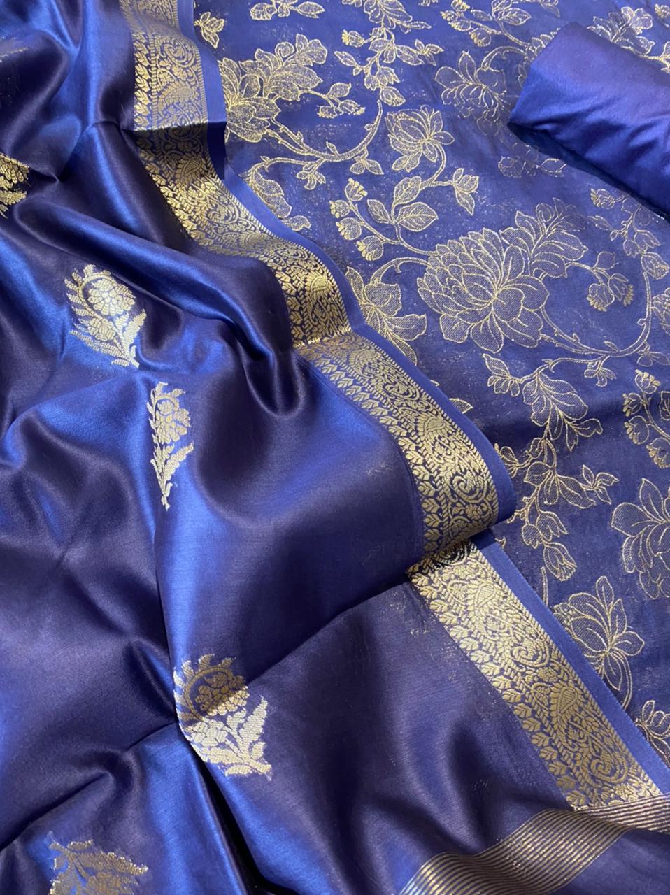 Pure Banarsi Silk Chanderi Light Zari Weaved Unstitched Suit With Banarsi Silk Buti Weaved Dupatta.